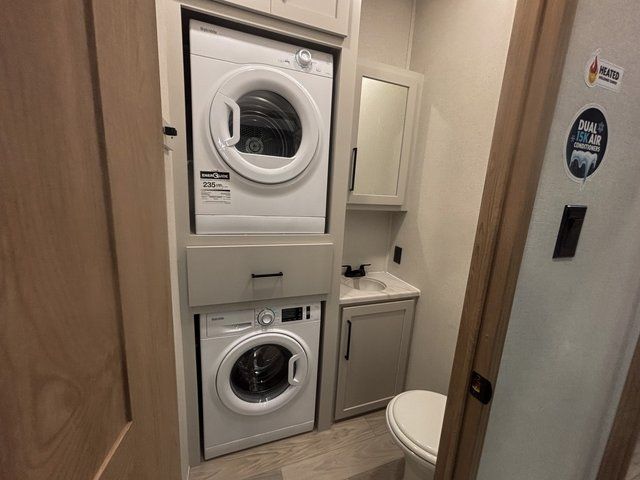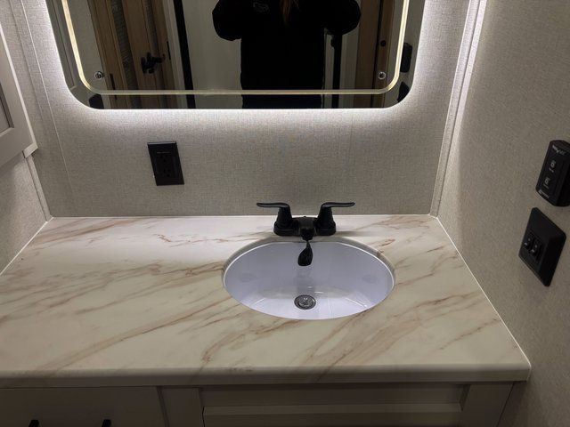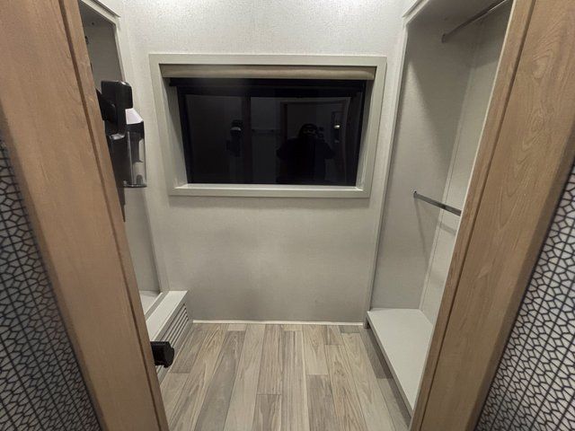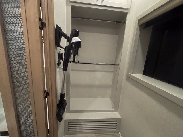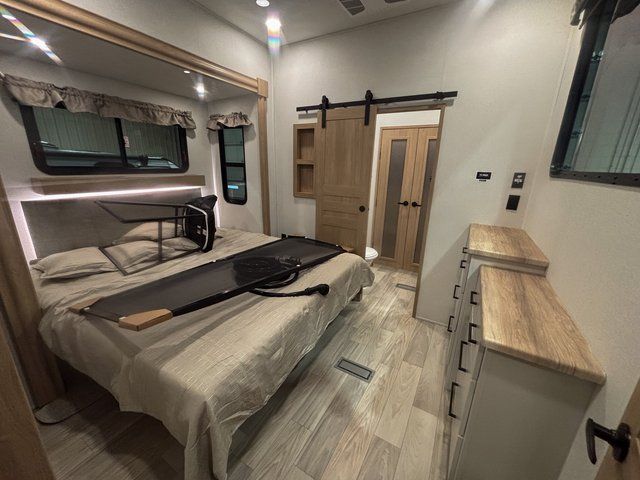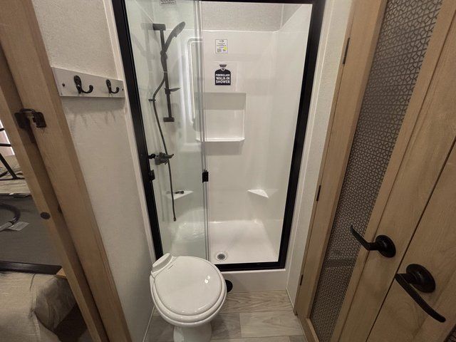 Start every morning in a private master bedroom featuring a king bed slide-out, dual nightstands, and a dresser that keeps everything organized. Just steps away, the spacious front bathroom includes a large walk-in closet, giving you the storage and convenience you’d expect at home.