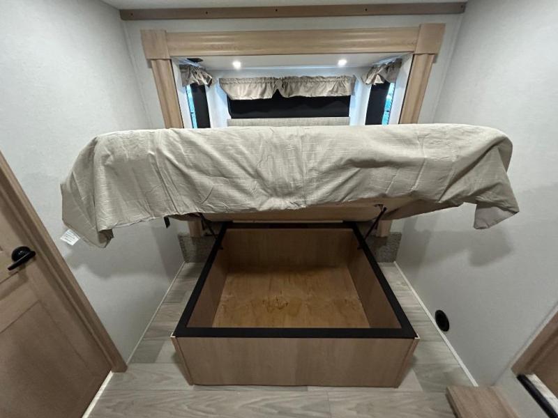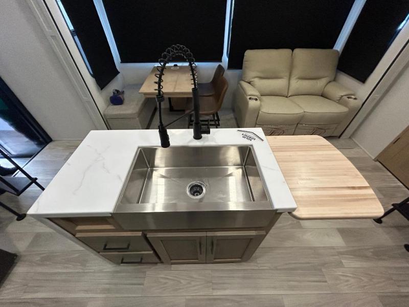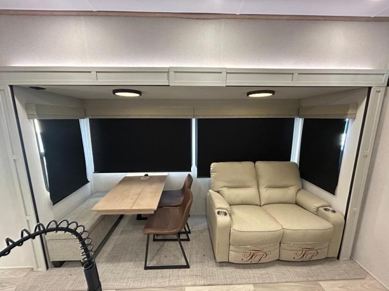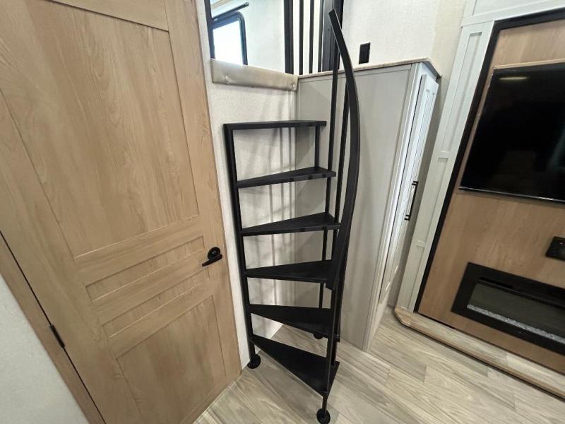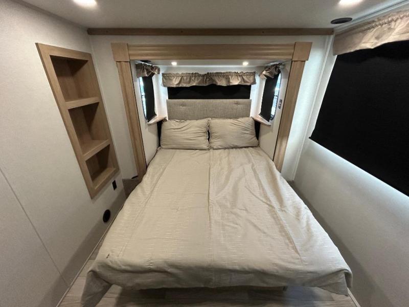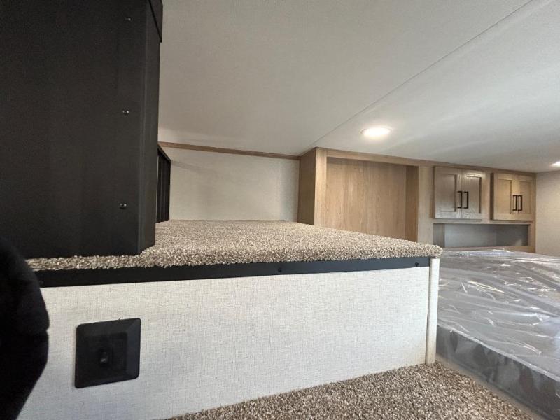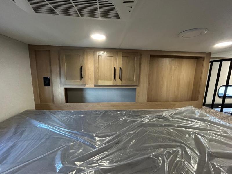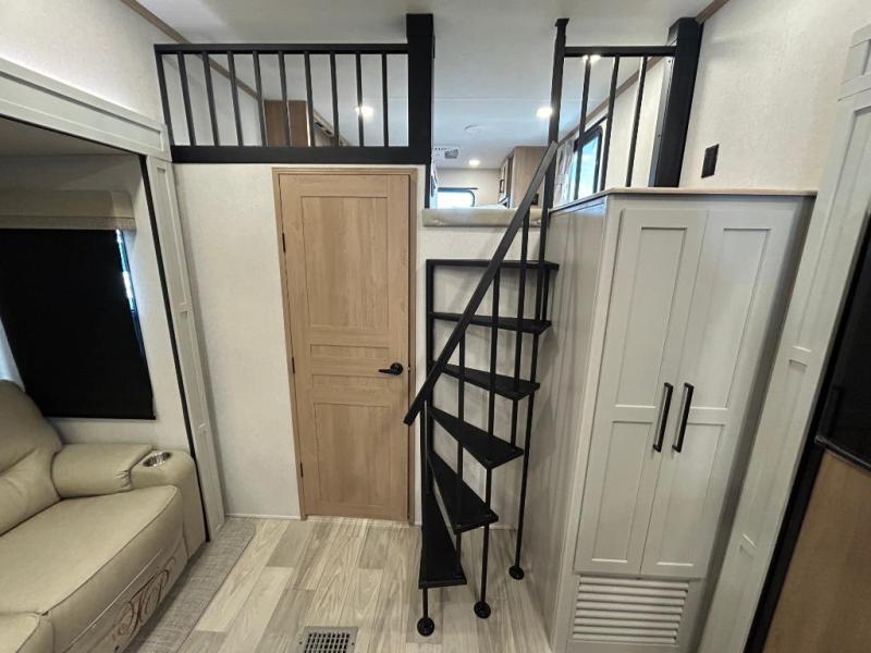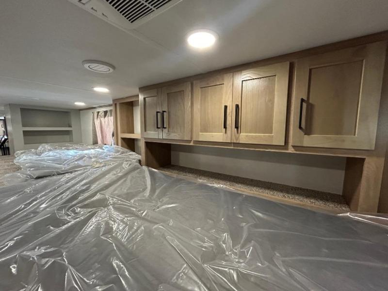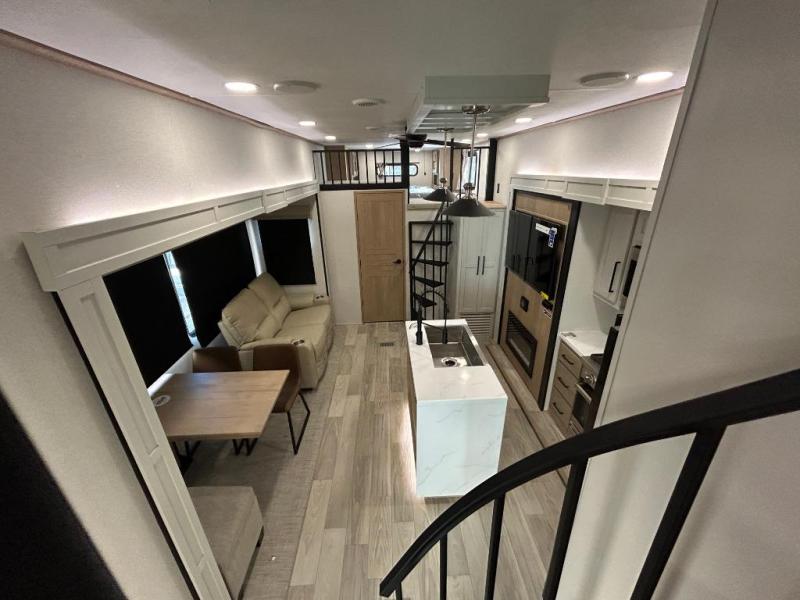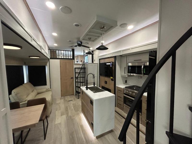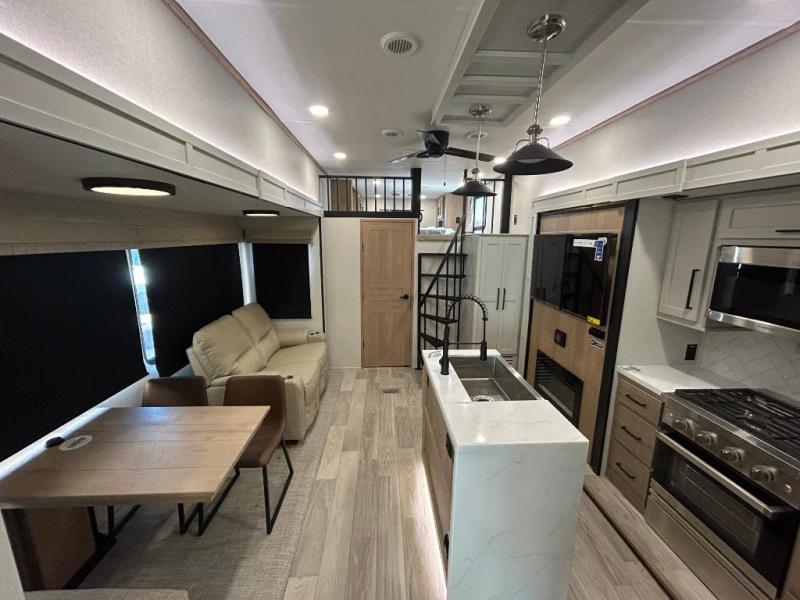 You won't believe the comfort and convenience found in this destination trailer. There are two private bedrooms; one up front with a queen bed slide out and storage space, and one in back with a queen bed slide out and a half bath! There is even washer and dryer prep here if you want to add those appliances and the second entry door is also found in this location so you can easily slip out in the morning. Above each of these rooms is a loft providing three total bunk mats for sleeping, storage cabinets, and TV prep if you want to add entertainment. Everyone can meet in the combined kitchen and living room that includes dual opposing slides, a 60" theater seating across from a 50" flat screen TV and fireplace, plus a free-standing table with chairs and a bench to dine at. The chef of your group will love the large kitchen island, Chef Collection three burner range, and a 16.2 cu. ft. refrigerator for food storage.