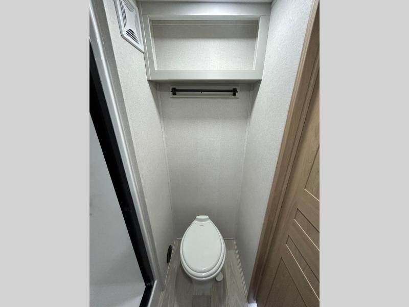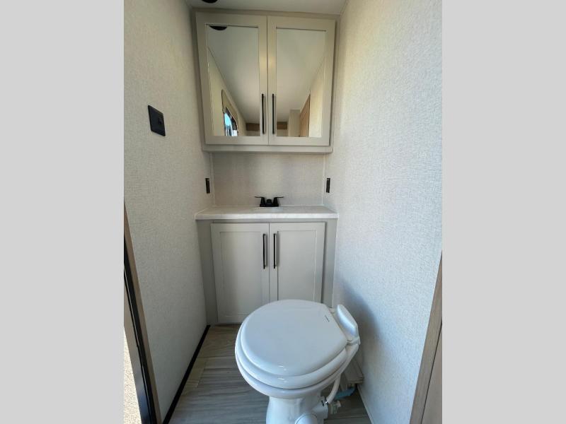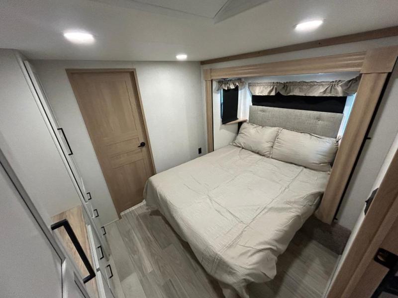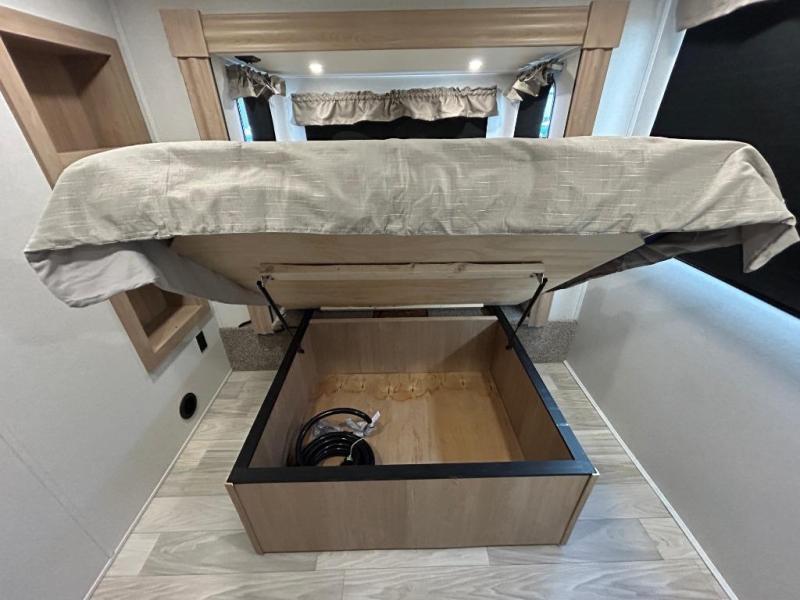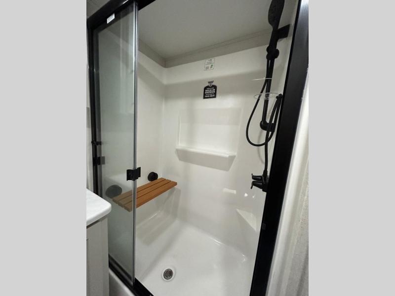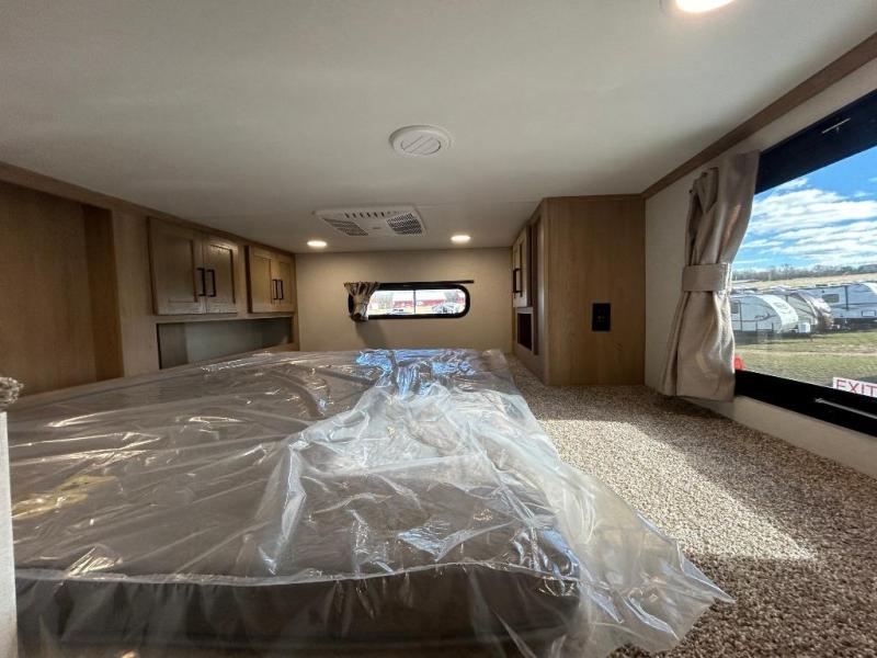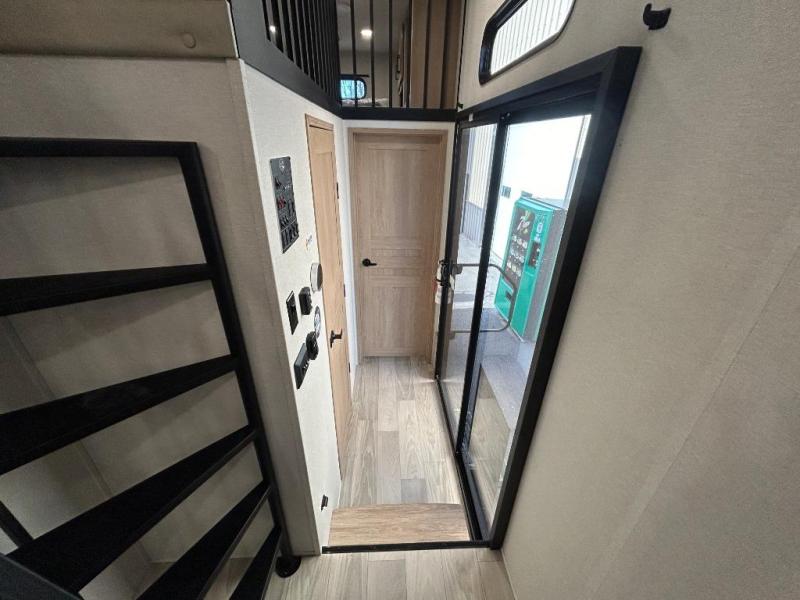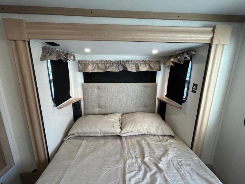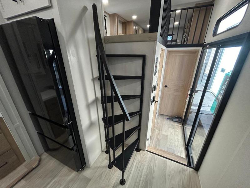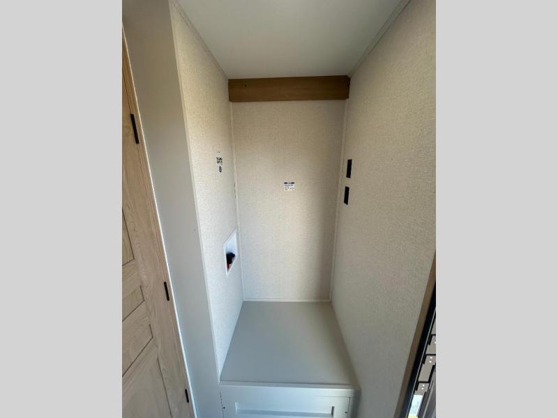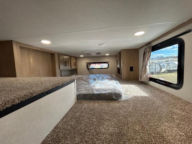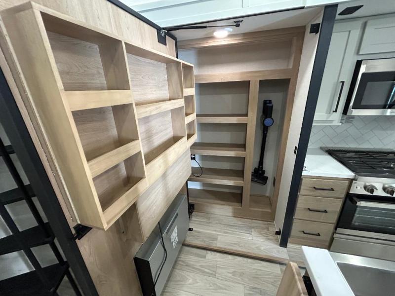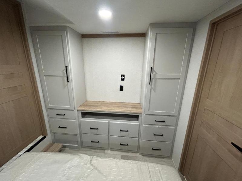 You won't believe the comfort and convenience found in this destination trailer. There are two private bedrooms; one up front with a queen bed slide out and storage space, and one in back with a queen bed slide out and a half bath! There is even washer and dryer prep here if you want to add those appliances and the second entry door is also found in this location so you can easily slip out in the morning. Above each of these rooms is a loft providing three total bunk mats for sleeping, storage cabinets, and TV prep if you want to add entertainment. Everyone can meet in the combined kitchen and living room that includes dual opposing slides, a 60" theater seating across from a 50" flat screen TV and fireplace, plus a free-standing table with chairs and a bench to dine at. The chef of your group will love the large kitchen island, Chef Collection three burner range, and a 16.2 cu. ft. refrigerator for food storage.