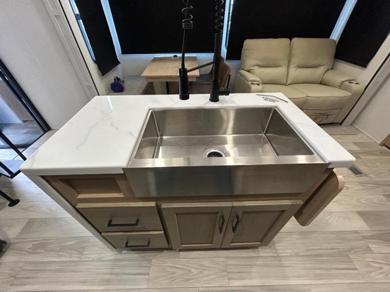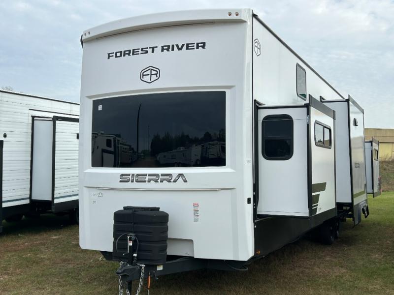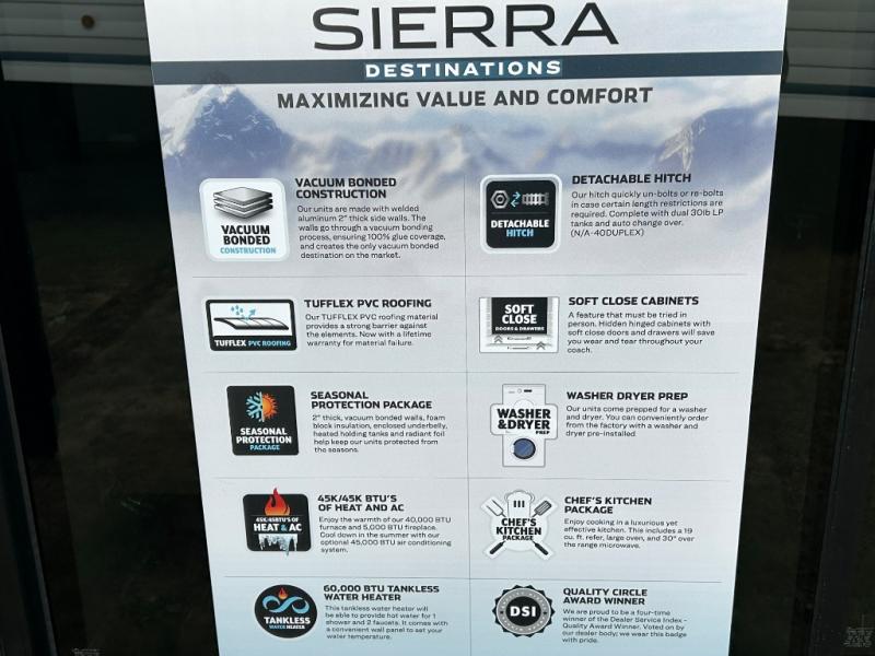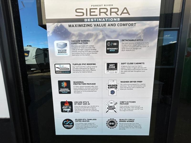 With each Sierra Destination Trailer by Forest River you will enjoy many luxurious features, such as crown molding over the kitchen cabinets, solid surface kitchen countertops, a memory foam mattress, plus so much more. The extra large picture windows throughout let natural light in and provide beautiful outdoor views, and each model includes three or more slides for added interior space. You'll find many exterior conveniences, like the porch light with an interior switch, the rain gutters with extra long drip spouts to prevent black streaking, and an electric awning with LED light strip, plus more! You will stay comfortable year around with dual 15,000 A/C units plus each model is constructed with an Underbelly Armor for better protection and insulation!