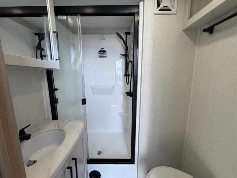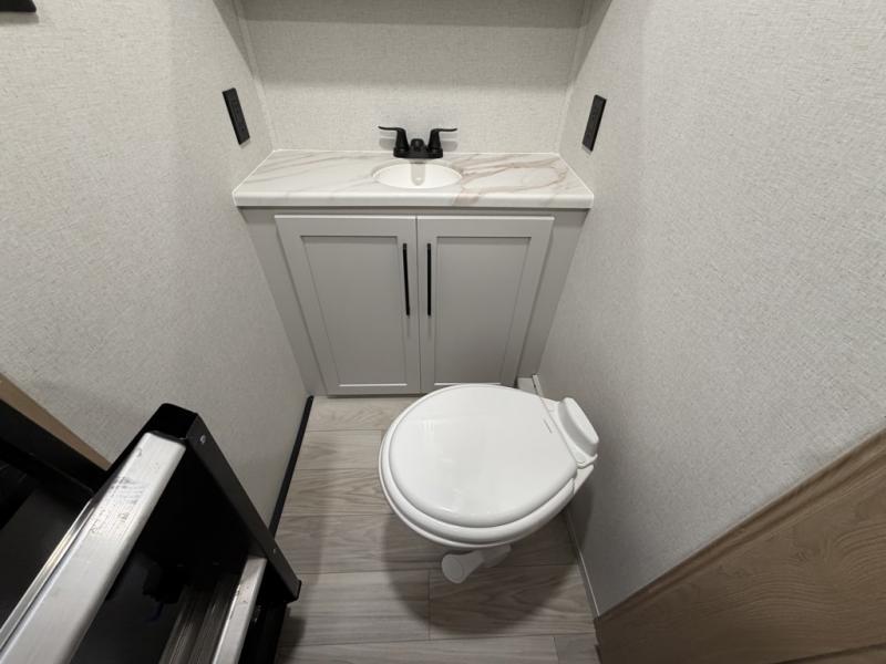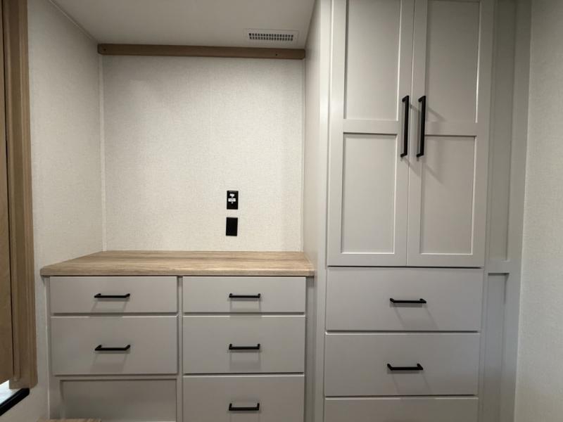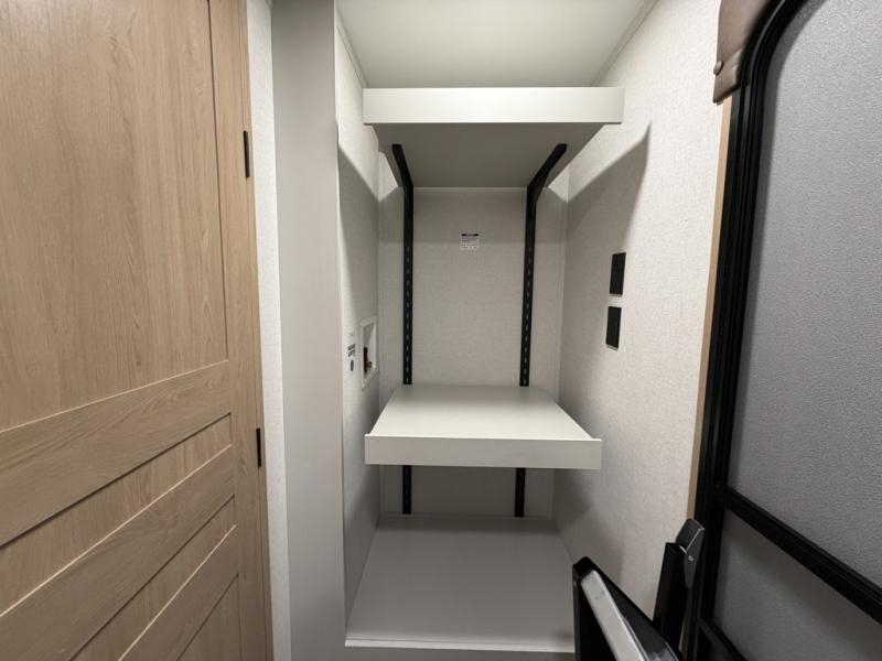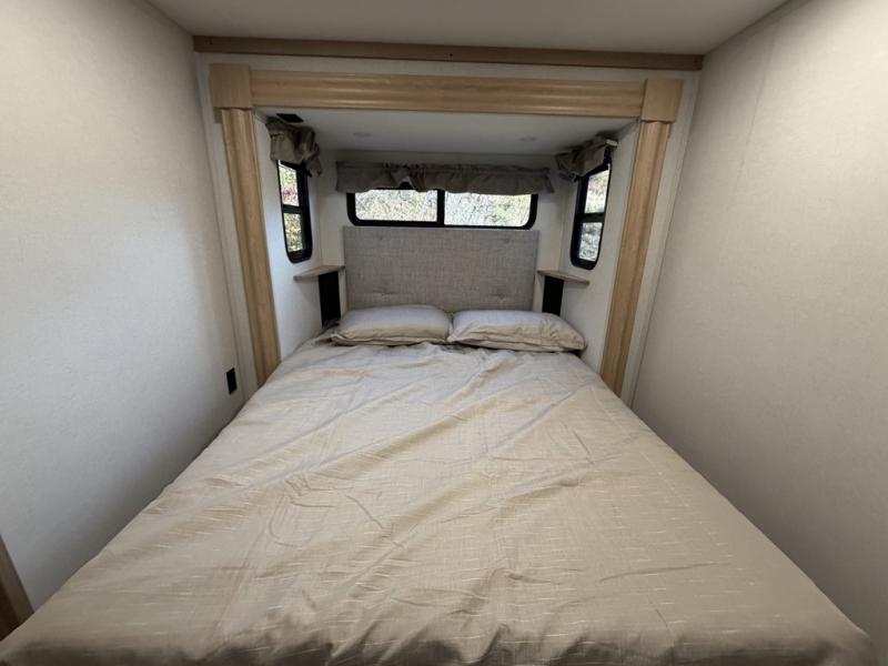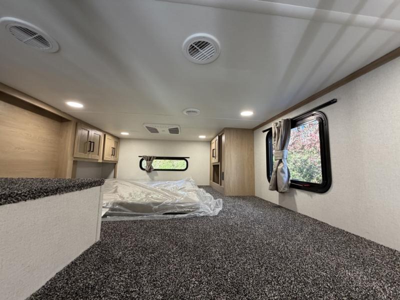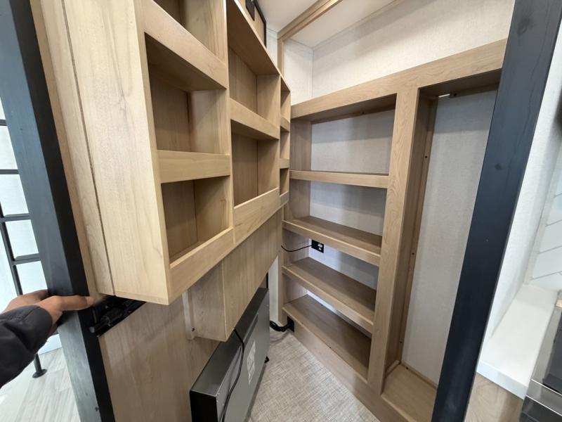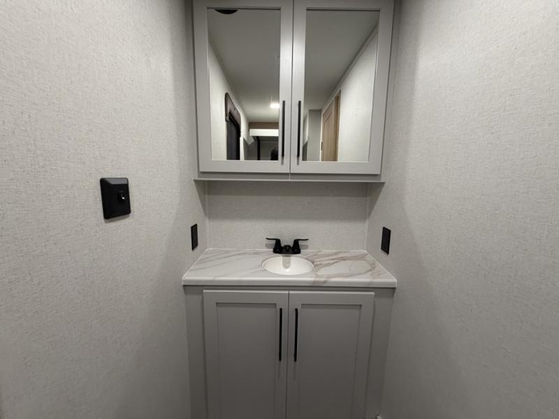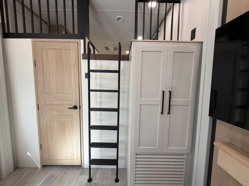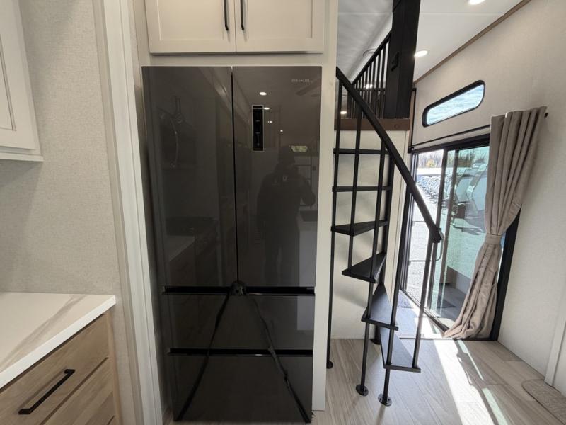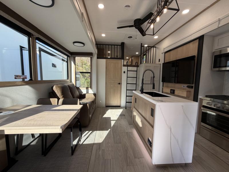 You won't believe the comfort and convenience found in this destination trailer. There are two private bedrooms; one up front with a queen bed slide out and storage space, and one in back with a queen bed slide out and a half bath! There is even washer and dryer prep here if you want to add those appliances and the second entry door is also found in this location so you can easily slip out in the morning. Above each of these rooms is a loft providing three total bunk mats for sleeping, storage cabinets, and TV prep if you want to add entertainment. Everyone can meet in the combined kitchen and living room that includes dual opposing slides, a 60" theater seating across from a 50" flat screen TV and fireplace, plus a free-standing table with chairs and a bench to dine at. The chef of your group will love the large kitchen island, Chef Collection three burner range, and a 16.2 cu. ft. refrigerator for food storage.