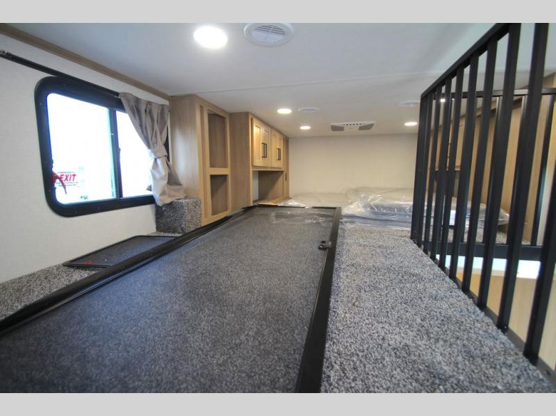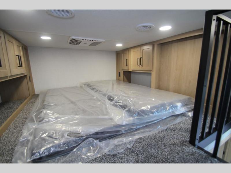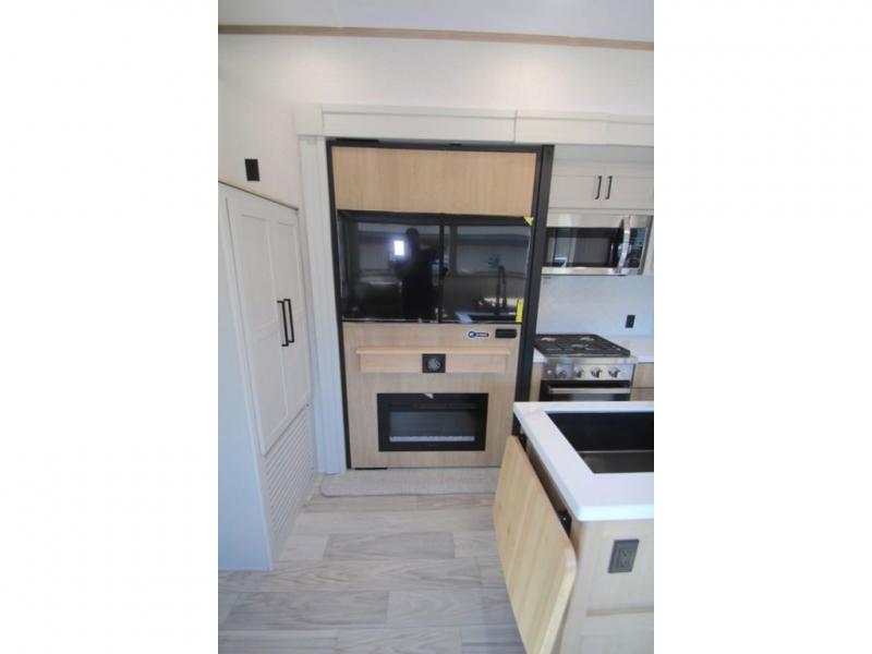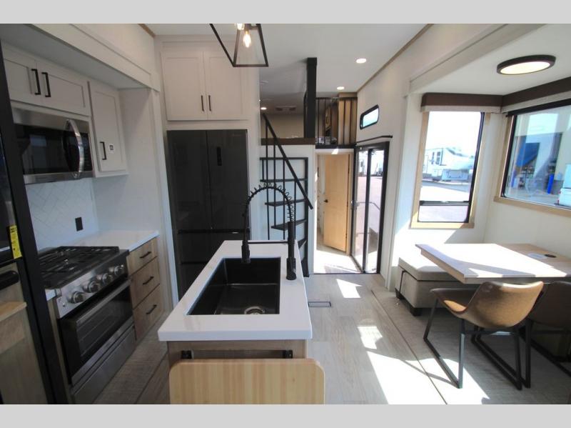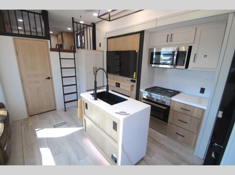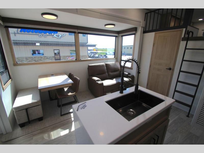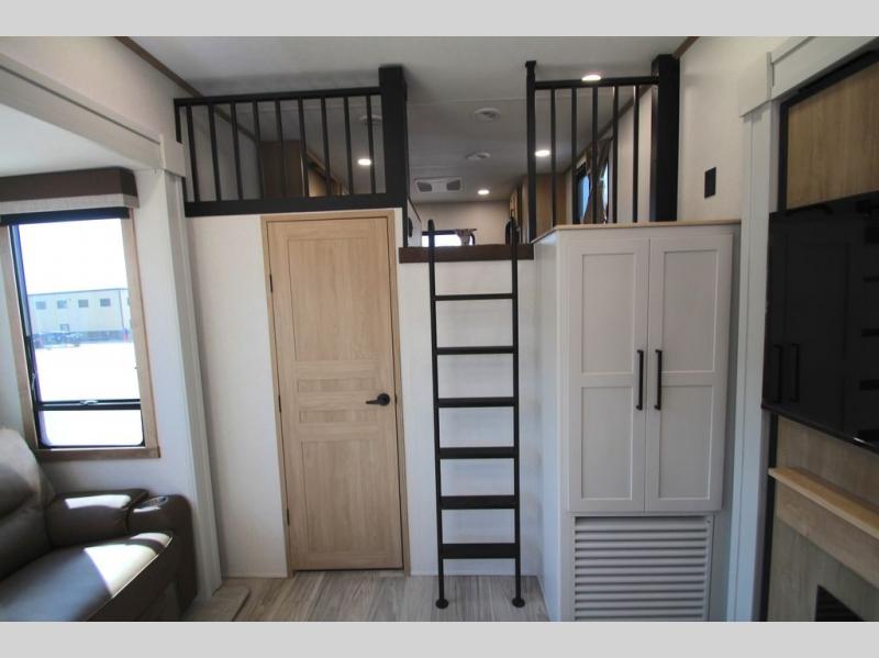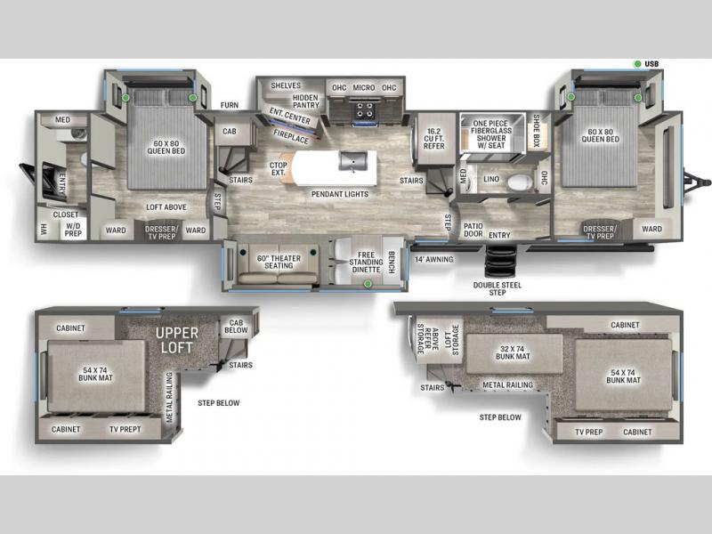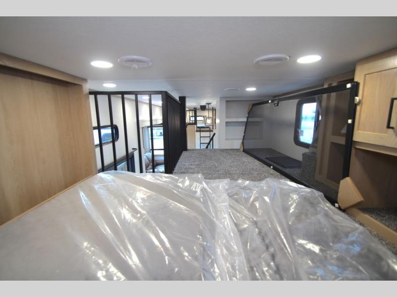 You won't believe the comfort and convenience found in this destination trailer. There are two private bedrooms; one up front with a queen bed slide out and storage space, and one in back with a queen bed slide out and a half bath! There is even washer and dryer prep here if you want to add those appliances and the second entry door is also found in this location so you can easily slip out in the morning. Above each of these rooms is a loft providing three total bunk mats for sleeping, storage cabinets, and TV prep if you want to add entertainment. Everyone can meet in the combined kitchen and living room that includes dual opposing slides, a 60" theater seating across from a 50" flat screen TV and fireplace, plus a free-standing table with chairs and a bench to dine at. The chef of your group will love the large kitchen island, Chef Collection three burner range, and a 16.2 cu. ft. refrigerator for food storage.