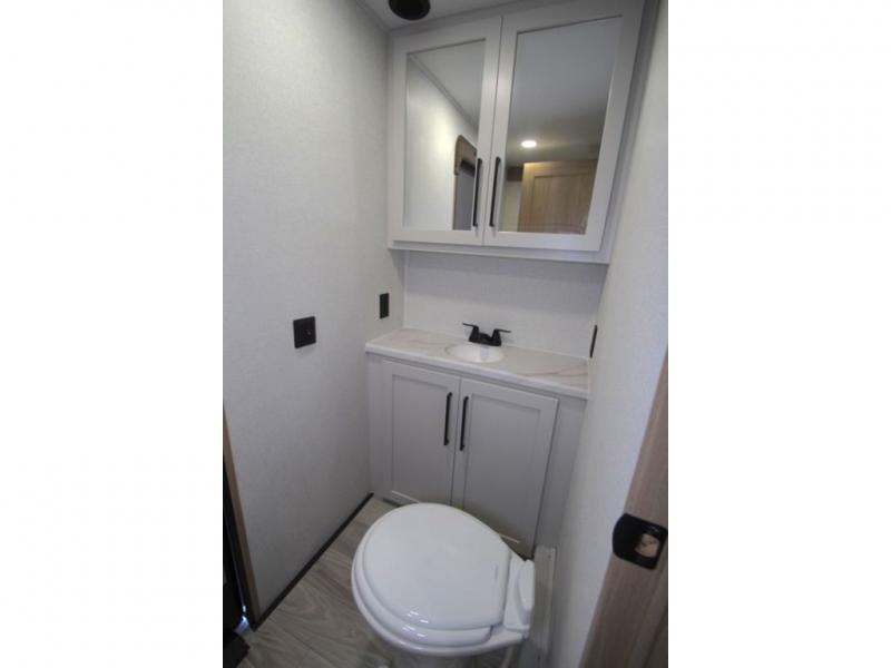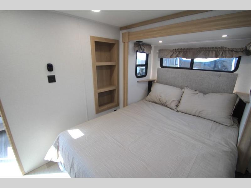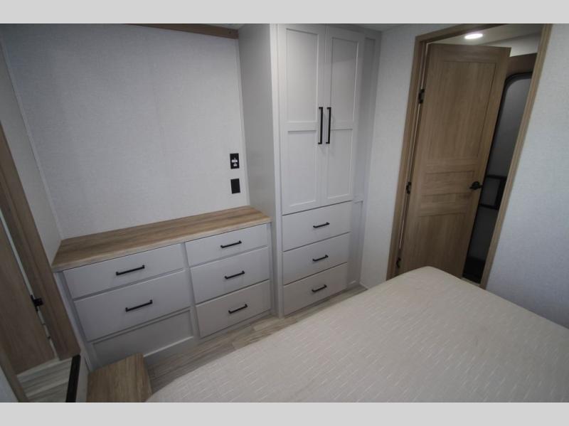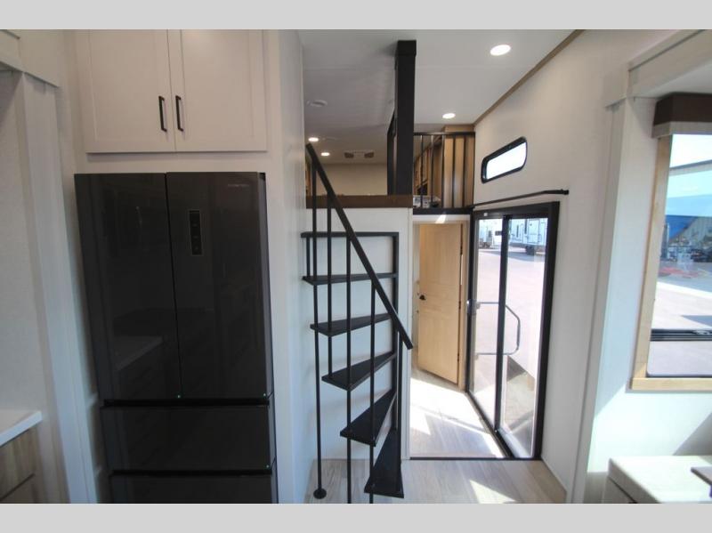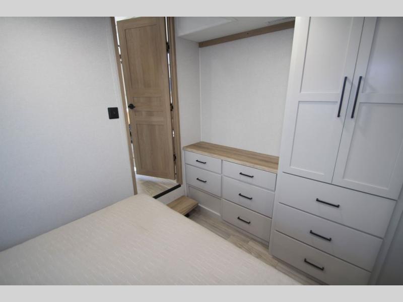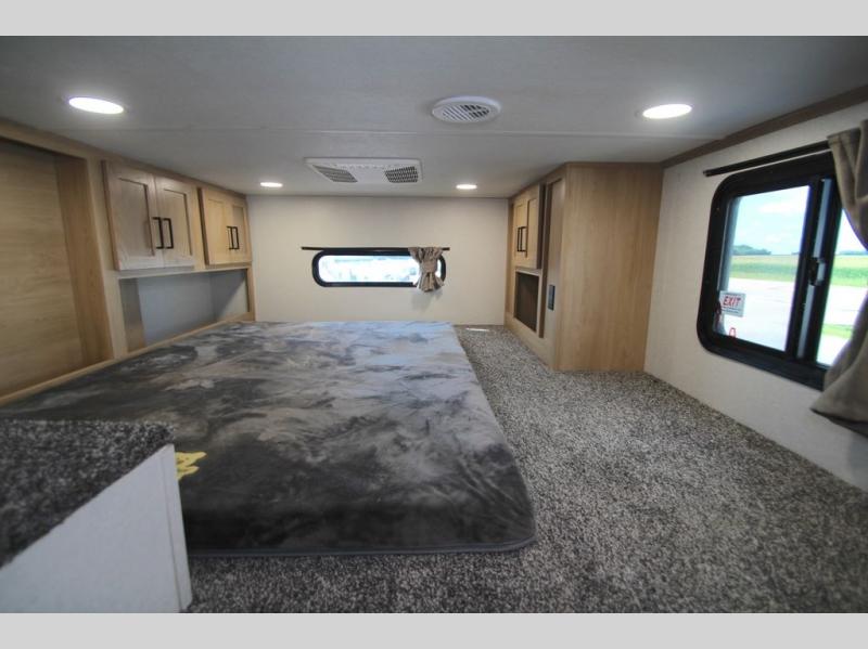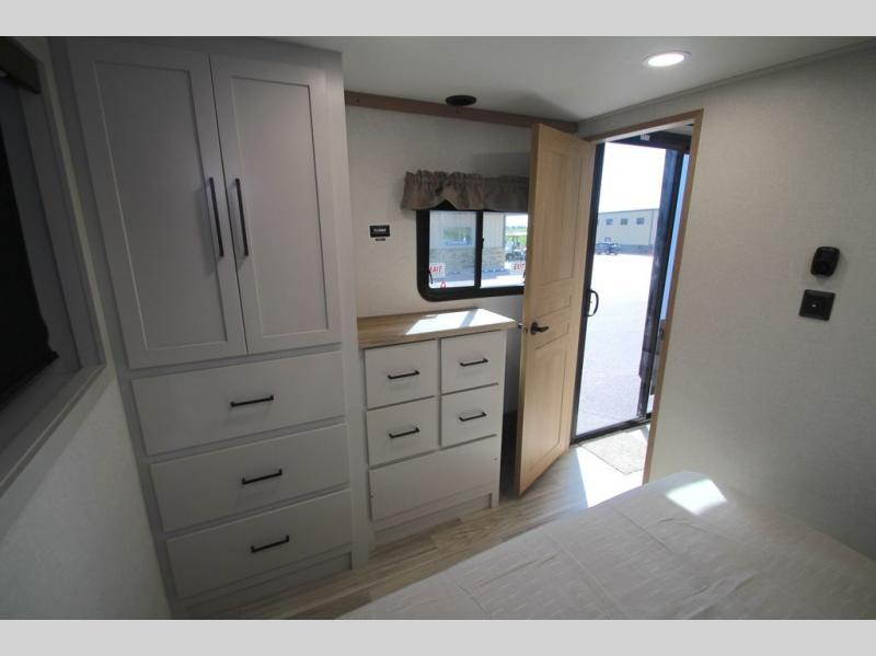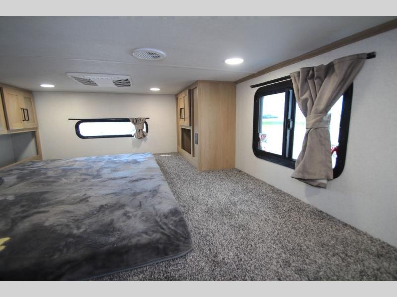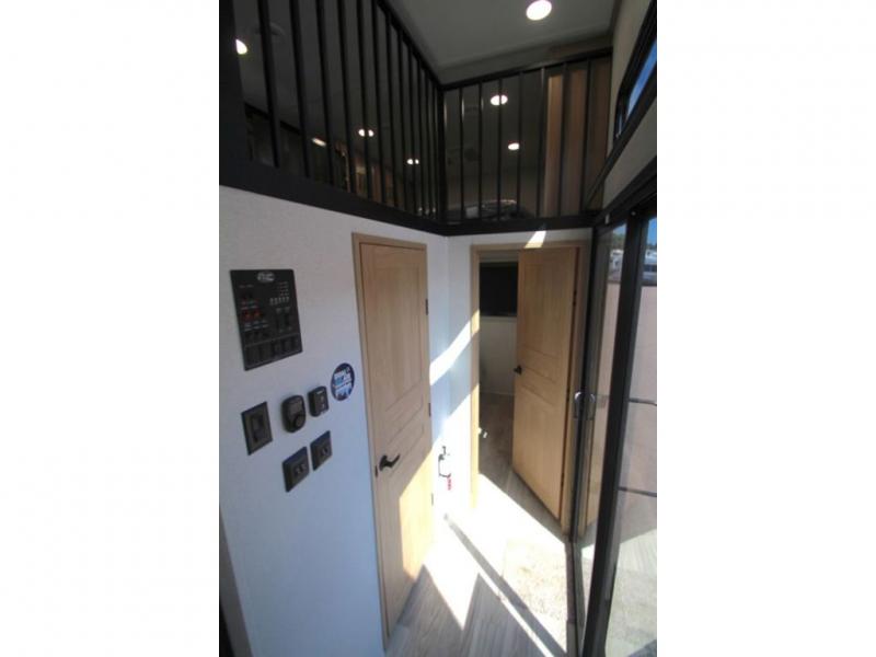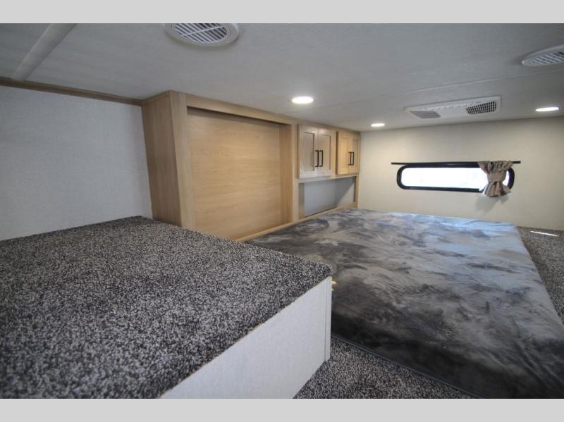 You won't believe the comfort and convenience found in this destination trailer. There are two private bedrooms; one up front with a queen bed slide out and storage space, and one in back with a queen bed slide out and a half bath! There is even washer and dryer prep here if you want to add those appliances and the second entry door is also found in this location so you can easily slip out in the morning. Above each of these rooms is a loft providing three total bunk mats for sleeping, storage cabinets, and TV prep if you want to add entertainment. Everyone can meet in the combined kitchen and living room that includes dual opposing slides, a 60" theater seating across from a 50" flat screen TV and fireplace, plus a free-standing table with chairs and a bench to dine at. The chef of your group will love the large kitchen island, Chef Collection three burner range, and a 16.2 cu. ft. refrigerator for food storage.