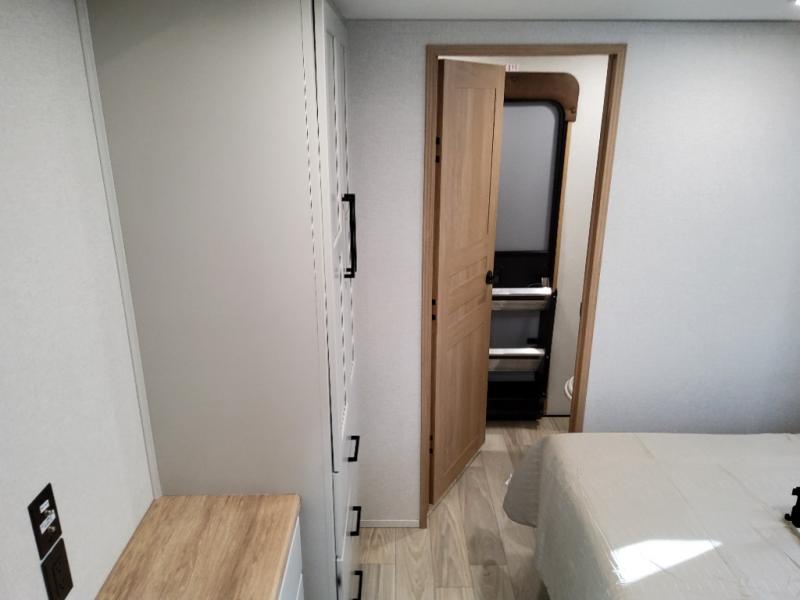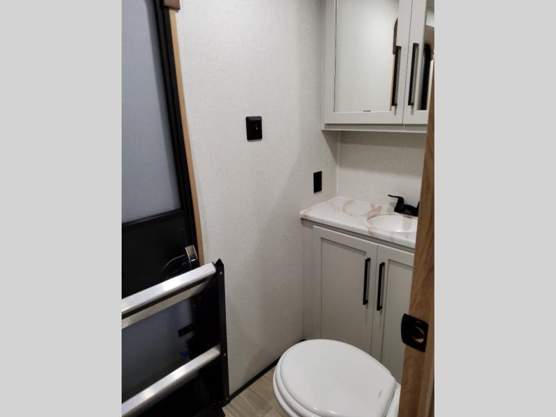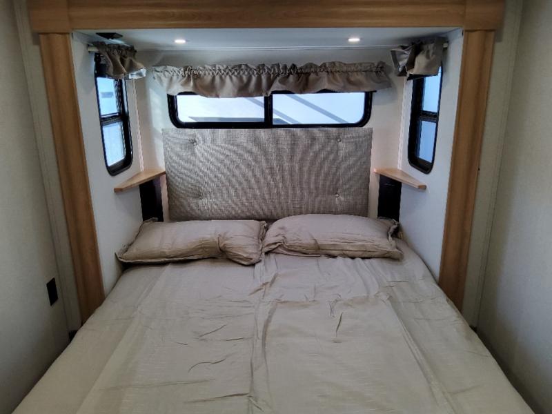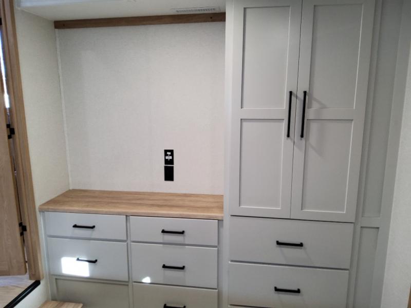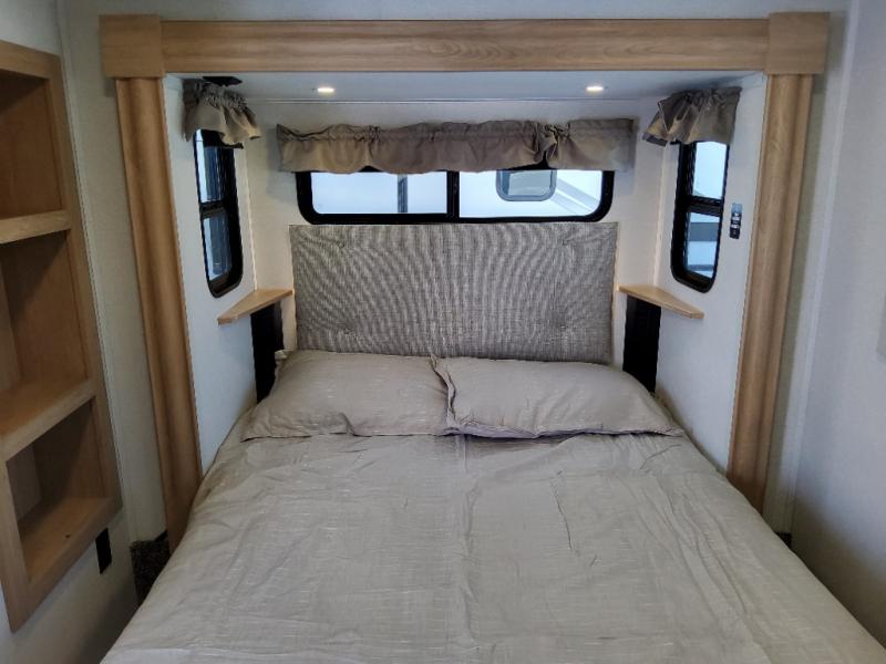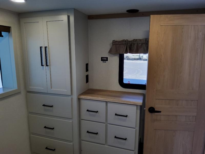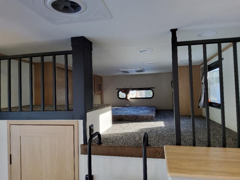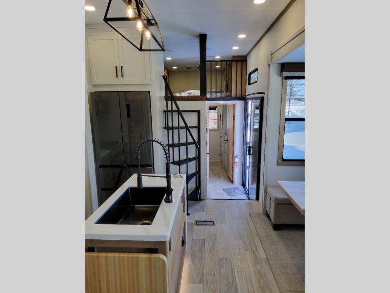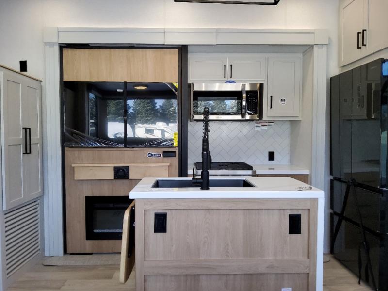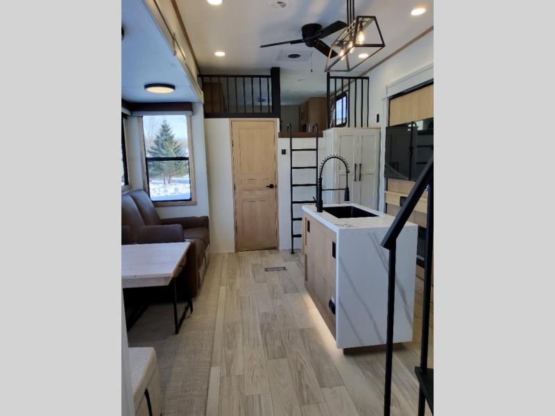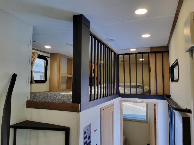 You won't believe the comfort and convenience found in this destination trailer. There are two private bedrooms; one up front with a queen bed slide out and storage space, and one in back with a queen bed slide out and a half bath! There is even washer and dryer prep here if you want to add those appliances and the second entry door is also found in this location so you can easily slip out in the morning. Above each of these rooms is a loft providing three total bunk mats for sleeping, storage cabinets, and TV prep if you want to add entertainment. Everyone can meet in the combined kitchen and living room that includes dual opposing slides, a 60" theater seating across from a 50" flat screen TV and fireplace, plus a free-standing table with chairs and a bench to dine at. The chef of your group will love the large kitchen island, Chef Collection three burner range, and a 16.2 cu. ft. refrigerator for food storage.