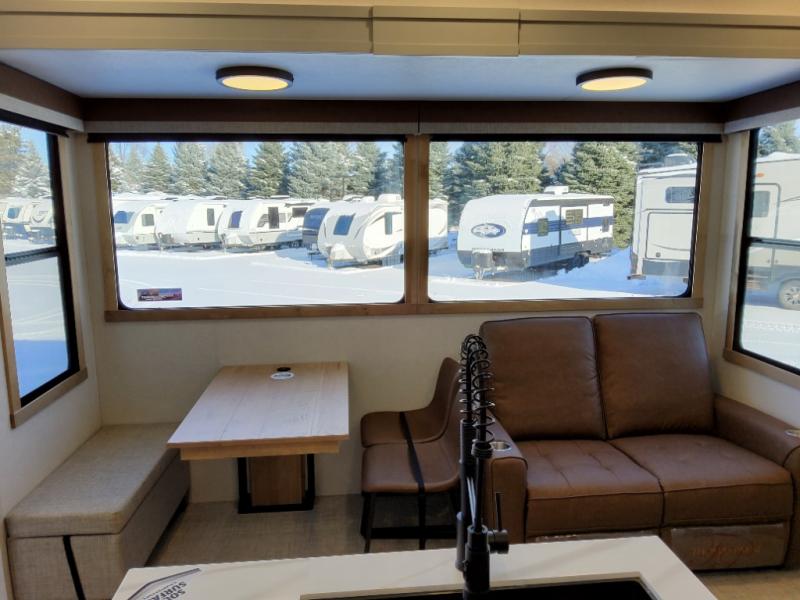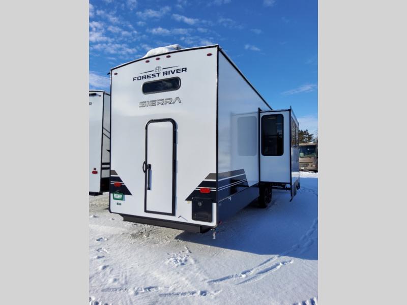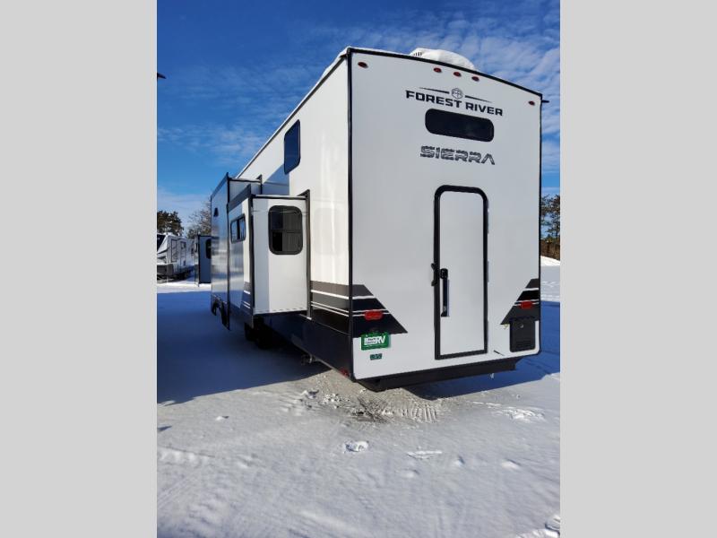 With each Sierra Destination Trailer by Forest River you will enjoy many luxurious features, such as crown molding over the kitchen cabinets, solid surface kitchen countertops, a memory foam mattress, plus so much more. The extra large picture windows throughout let natural light in and provide beautiful outdoor views, and each model includes three or more slides for added interior space. You'll find many exterior conveniences, like the porch light with an interior switch, the rain gutters with extra long drip spouts to prevent black streaking, and an electric awning with LED light strip, plus more! You will stay comfortable year around with dual 15,000 A/C units plus each model is constructed with an Underbelly Armor for better protection and insulation!