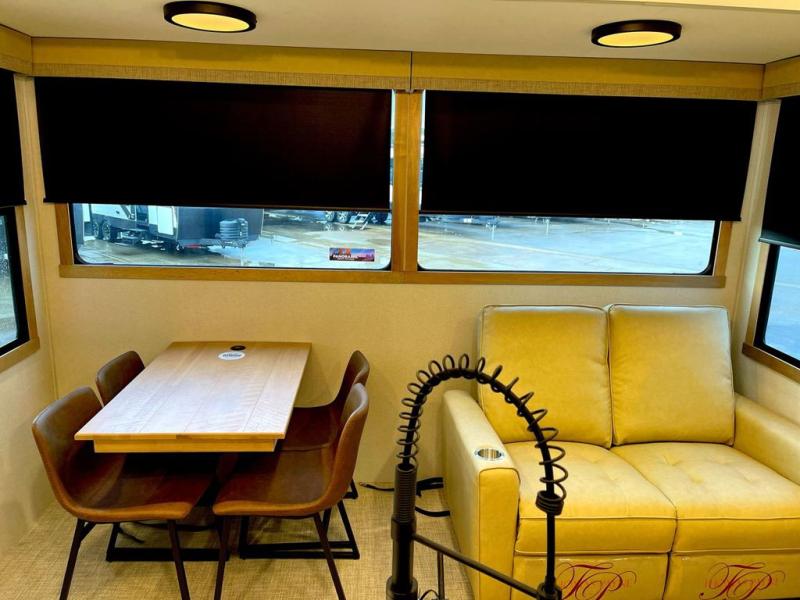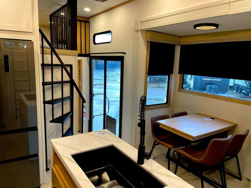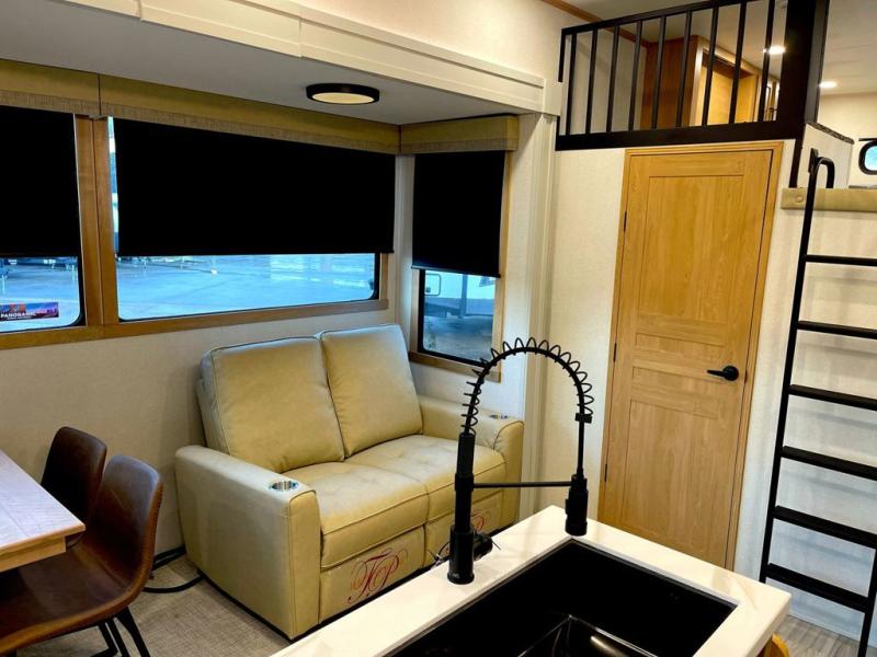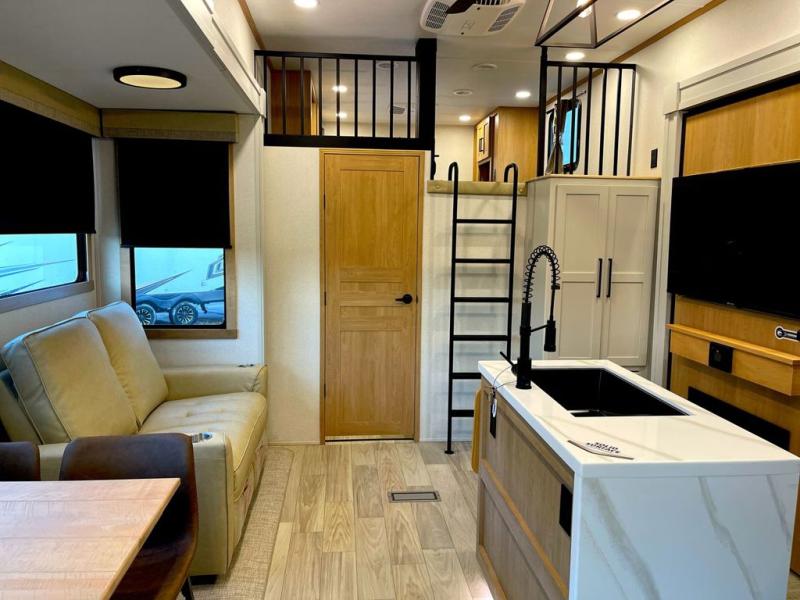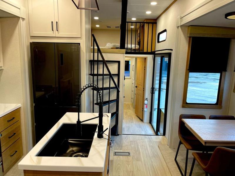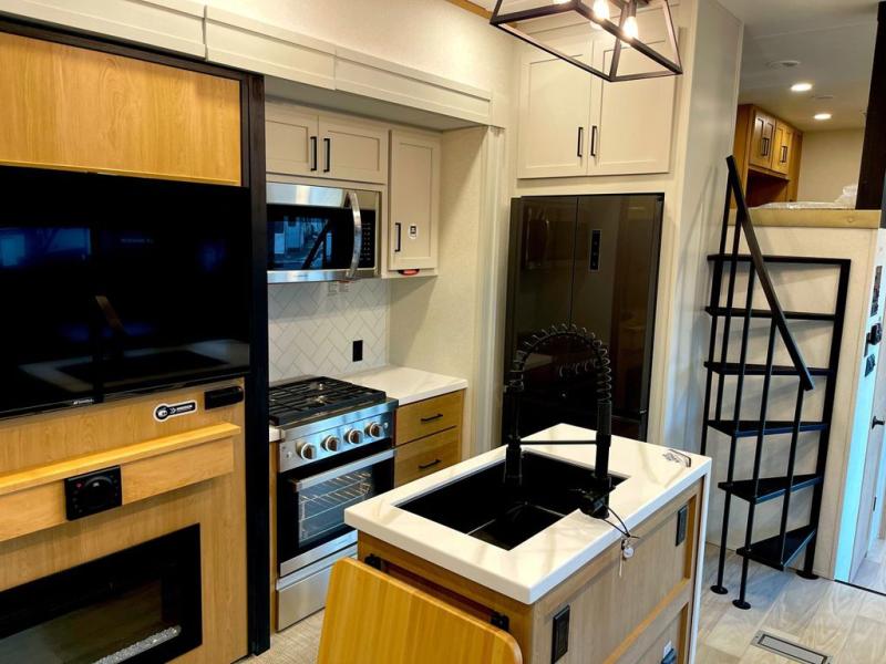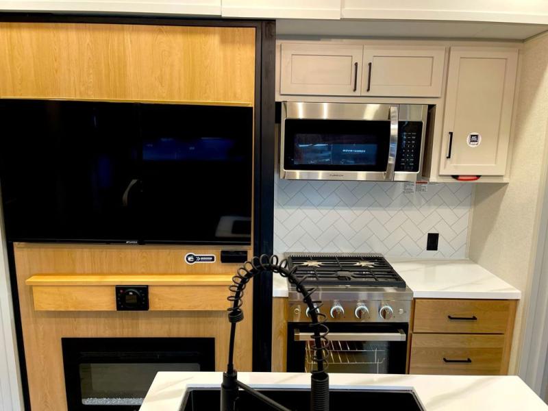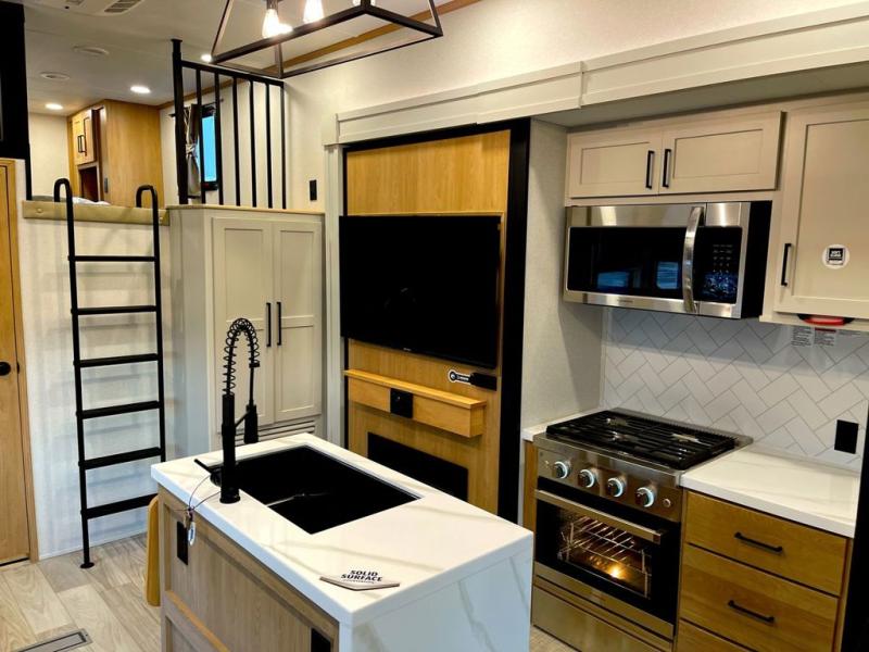 You won't believe the comfort and convenience found in this destination trailer. There are two private bedrooms; one up front with a queen bed slide out and storage space, and one in back with a queen bed slide out and a half bath! There is even washer and dryer prep here if you want to add those appliances and the second entry door is also found in this location so you can easily slip out in the morning. Above each of these rooms is a loft providing three total bunk mats for sleeping, storage cabinets, and TV prep if you want to add entertainment. Everyone can meet in the combined kitchen and living room that includes dual opposing slides, a 60" theater seating across from a 50" flat screen TV and fireplace, plus a free-standing table with chairs and a bench to dine at. The chef of your group will love the large kitchen island, Chef Collection three burner range, and a 16.2 cu. ft. refrigerator for food storage.