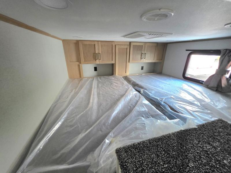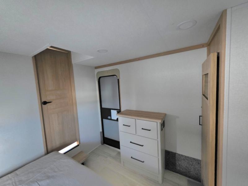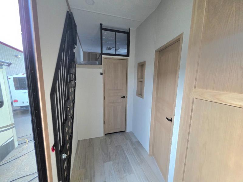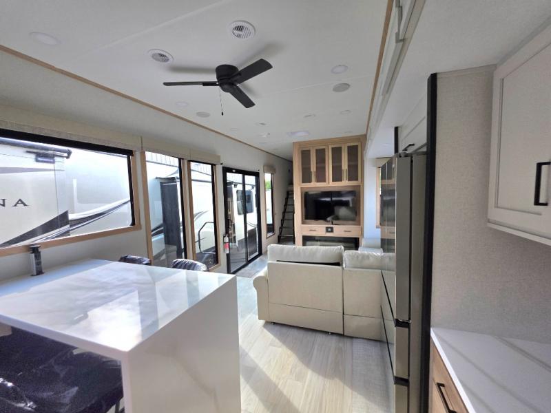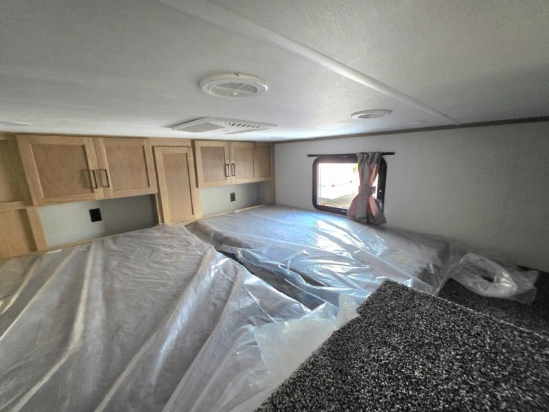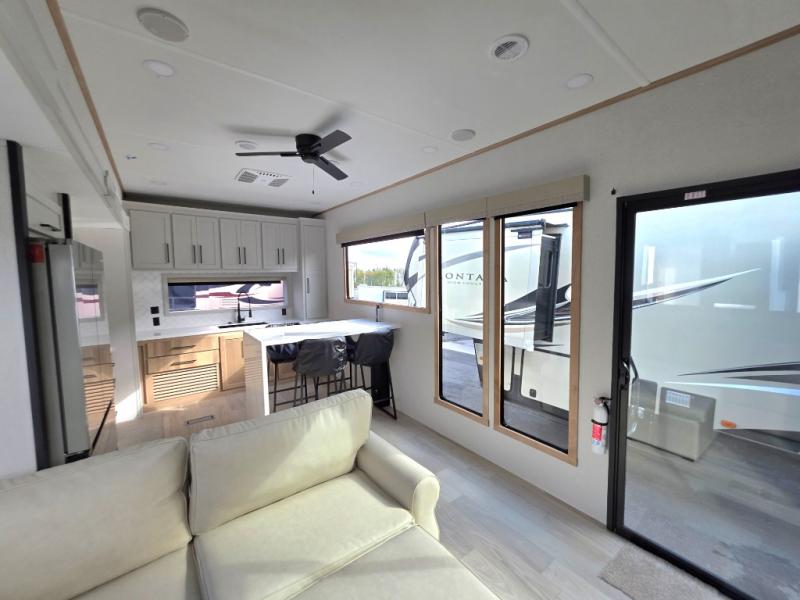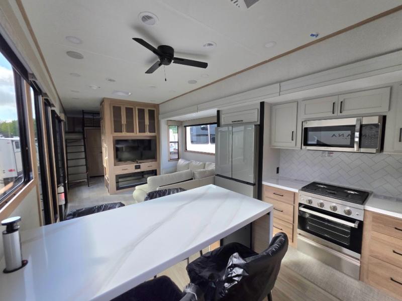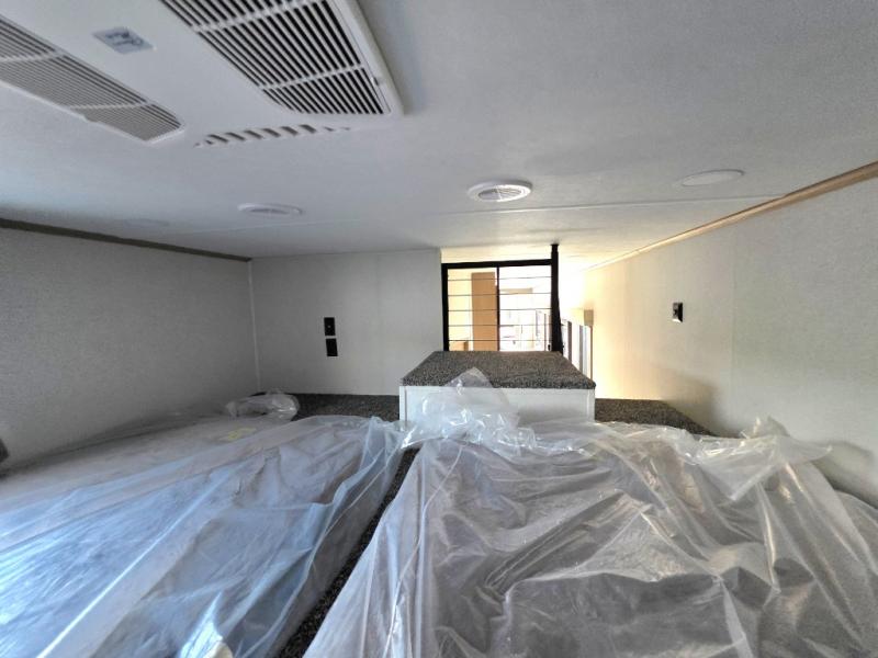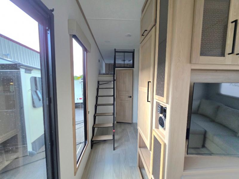 This incredible destination trailer has everything you need to live life to the fullest. Imagine retreating to a peaceful rear bedroom, complete with a king bed slide, spacious wardrobe, plus a closet with washer and dryer prep. Unwind and pamper yourself in style in the incredible full bathroom, featuring a linen closet, medicine cabinets, and a fiberglass shower with a seat. The living room is the heart of the home, boasting a comfortable sectional sofa, ottoman, and entertainment center perfect for gathering with family or friends and creating unforgettable memories. The loft is a cozy retreat for kids or guests, featuring two bunk mats, and a dual wardrobe/bookcases for their things. The front kitchen has a 19 cu. ft. refrigerator, overhead cabinet, microwave, three-burner cooktop, and free-standing dinette with a waterfall edge, and the pantry provides ample storage for all your favorite foods. Finally, step outside and enjoy the shade and protection of the two awnings and the two entry and two exit doors will make it easy to come and go.