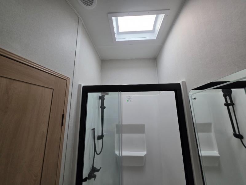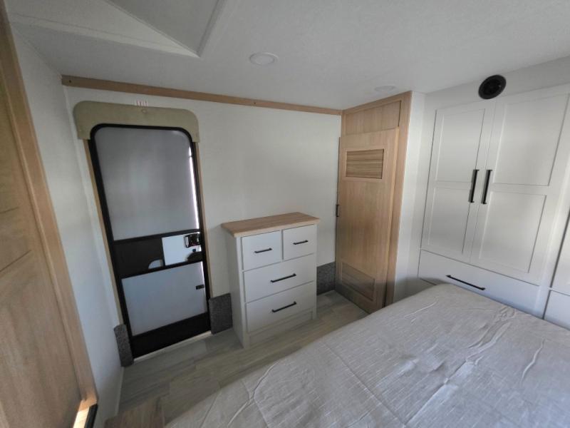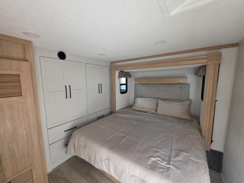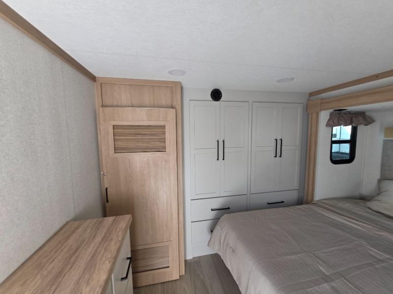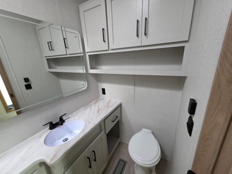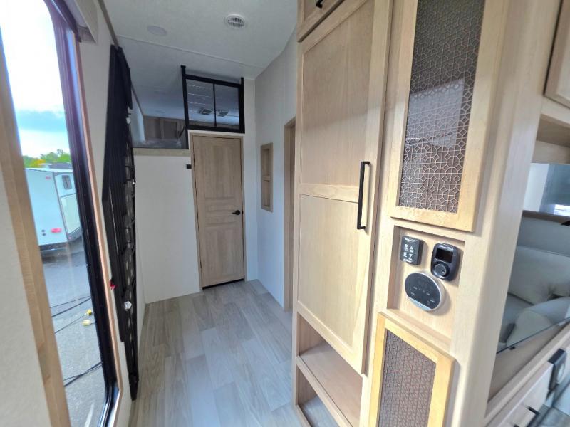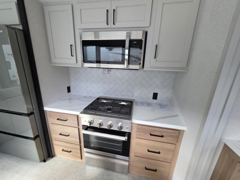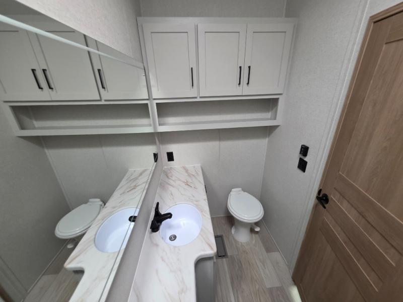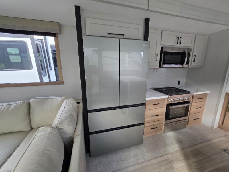 This incredible destination trailer has everything you need to live life to the fullest. Imagine retreating to a peaceful rear bedroom, complete with a king bed slide, spacious wardrobe, plus a closet with washer and dryer prep. Unwind and pamper yourself in style in the incredible full bathroom, featuring a linen closet, medicine cabinets, and a fiberglass shower with a seat. The living room is the heart of the home, boasting a comfortable sectional sofa, ottoman, and entertainment center perfect for gathering with family or friends and creating unforgettable memories. The loft is a cozy retreat for kids or guests, featuring two bunk mats, and a dual wardrobe/bookcases for their things. The front kitchen has a 19 cu. ft. refrigerator, overhead cabinet, microwave, three-burner cooktop, and free-standing dinette with a waterfall edge, and the pantry provides ample storage for all your favorite foods. Finally, step outside and enjoy the shade and protection of the two awnings and the two entry and two exit doors will make it easy to come and go.