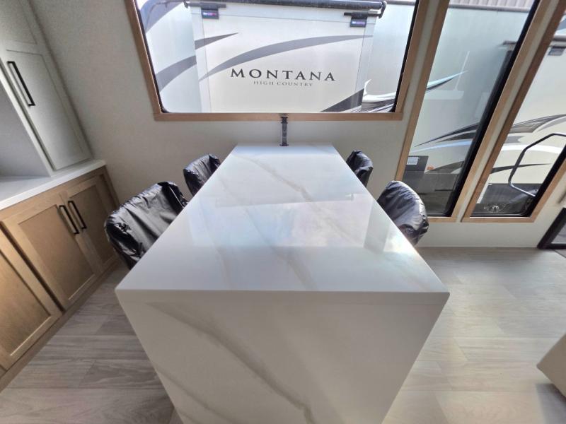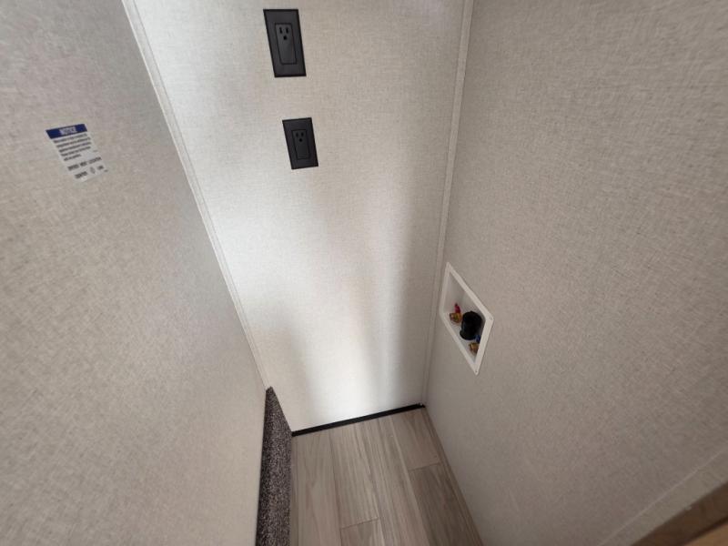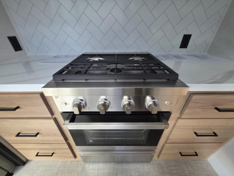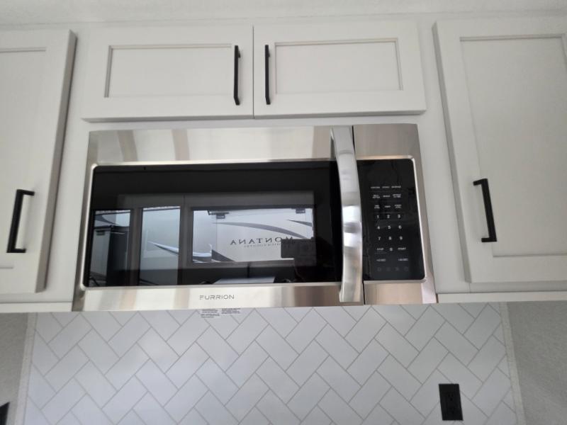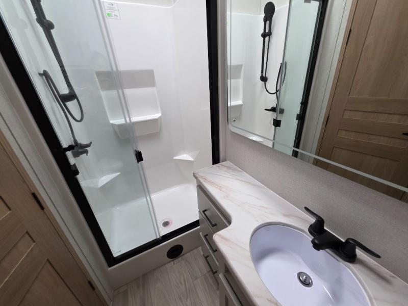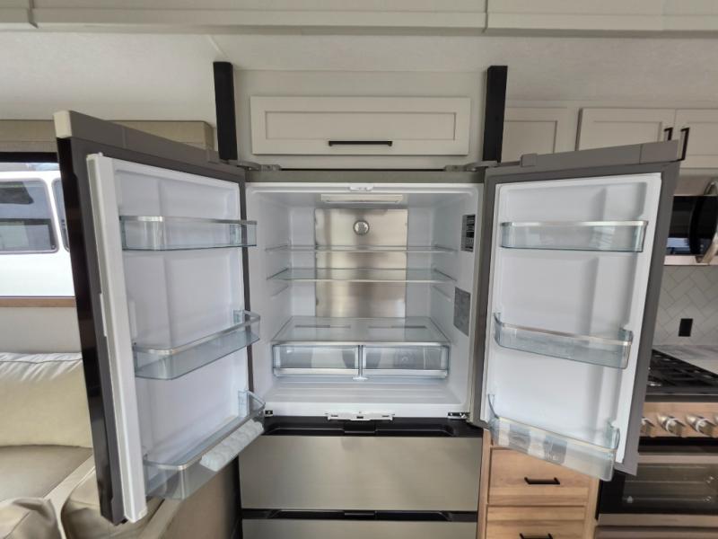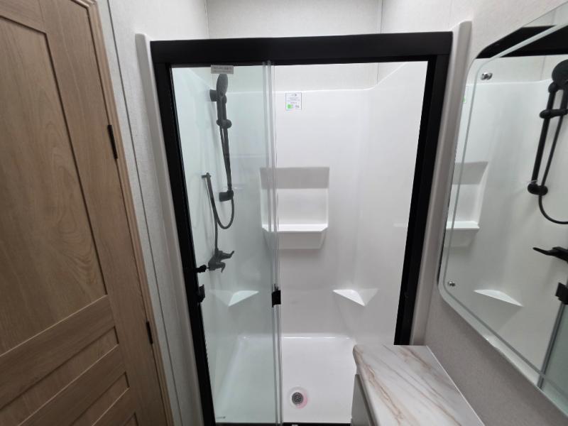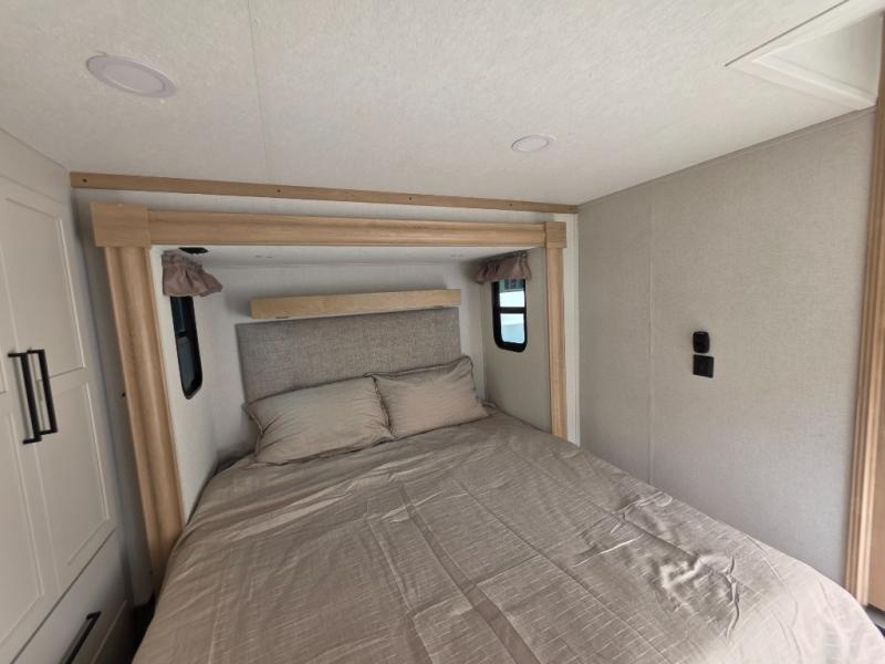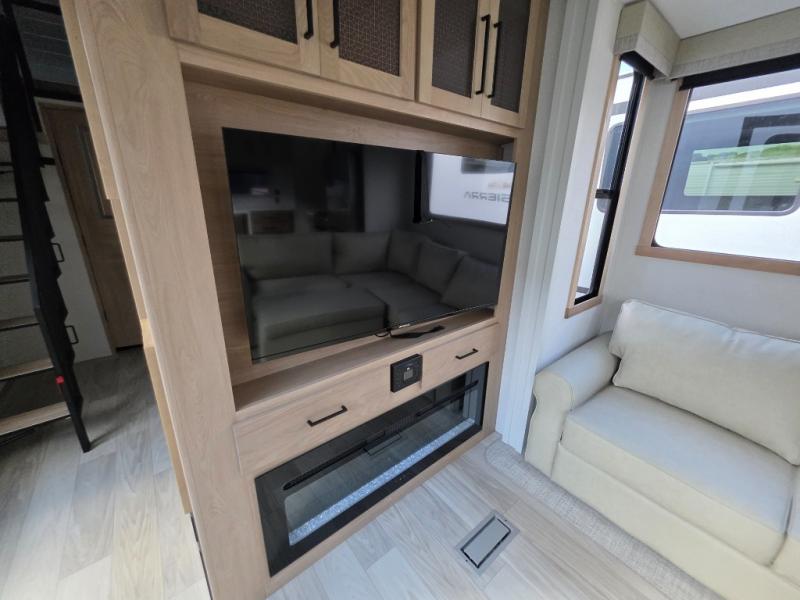 This incredible destination trailer has everything you need to live life to the fullest. Imagine retreating to a peaceful rear bedroom, complete with a king bed slide, spacious wardrobe, plus a closet with washer and dryer prep. Unwind and pamper yourself in style in the incredible full bathroom, featuring a linen closet, medicine cabinets, and a fiberglass shower with a seat. The living room is the heart of the home, boasting a comfortable sectional sofa, ottoman, and entertainment center perfect for gathering with family or friends and creating unforgettable memories. The loft is a cozy retreat for kids or guests, featuring two bunk mats, and a dual wardrobe/bookcases for their things. The front kitchen has a 19 cu. ft. refrigerator, overhead cabinet, microwave, three-burner cooktop, and free-standing dinette with a waterfall edge, and the pantry provides ample storage for all your favorite foods. Finally, step outside and enjoy the shade and protection of the two awnings and the two entry and two exit doors will make it easy to come and go.