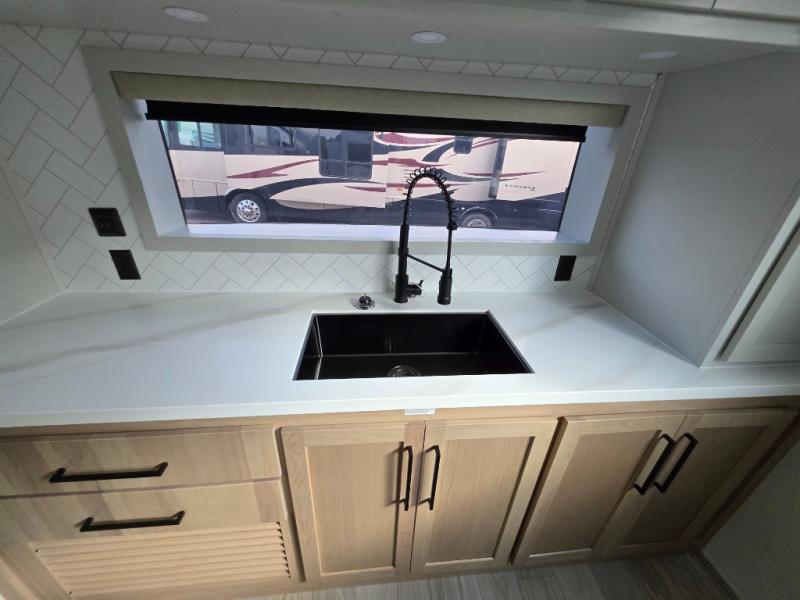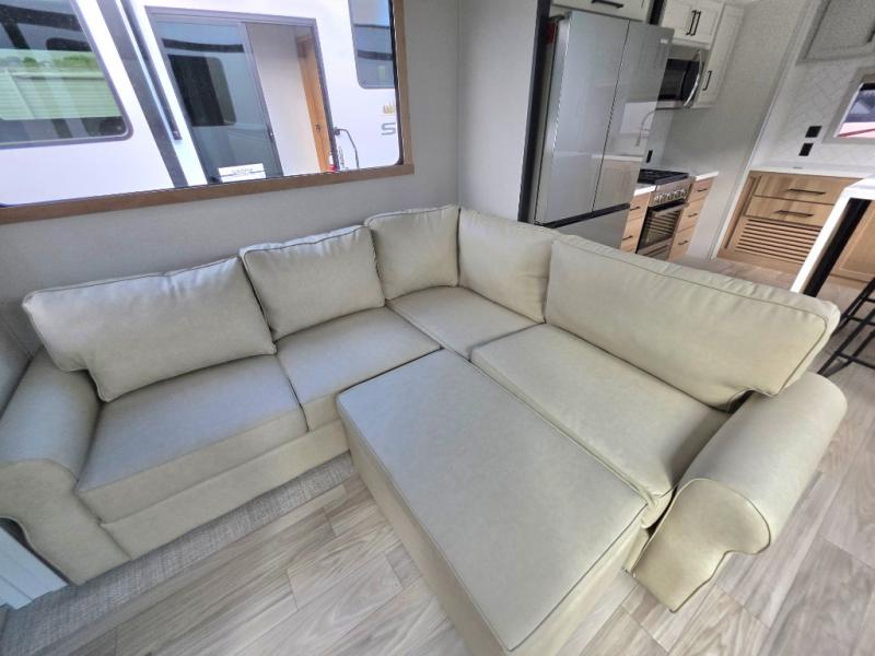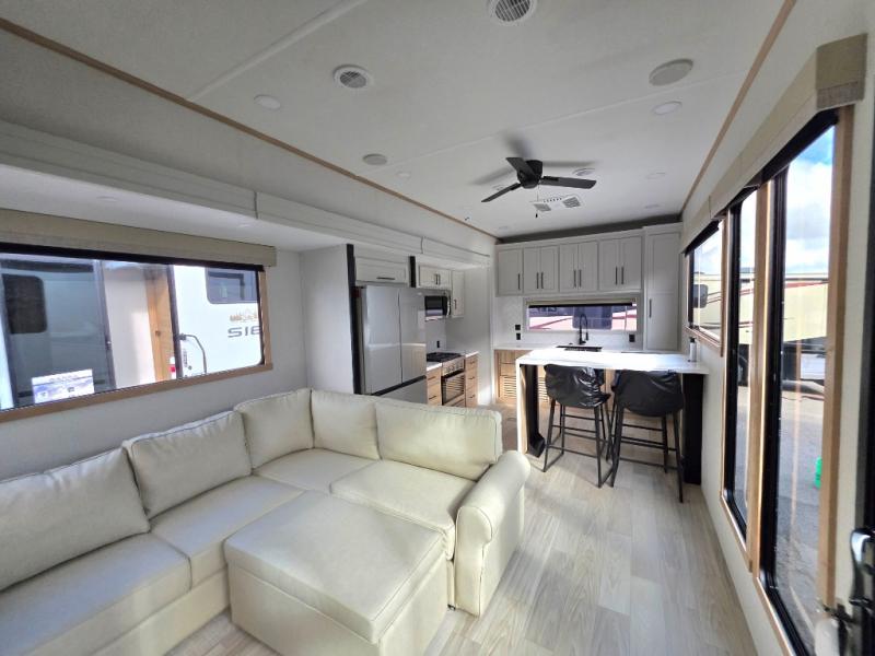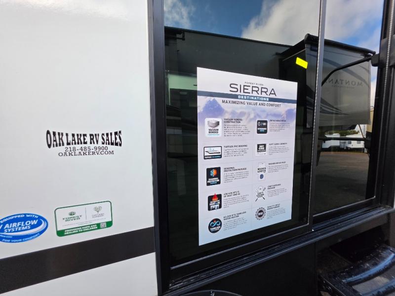 With each Sierra Destination Trailer by Forest River you will enjoy many luxurious features, such as crown molding over the kitchen cabinets, solid surface kitchen countertops, a memory foam mattress, plus so much more. The extra large picture windows throughout let natural light in and provide beautiful outdoor views, and each model includes three or more slides for added interior space. You'll find many exterior conveniences, like the porch light with an interior switch, the rain gutters with extra long drip spouts to prevent black streaking, and an electric awning with LED light strip, plus more! You will stay comfortable year around with dual 15,000 A/C units plus each model is constructed with an Underbelly Armor for better protection and insulation!