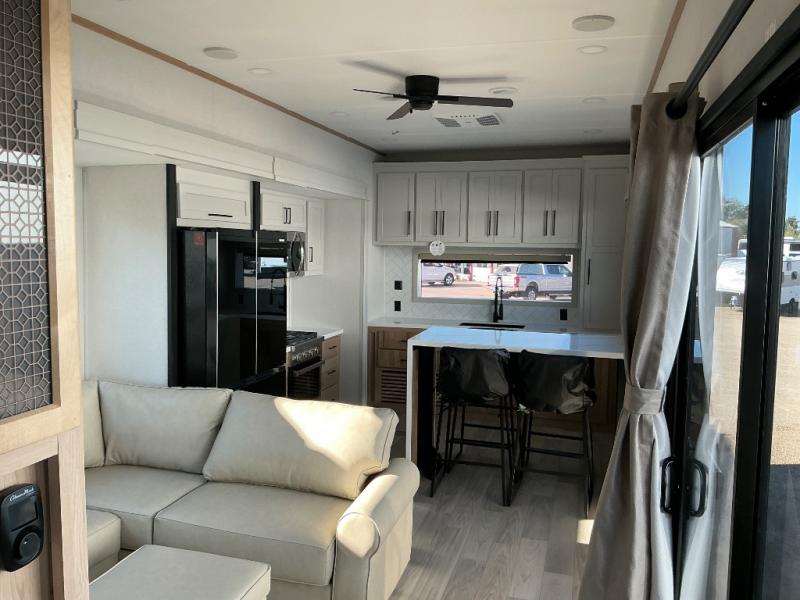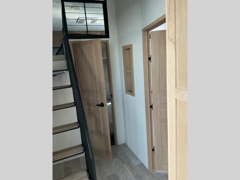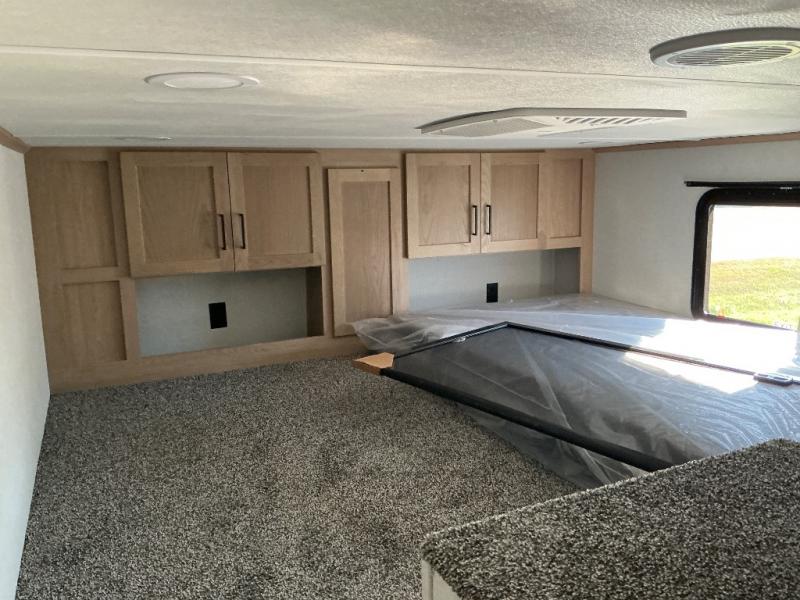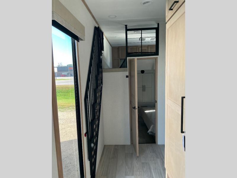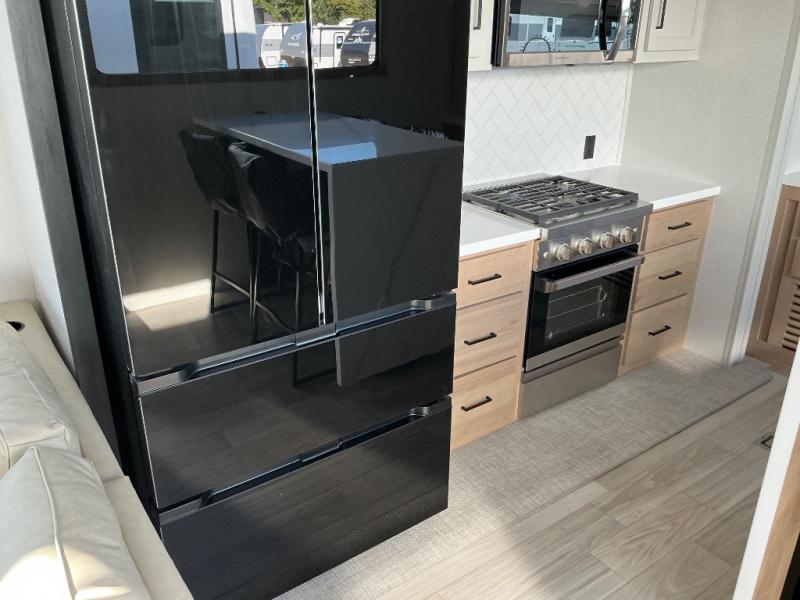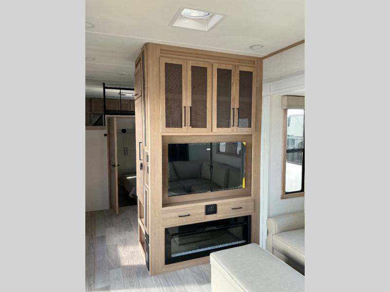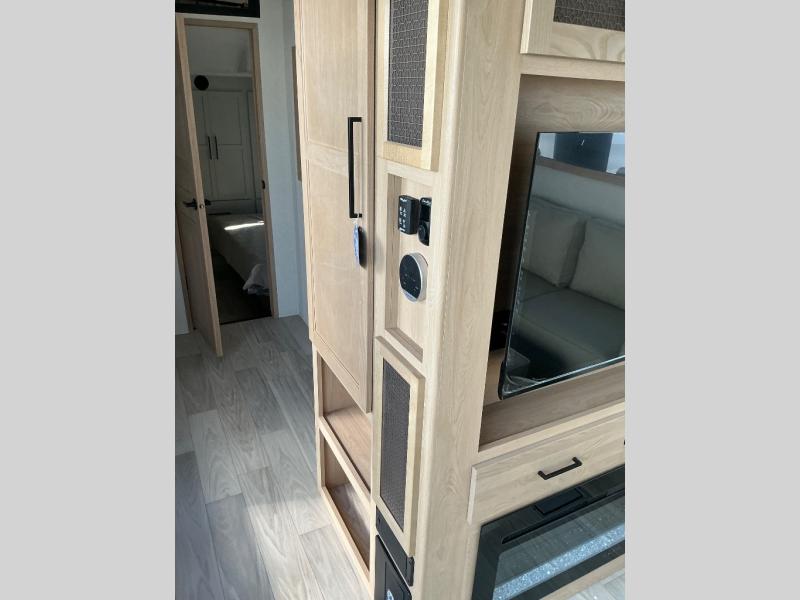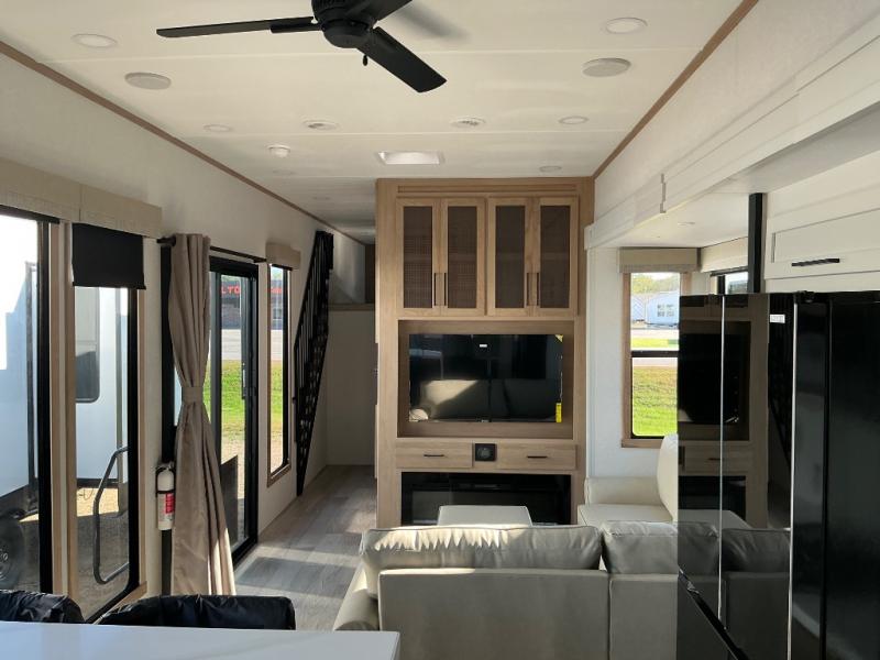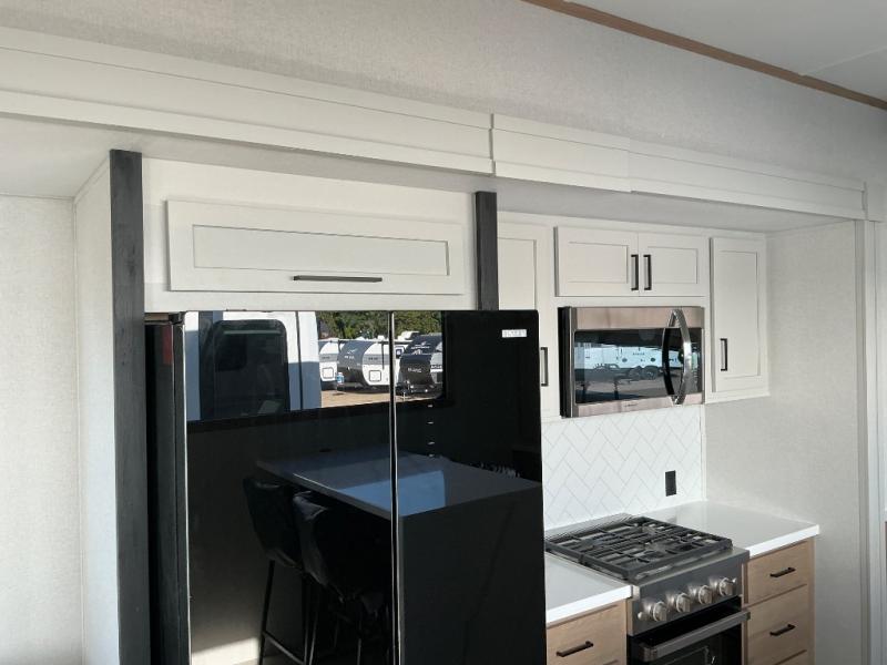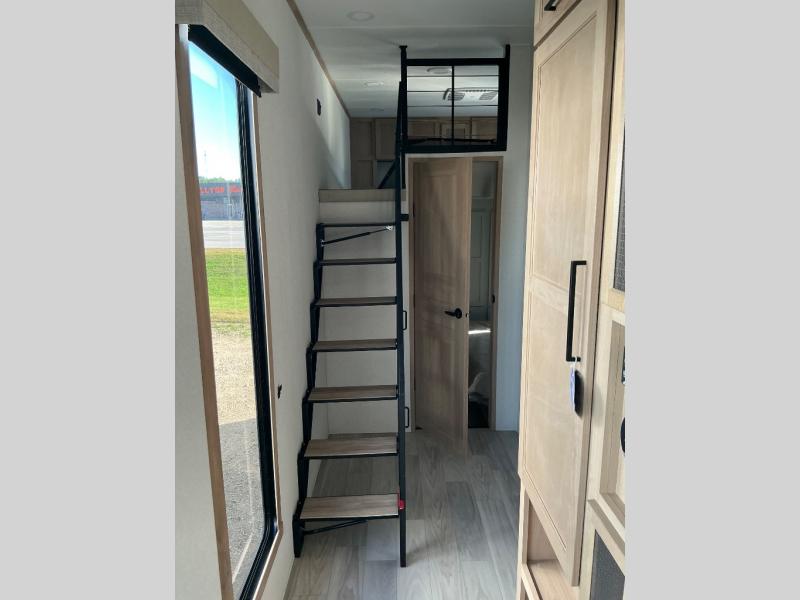 This incredible destination trailer has everything you need to live life to the fullest. Imagine retreating to a peaceful rear bedroom, complete with a king bed slide, spacious wardrobe, plus a closet with washer and dryer prep. Unwind and pamper yourself in style in the incredible full bathroom, featuring a linen closet, medicine cabinets, and a fiberglass shower with a seat. The living room is the heart of the home, boasting a comfortable sectional sofa, ottoman, and entertainment center perfect for gathering with family or friends and creating unforgettable memories. The loft is a cozy retreat for kids or guests, featuring two bunk mats, and a dual wardrobe/bookcases for their things. The front kitchen has a 19 cu. ft. refrigerator, overhead cabinet, microwave, three-burner cooktop, and free-standing dinette with a waterfall edge, and the pantry provides ample storage for all your favorite foods. Finally, step outside and enjoy the shade and protection of the two awnings and the two entry and two exit doors will make it easy to come and go.