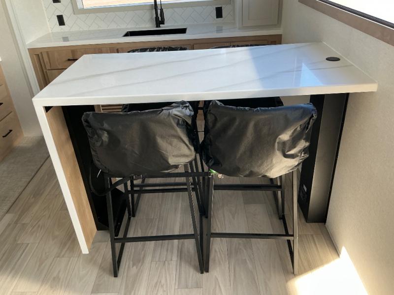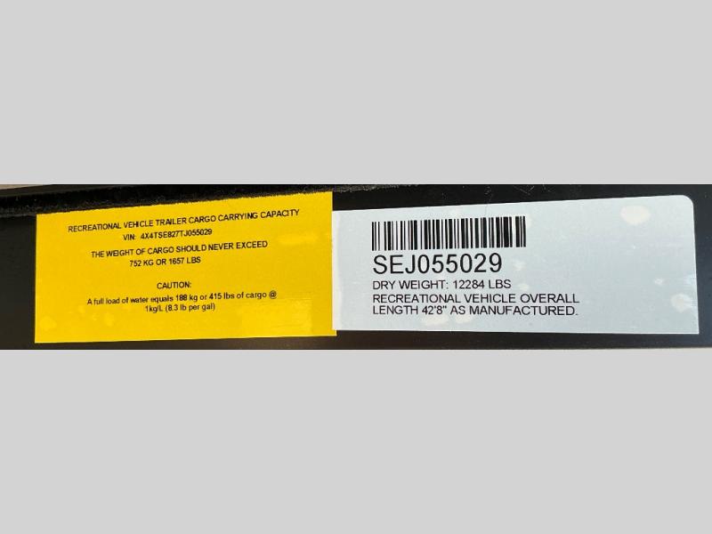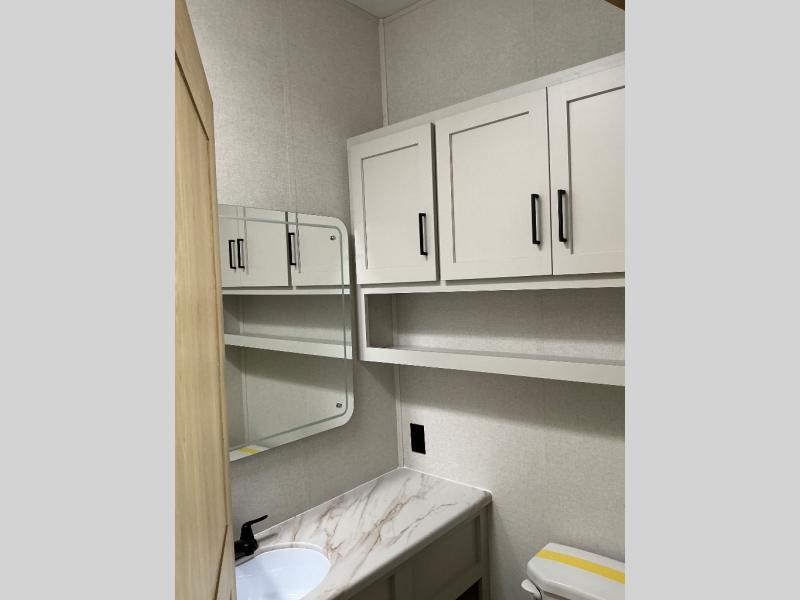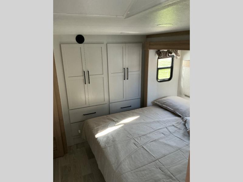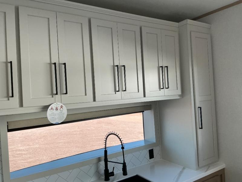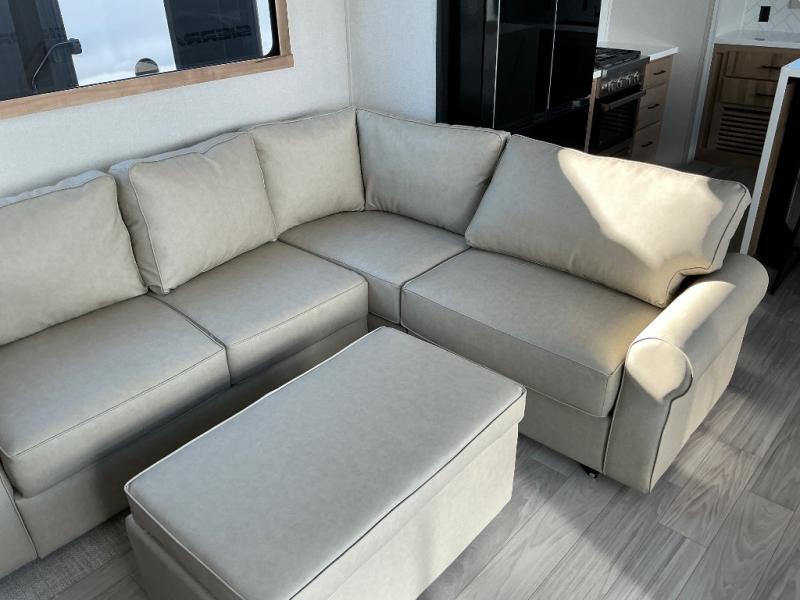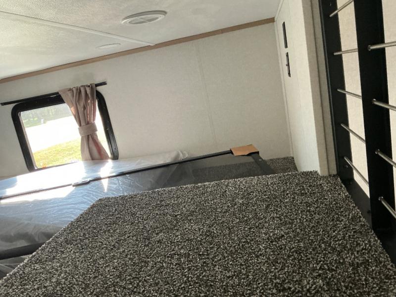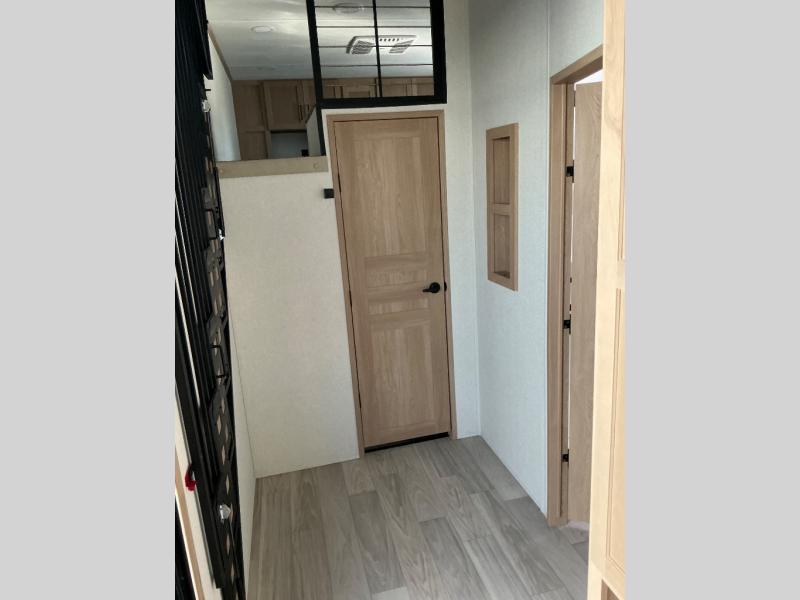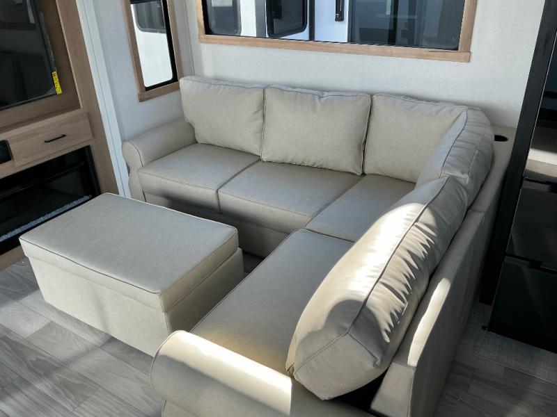 This incredible destination trailer has everything you need to live life to the fullest. Imagine retreating to a peaceful rear bedroom, complete with a king bed slide, spacious wardrobe, plus a closet with washer and dryer prep. Unwind and pamper yourself in style in the incredible full bathroom, featuring a linen closet, medicine cabinets, and a fiberglass shower with a seat. The living room is the heart of the home, boasting a comfortable sectional sofa, ottoman, and entertainment center perfect for gathering with family or friends and creating unforgettable memories. The loft is a cozy retreat for kids or guests, featuring two bunk mats, and a dual wardrobe/bookcases for their things. The front kitchen has a 19 cu. ft. refrigerator, overhead cabinet, microwave, three-burner cooktop, and free-standing dinette with a waterfall edge, and the pantry provides ample storage for all your favorite foods. Finally, step outside and enjoy the shade and protection of the two awnings and the two entry and two exit doors will make it easy to come and go.