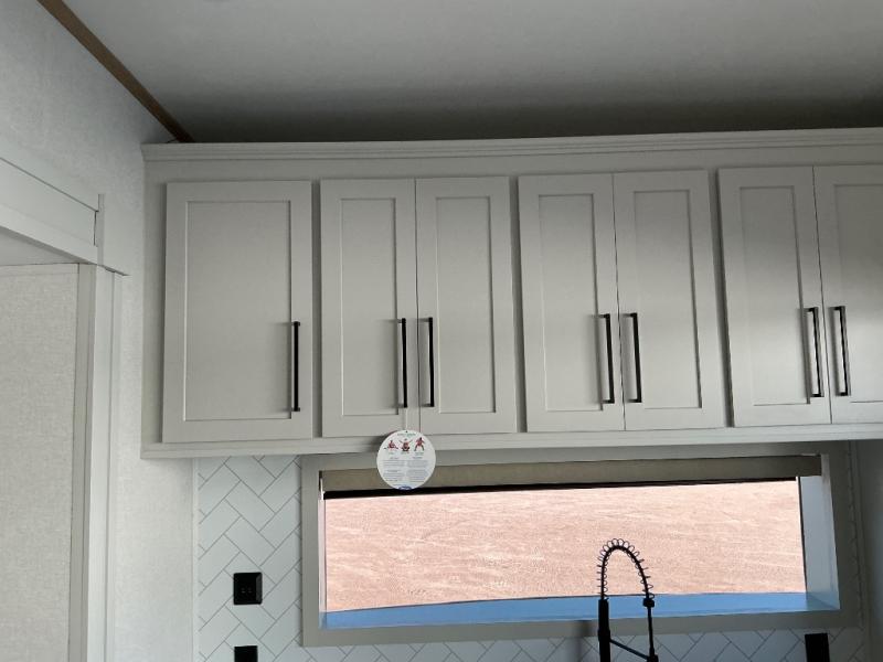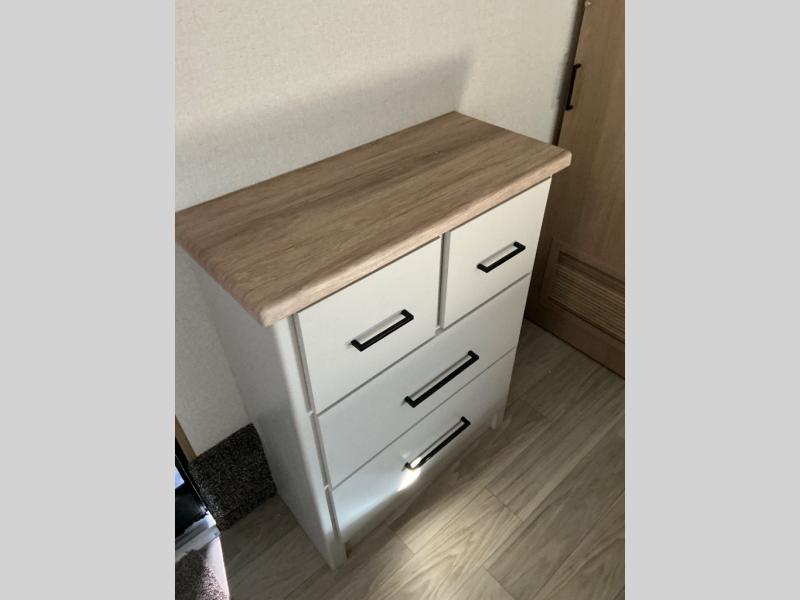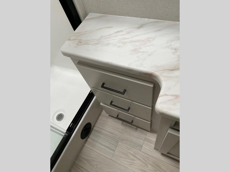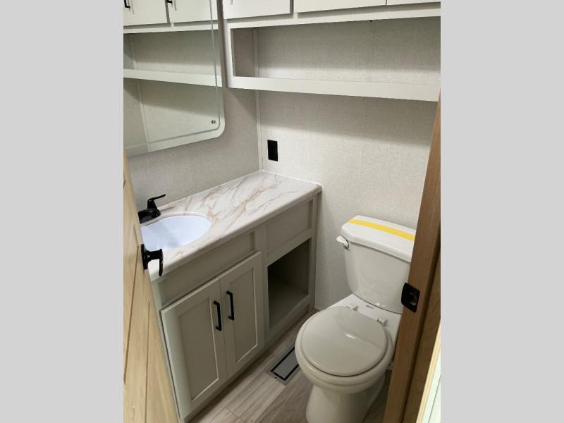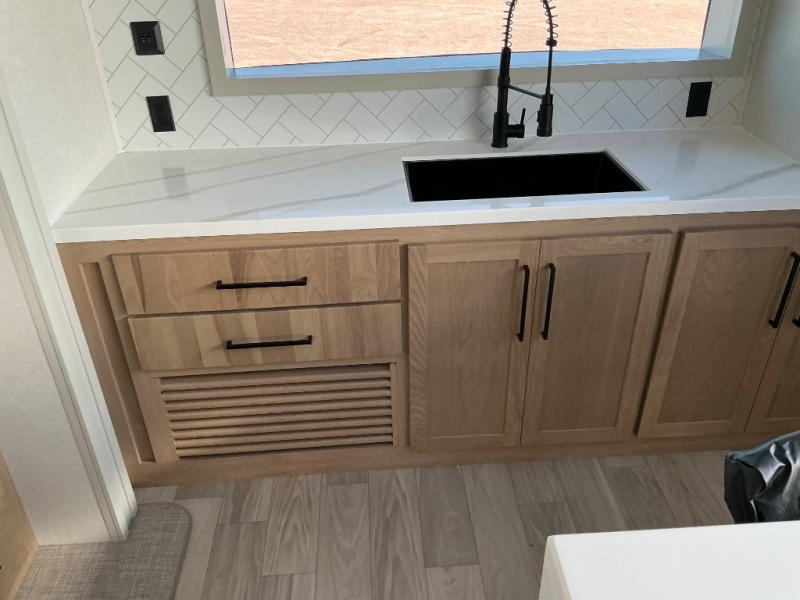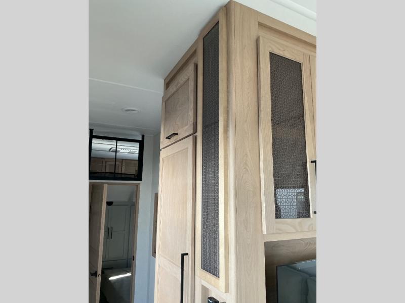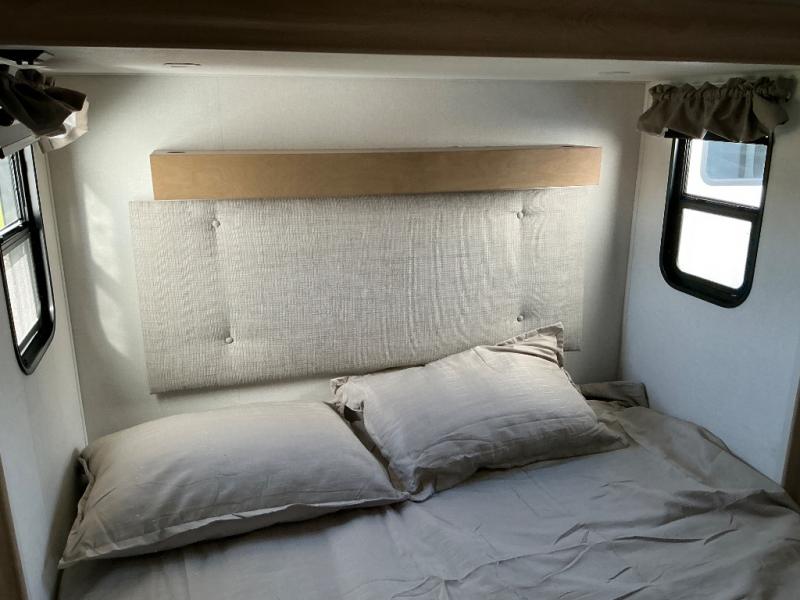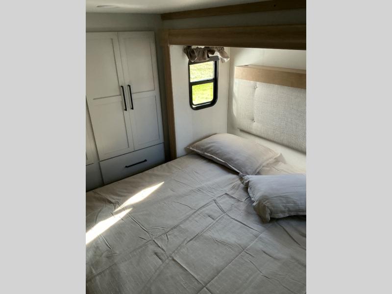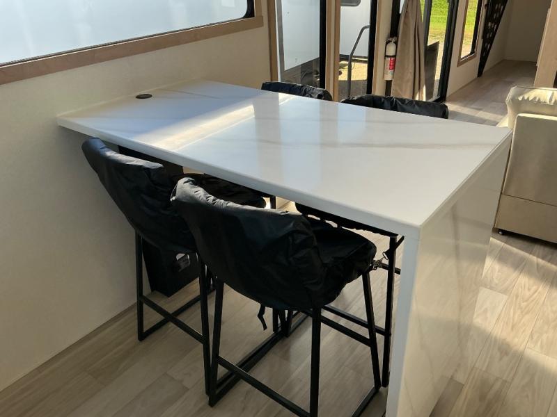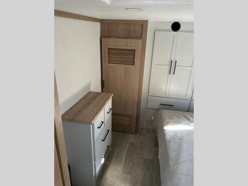 This incredible destination trailer has everything you need to live life to the fullest. Imagine retreating to a peaceful rear bedroom, complete with a king bed slide, spacious wardrobe, plus a closet with washer and dryer prep. Unwind and pamper yourself in style in the incredible full bathroom, featuring a linen closet, medicine cabinets, and a fiberglass shower with a seat. The living room is the heart of the home, boasting a comfortable sectional sofa, ottoman, and entertainment center perfect for gathering with family or friends and creating unforgettable memories. The loft is a cozy retreat for kids or guests, featuring two bunk mats, and a dual wardrobe/bookcases for their things. The front kitchen has a 19 cu. ft. refrigerator, overhead cabinet, microwave, three-burner cooktop, and free-standing dinette with a waterfall edge, and the pantry provides ample storage for all your favorite foods. Finally, step outside and enjoy the shade and protection of the two awnings and the two entry and two exit doors will make it easy to come and go.