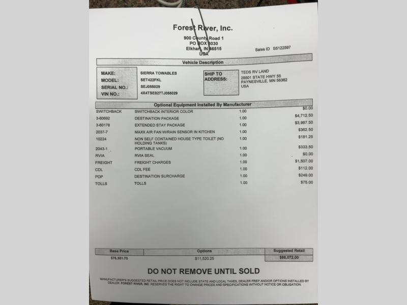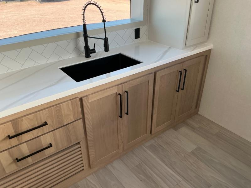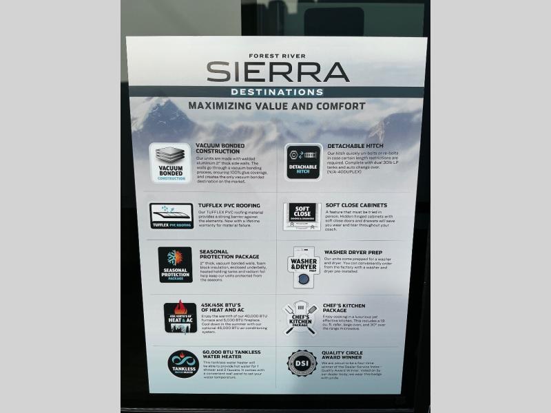 With each Sierra Destination Trailer by Forest River you will enjoy many luxurious features, such as crown molding over the kitchen cabinets, solid surface kitchen countertops, a memory foam mattress, plus so much more. The extra large picture windows throughout let natural light in and provide beautiful outdoor views, and each model includes three or more slides for added interior space. You'll find many exterior conveniences, like the porch light with an interior switch, the rain gutters with extra long drip spouts to prevent black streaking, and an electric awning with LED light strip, plus more! You will stay comfortable year around with dual 15,000 A/C units plus each model is constructed with an Underbelly Armor for better protection and insulation!
