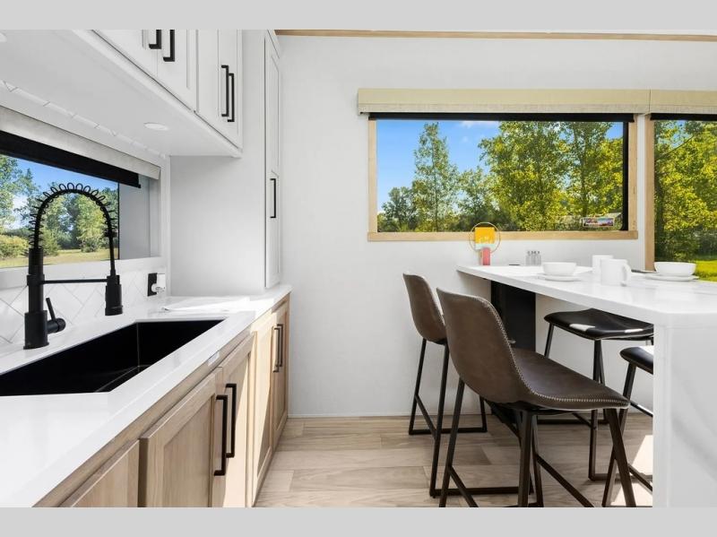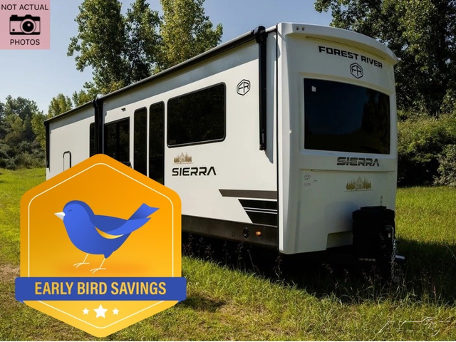 With each Sierra Destination Trailer by Forest River you will enjoy many luxurious features, such as crown molding over the kitchen cabinets, solid surface kitchen countertops, a memory foam mattress, plus so much more. The extra large picture windows throughout let natural light in and provide beautiful outdoor views, and each model includes three or more slides for added interior space. You'll find many exterior conveniences, like the porch light with an interior switch, the rain gutters with extra long drip spouts to prevent black streaking, and an electric awning with LED light strip, plus more! You will stay comfortable year around with dual 15,000 A/C units plus each model is constructed with an Underbelly Armor for better protection and insulation!