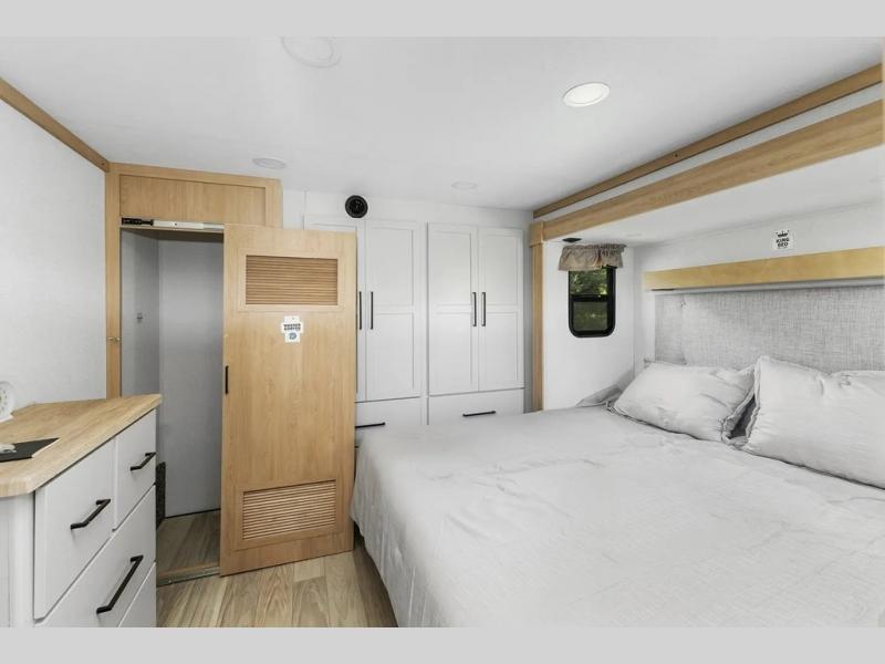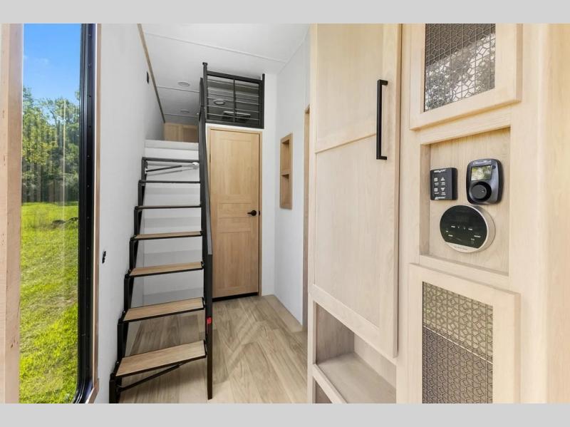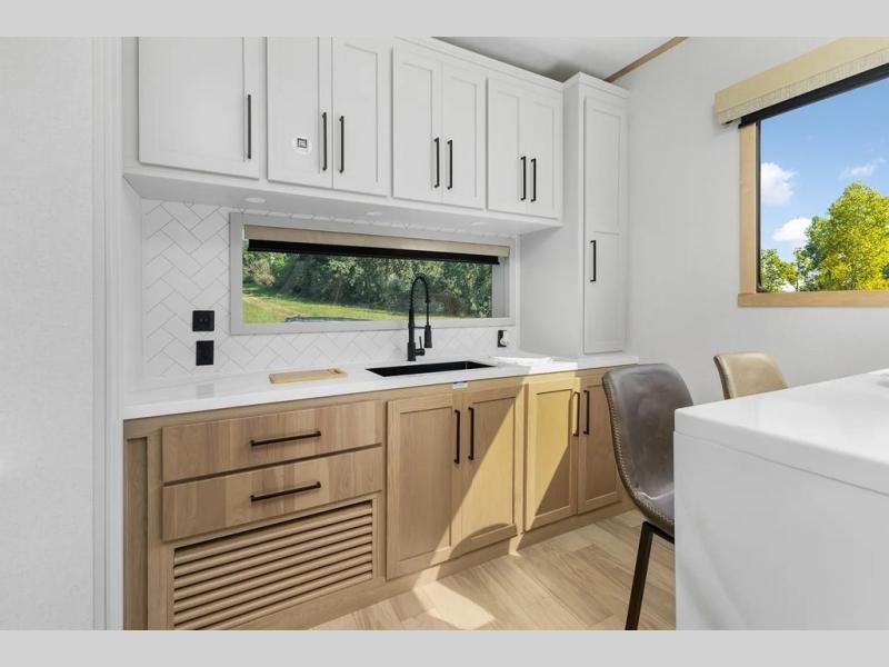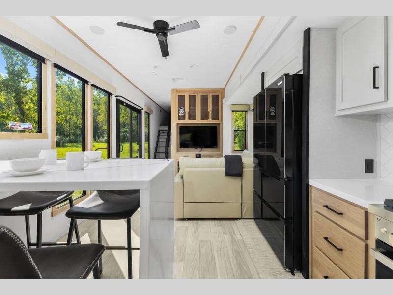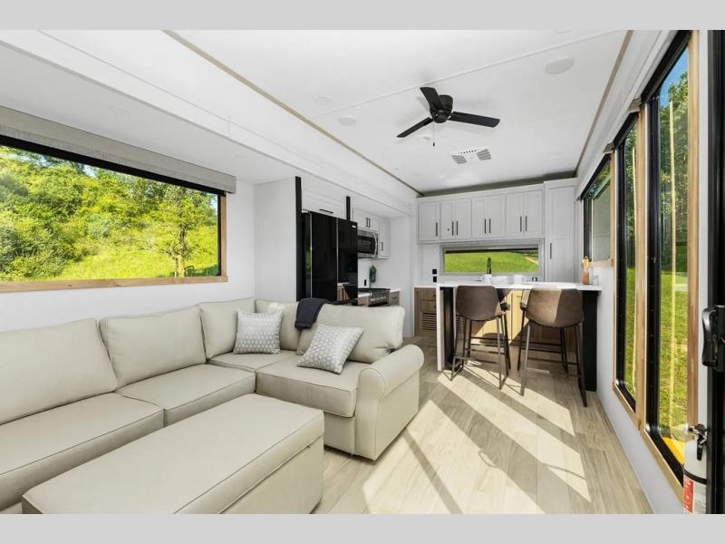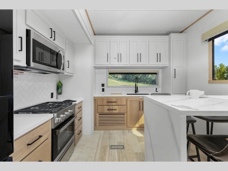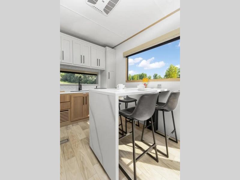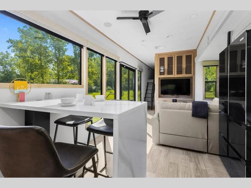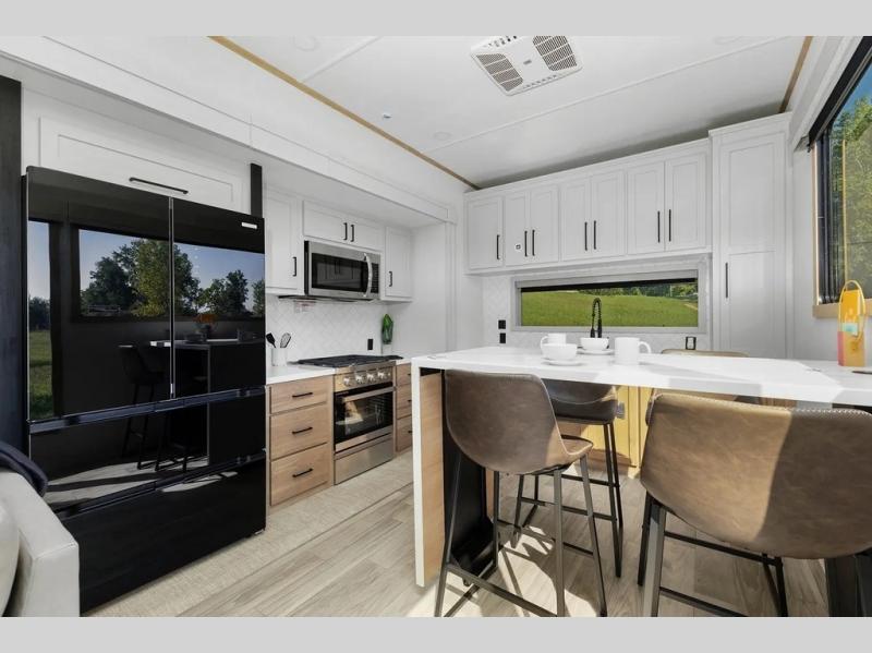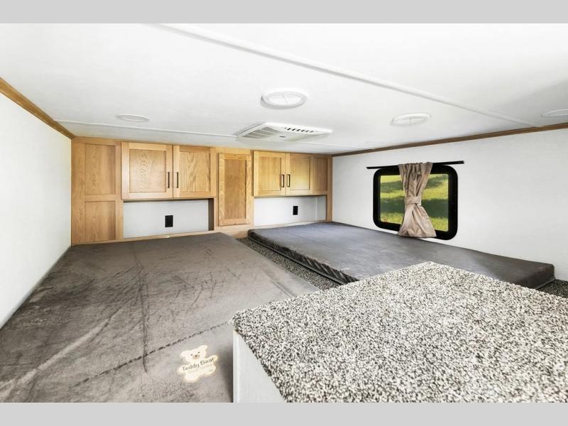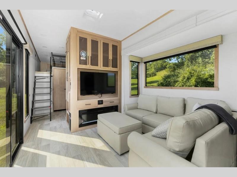 This incredible destination trailer has everything you need to live life to the fullest. Imagine retreating to a peaceful rear bedroom, complete with a king bed slide, spacious wardrobe, plus a closet with washer and dryer prep. Unwind and pamper yourself in style in the incredible full bathroom, featuring a linen closet, medicine cabinets, and a fiberglass shower with a seat. The living room is the heart of the home, boasting a comfortable sectional sofa, ottoman, and entertainment center perfect for gathering with family or friends and creating unforgettable memories. The loft is a cozy retreat for kids or guests, featuring two bunk mats, and a dual wardrobe/bookcases for their things. The front kitchen has a 19 cu. ft. refrigerator, overhead cabinet, microwave, three-burner cooktop, and free-standing dinette with a waterfall edge, and the pantry provides ample storage for all your favorite foods. Finally, step outside and enjoy the shade and protection of the two awnings and the two entry and two exit doors will make it easy to come and go.