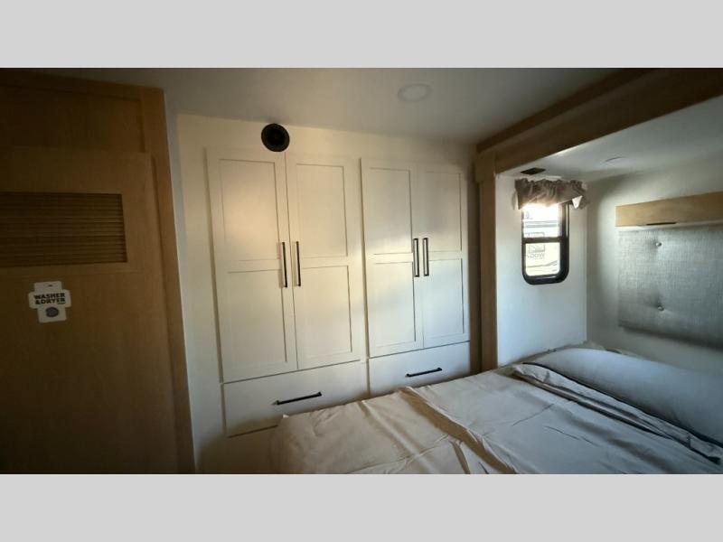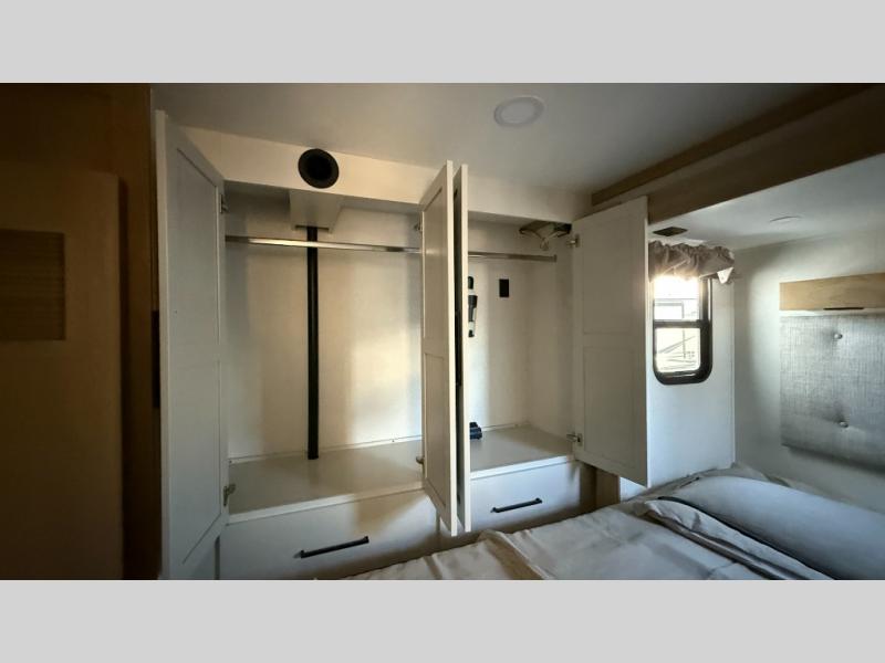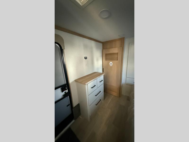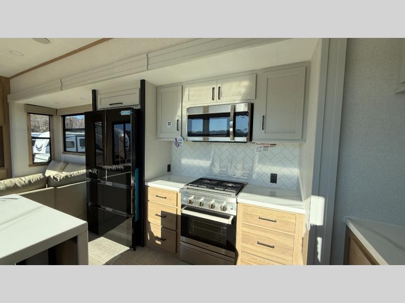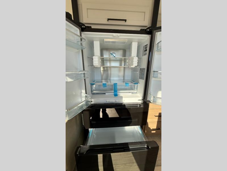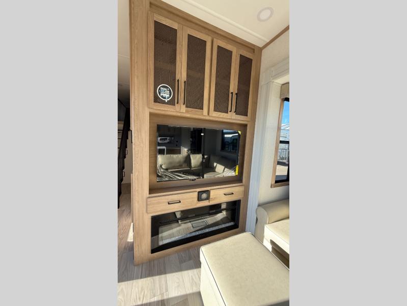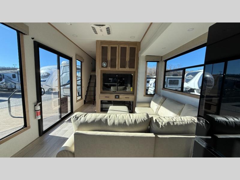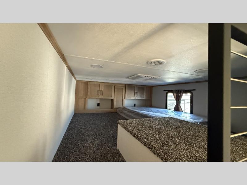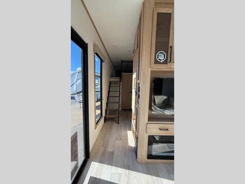 This incredible destination trailer has everything you need to live life to the fullest. Imagine retreating to a peaceful rear bedroom, complete with a king bed slide, spacious wardrobe, plus a closet with washer and dryer prep. Unwind and pamper yourself in style in the incredible full bathroom, featuring a linen closet, medicine cabinets, and a fiberglass shower with a seat. The living room is the heart of the home, boasting a comfortable sectional sofa, ottoman, and entertainment center perfect for gathering with family or friends and creating unforgettable memories. The loft is a cozy retreat for kids or guests, featuring two bunk mats, and a dual wardrobe/bookcases for their things. The front kitchen has a 19 cu. ft. refrigerator, overhead cabinet, microwave, three-burner cooktop, and free-standing dinette with a waterfall edge, and the pantry provides ample storage for all your favorite foods. Finally, step outside and enjoy the shade and protection of the two awnings and the two entry and two exit doors will make it easy to come and go.