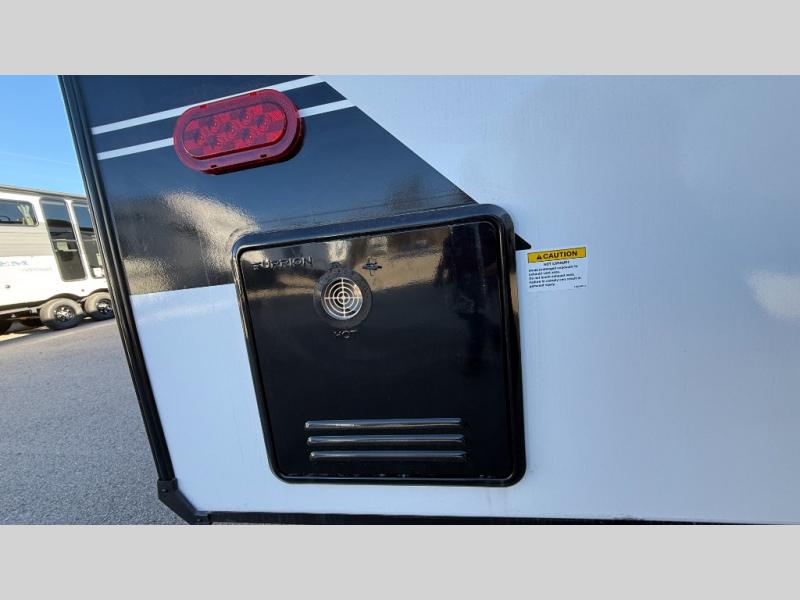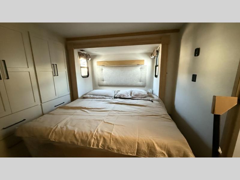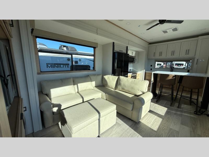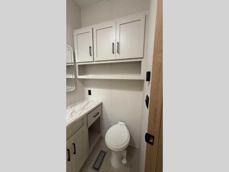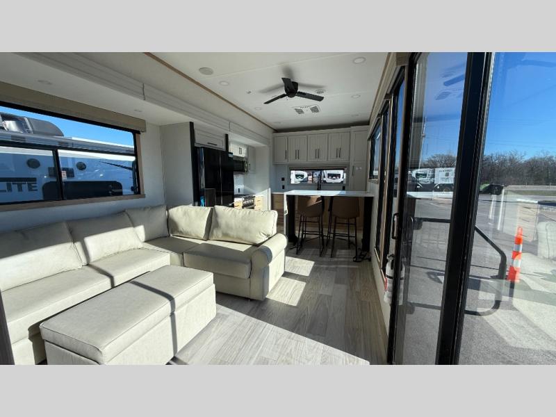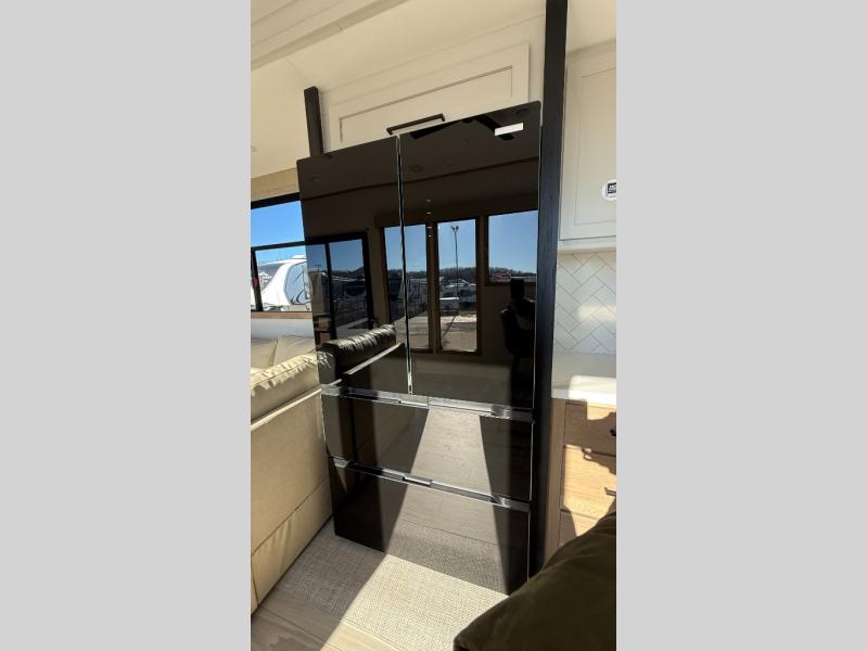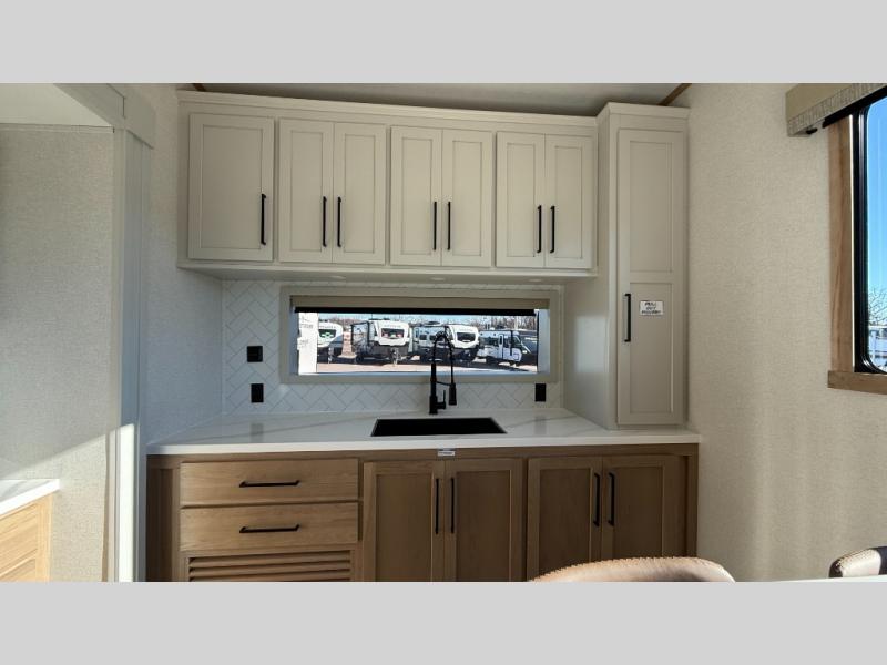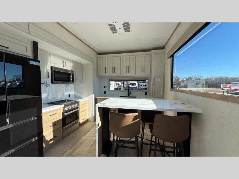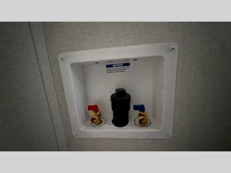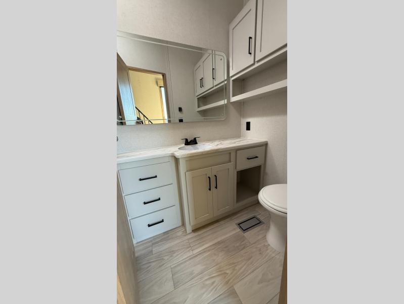 This incredible destination trailer has everything you need to live life to the fullest. Imagine retreating to a peaceful rear bedroom, complete with a king bed slide, spacious wardrobe, plus a closet with washer and dryer prep. Unwind and pamper yourself in style in the incredible full bathroom, featuring a linen closet, medicine cabinets, and a fiberglass shower with a seat. The living room is the heart of the home, boasting a comfortable sectional sofa, ottoman, and entertainment center perfect for gathering with family or friends and creating unforgettable memories. The loft is a cozy retreat for kids or guests, featuring two bunk mats, and a dual wardrobe/bookcases for their things. The front kitchen has a 19 cu. ft. refrigerator, overhead cabinet, microwave, three-burner cooktop, and free-standing dinette with a waterfall edge, and the pantry provides ample storage for all your favorite foods. Finally, step outside and enjoy the shade and protection of the two awnings and the two entry and two exit doors will make it easy to come and go.