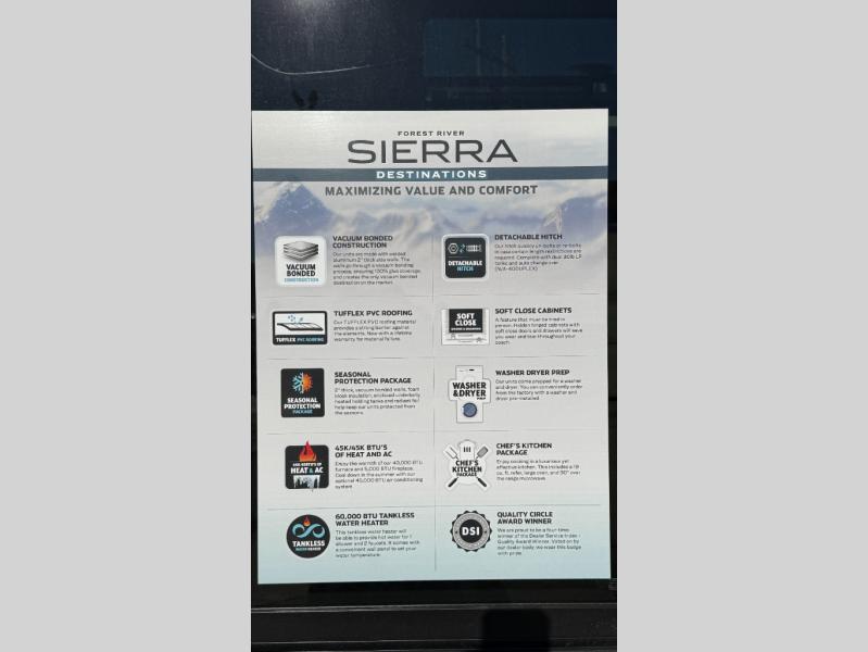 With each Sierra Destination Trailer by Forest River you will enjoy many luxurious features, such as crown molding over the kitchen cabinets, solid surface kitchen countertops, a memory foam mattress, plus so much more. The extra large picture windows throughout let natural light in and provide beautiful outdoor views, and each model includes three or more slides for added interior space. You'll find many exterior conveniences, like the porch light with an interior switch, the rain gutters with extra long drip spouts to prevent black streaking, and an electric awning with LED light strip, plus more! You will stay comfortable year around with dual 15,000 A/C units plus each model is constructed with an Underbelly Armor for better protection and insulation!