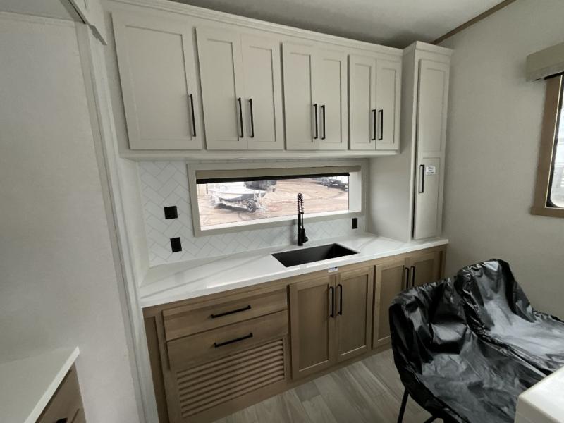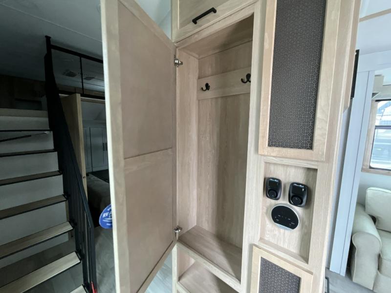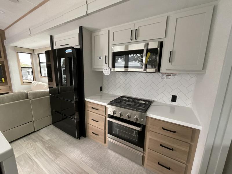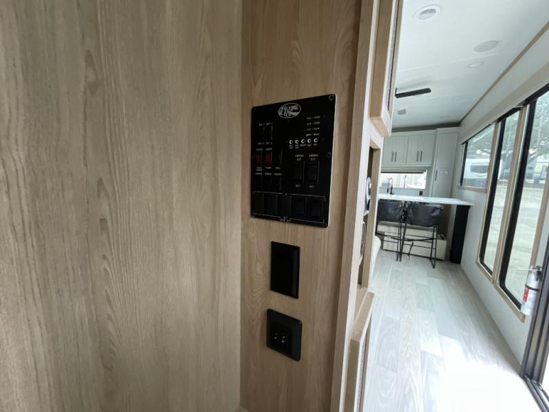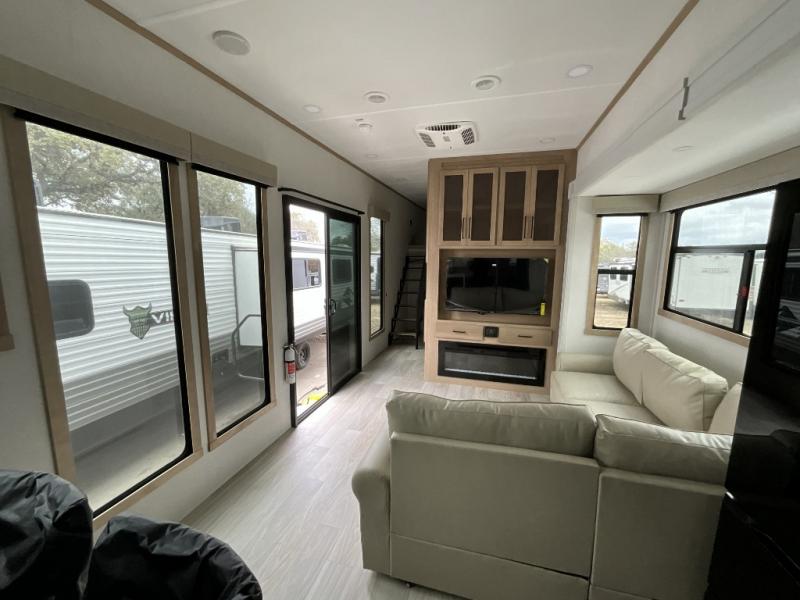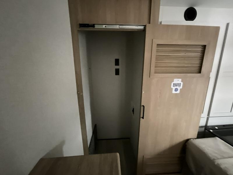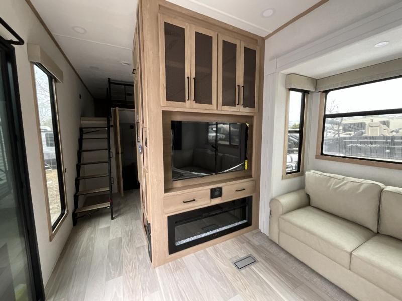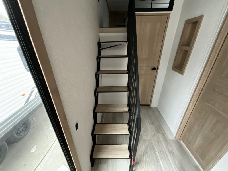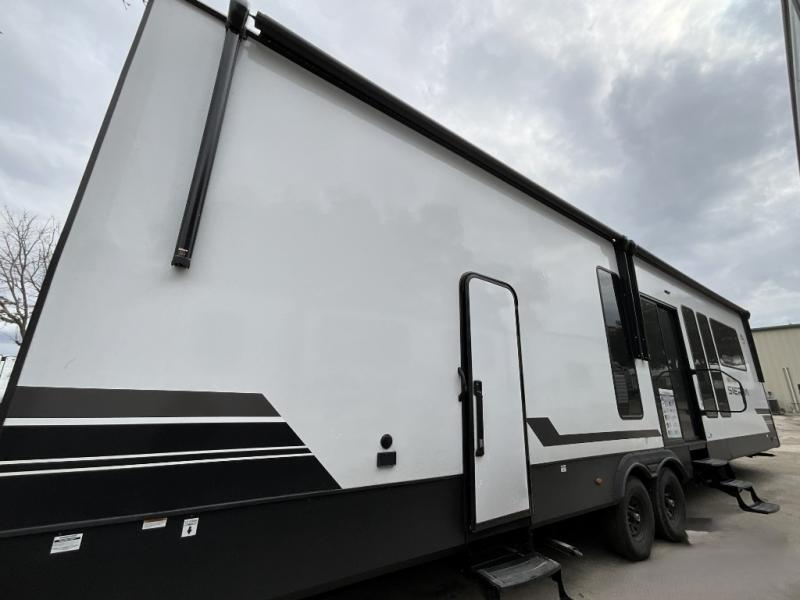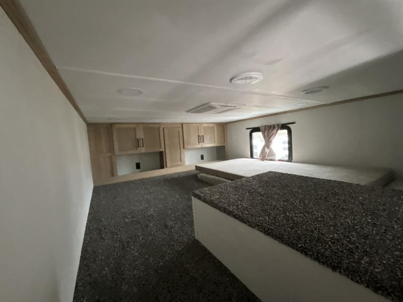 This incredible destination trailer has everything you need to live life to the fullest. Imagine retreating to a peaceful rear bedroom, complete with a king bed slide, spacious wardrobe, plus a closet with washer and dryer prep. Unwind and pamper yourself in style in the incredible full bathroom, featuring a linen closet, medicine cabinets, and a fiberglass shower with a seat. The living room is the heart of the home, boasting a comfortable sectional sofa, ottoman, and entertainment center perfect for gathering with family or friends and creating unforgettable memories. The loft is a cozy retreat for kids or guests, featuring two bunk mats, and a dual wardrobe/bookcases for their things. The front kitchen has a 19 cu. ft. refrigerator, overhead cabinet, microwave, three-burner cooktop, and free-standing dinette with a waterfall edge, and the pantry provides ample storage for all your favorite foods. Finally, step outside and enjoy the shade and protection of the two awnings and the two entry and two exit doors will make it easy to come and go.