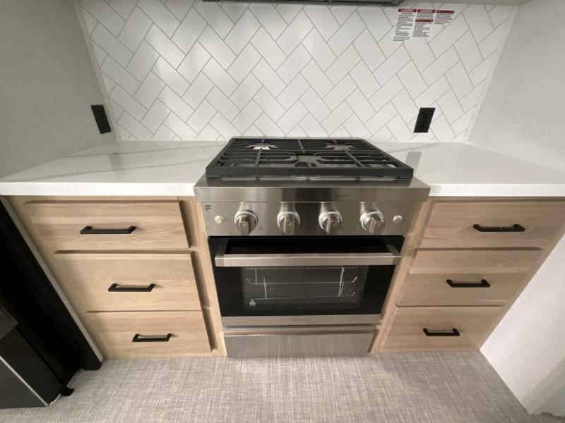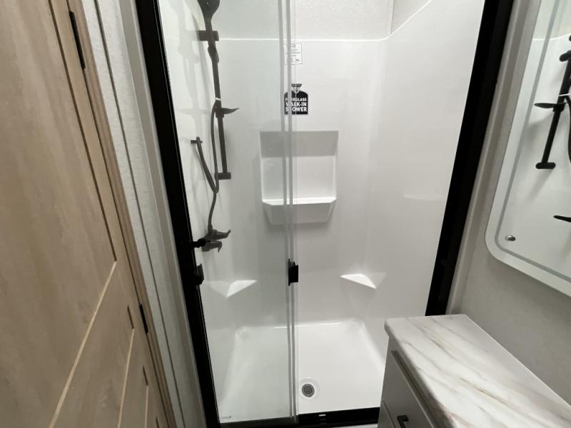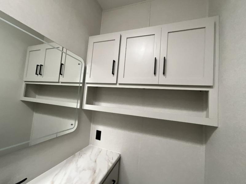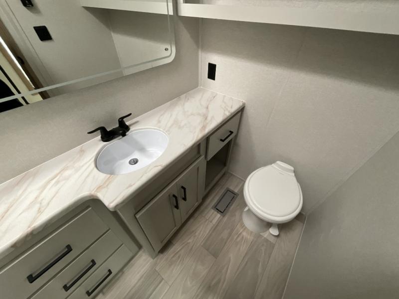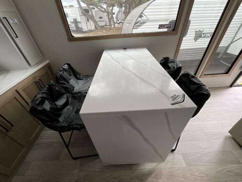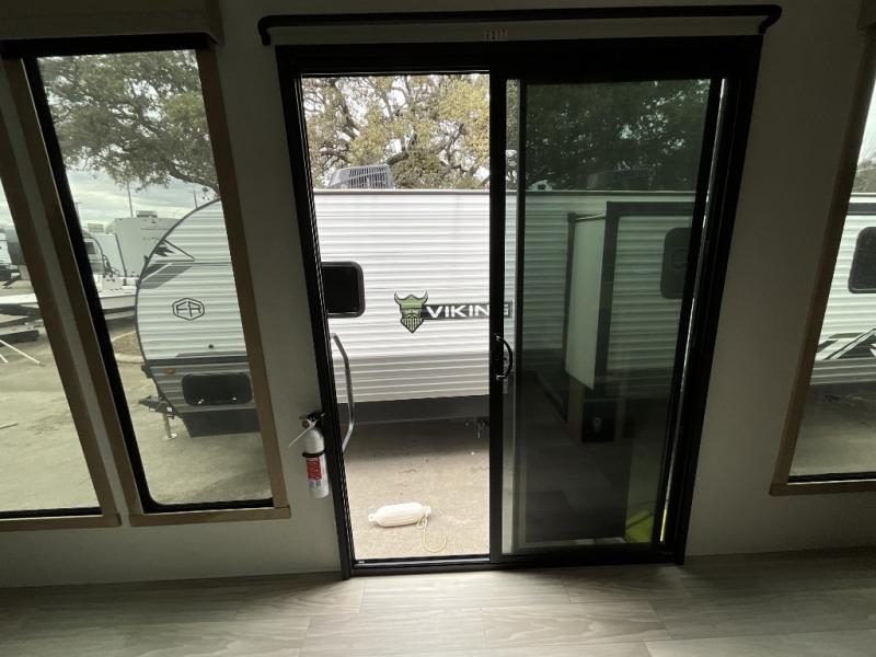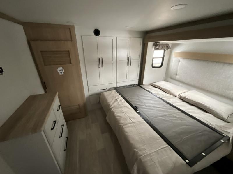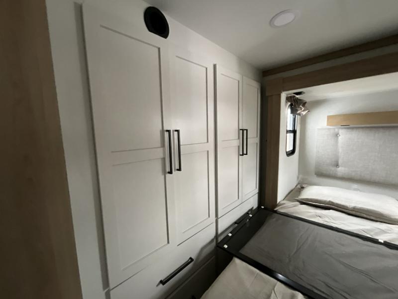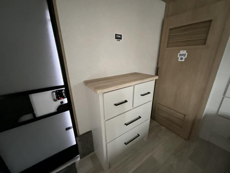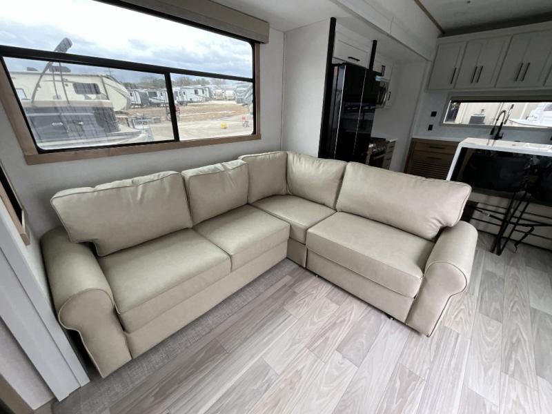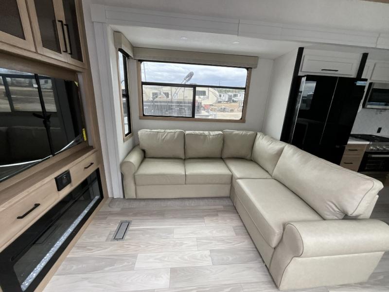 This incredible destination trailer has everything you need to live life to the fullest. Imagine retreating to a peaceful rear bedroom, complete with a king bed slide, spacious wardrobe, plus a closet with washer and dryer prep. Unwind and pamper yourself in style in the incredible full bathroom, featuring a linen closet, medicine cabinets, and a fiberglass shower with a seat. The living room is the heart of the home, boasting a comfortable sectional sofa, ottoman, and entertainment center perfect for gathering with family or friends and creating unforgettable memories. The loft is a cozy retreat for kids or guests, featuring two bunk mats, and a dual wardrobe/bookcases for their things. The front kitchen has a 19 cu. ft. refrigerator, overhead cabinet, microwave, three-burner cooktop, and free-standing dinette with a waterfall edge, and the pantry provides ample storage for all your favorite foods. Finally, step outside and enjoy the shade and protection of the two awnings and the two entry and two exit doors will make it easy to come and go.
