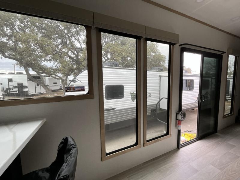 With each Sierra Destination Trailer by Forest River you will enjoy many luxurious features, such as crown molding over the kitchen cabinets, solid surface kitchen countertops, a memory foam mattress, plus so much more. The extra large picture windows throughout let natural light in and provide beautiful outdoor views, and each model includes three or more slides for added interior space. You'll find many exterior conveniences, like the porch light with an interior switch, the rain gutters with extra long drip spouts to prevent black streaking, and an electric awning with LED light strip, plus more! You will stay comfortable year around with dual 15,000 A/C units plus each model is constructed with an Underbelly Armor for better protection and insulation!