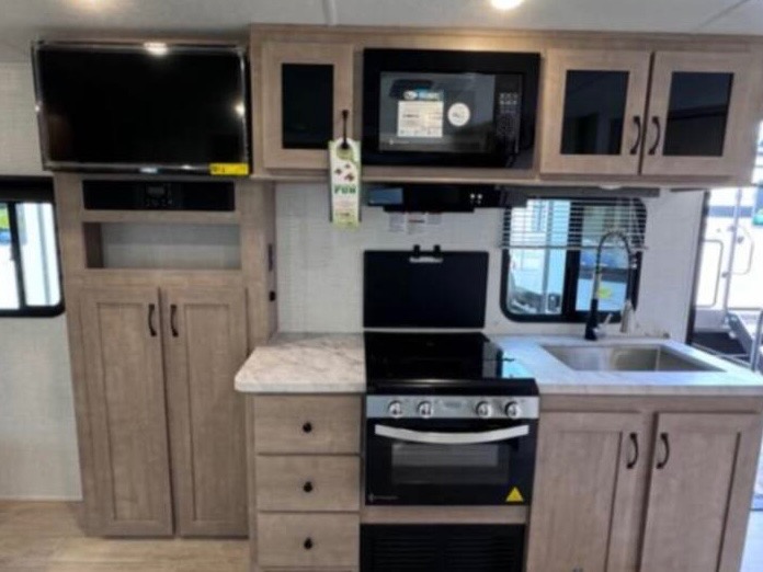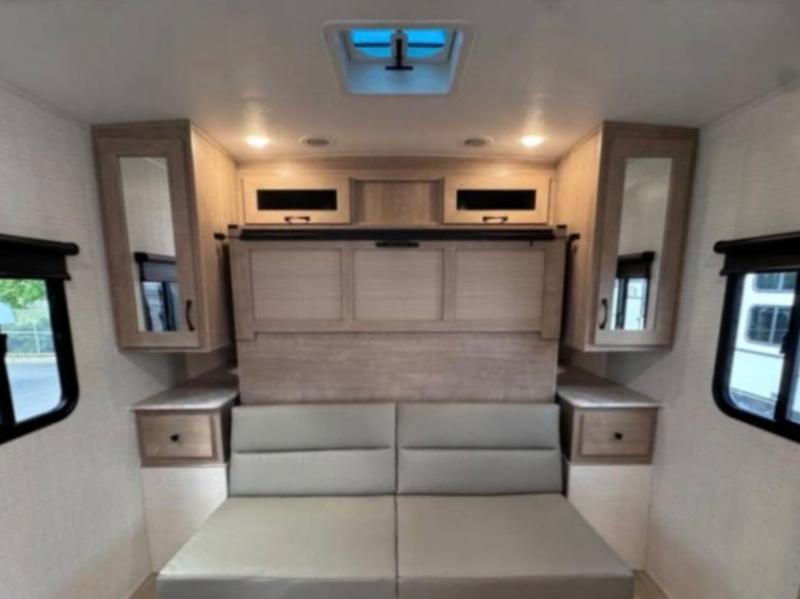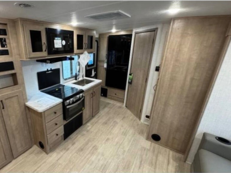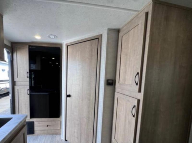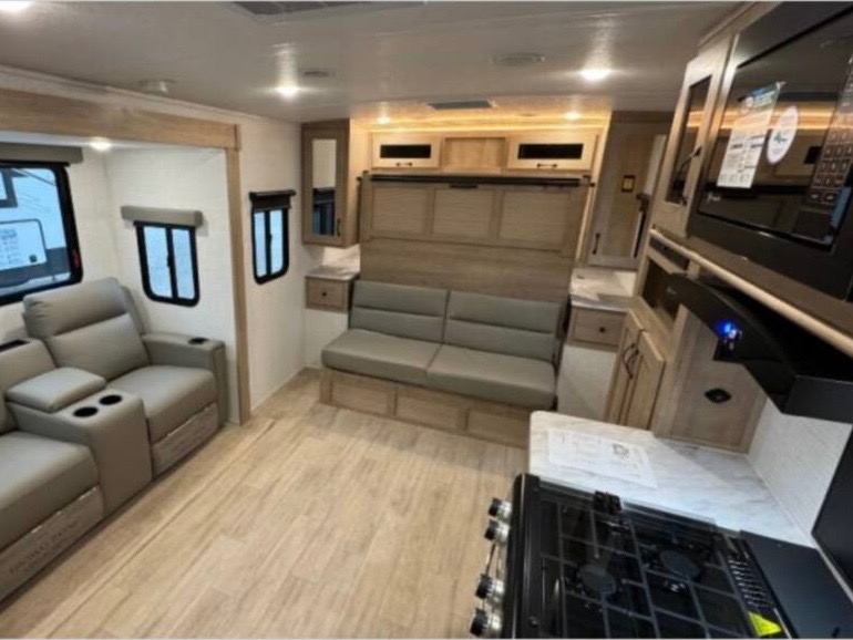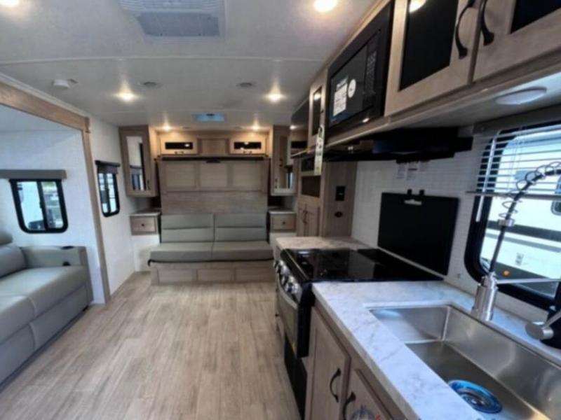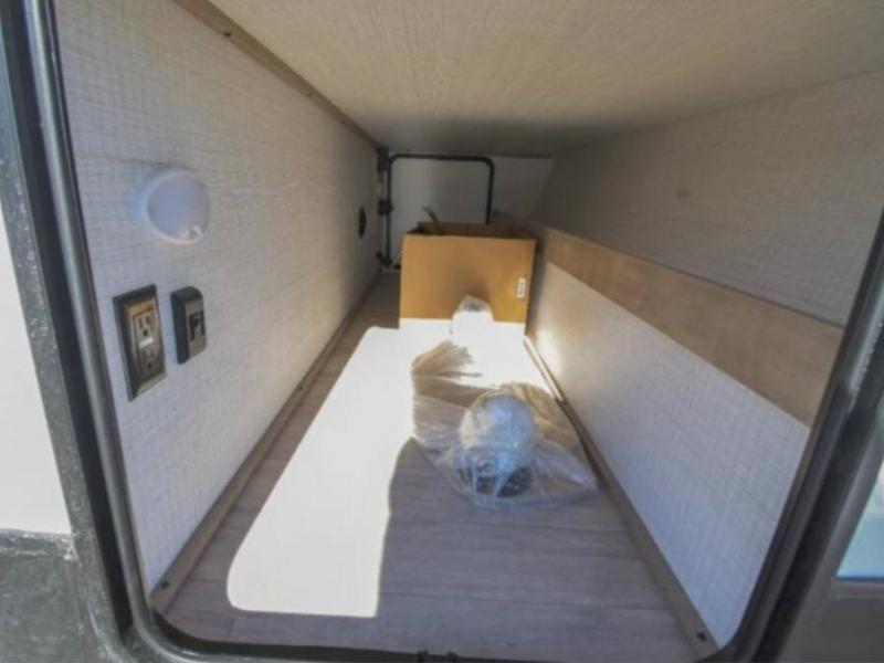 This trailer allows you to camp in comfort at your favorite RV sites thanks to the slide out sofa, and the front queen Murphy bed to sleep on with dual wardrobes to store your clothing! When the bed is put away, you can relax on the jack-knife sofa with storage below for extra blankets or board games. The galley kitchen includes amenities such as a microwave and cooktop to cook meals, plus an 11 cu. ft. electric refrigerator and pantry for food storage. The rear corner full bath offers a space-savings radius shower and linen storage, and there is an entry closet to keep the main area tidy.