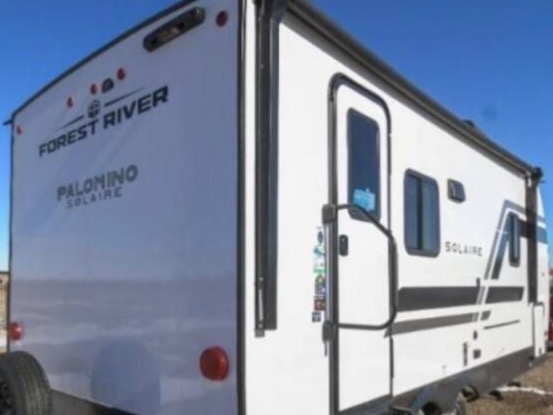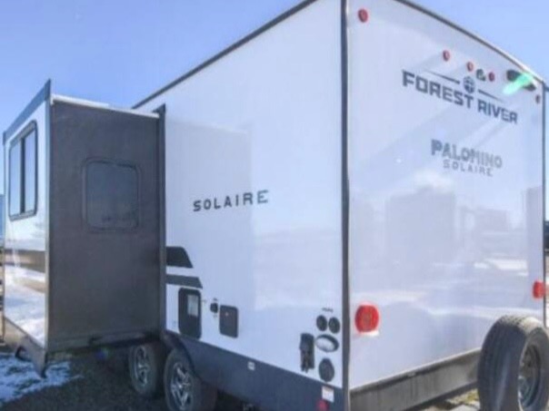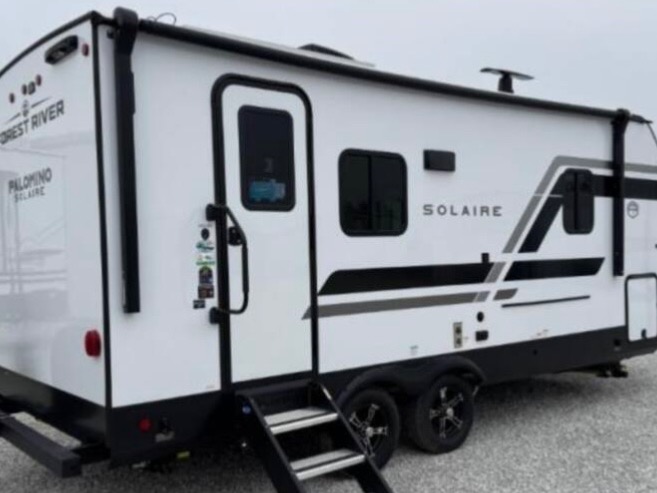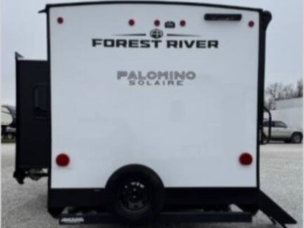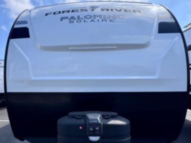 Each SolAire travel trailer by Palomino features a white gel coat exterior and an aluminum superstructure frame for lightweight towing. You will love having a power tongue jack for easy set up, plus slam latch baggage doors with magnets to make unloading easier than ever. There is also a power awning with LED lights and aluminum wheels included on the exterior. Each SolAire is constructed to last with Azdel composite, a fully laminated rear wall and roof, plus a fully enclosed and heated underbelly. The interior includes roller shades and kitchen backsplash, USB ports to keep your electronics charged, a Bluetooth stereo with speakers, and many more stand-out features!