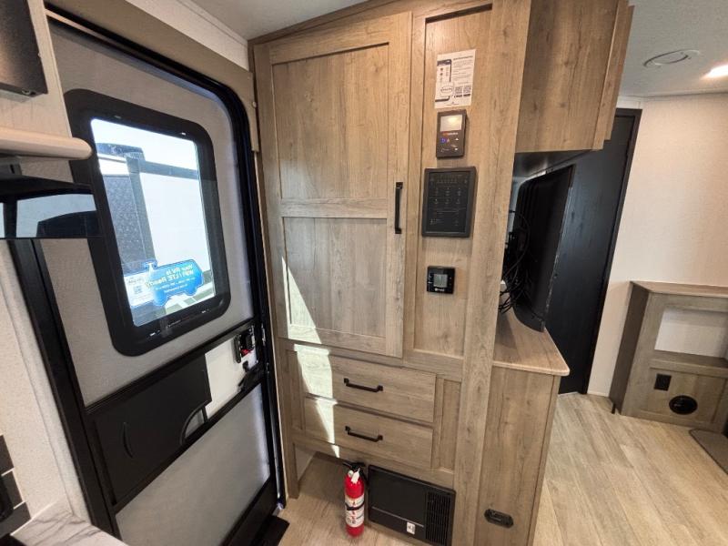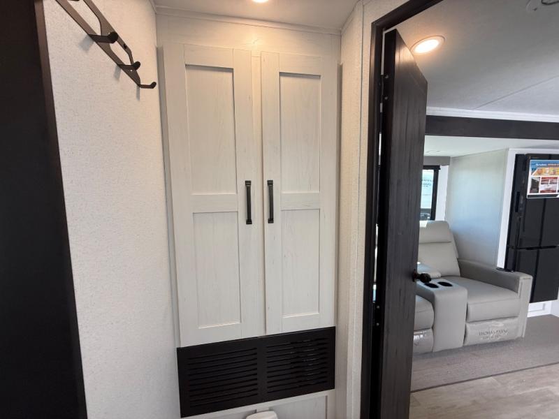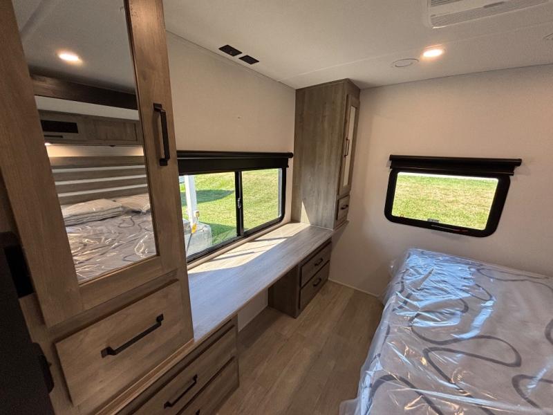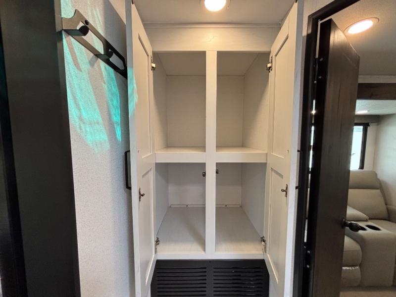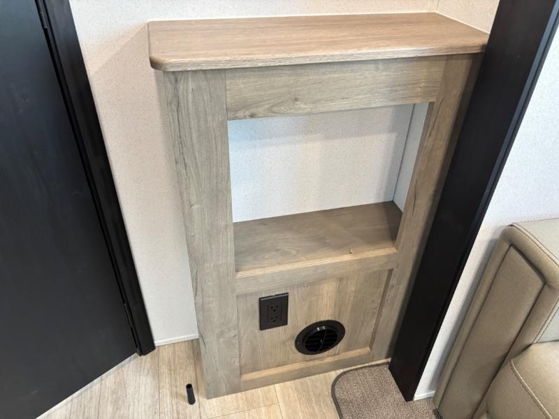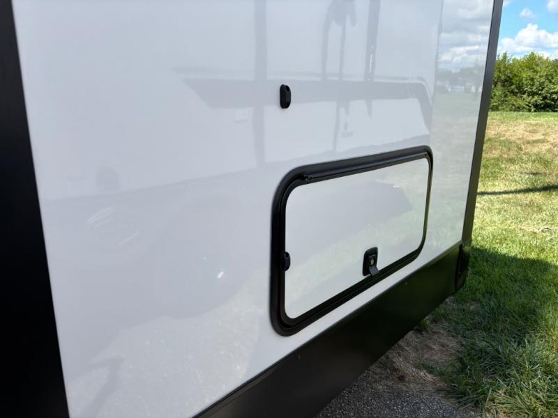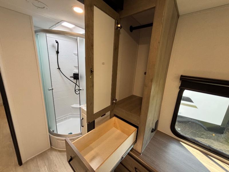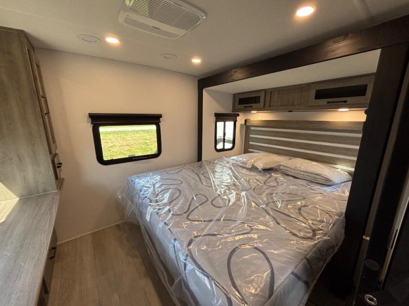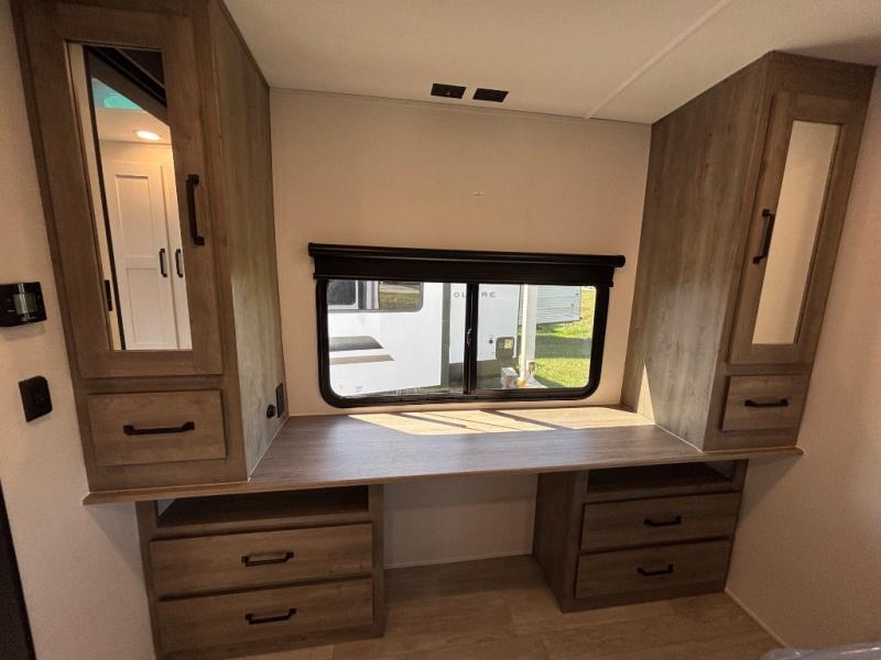 This dual slide out travel trailer will provide at-home comforts while you're at the campground. You will love the rear master bedroom with a king bed slide out and a dual wardrobes for your clothes, plus a desk with drawers to get work done. And the walk-thru bath will be easily accessible. The main living area is spacious with its theater seat slide, plus a front kitchen with ample counter space. There is also a pantry, entryway closet, plus outside storage for your camping gear and belongings.