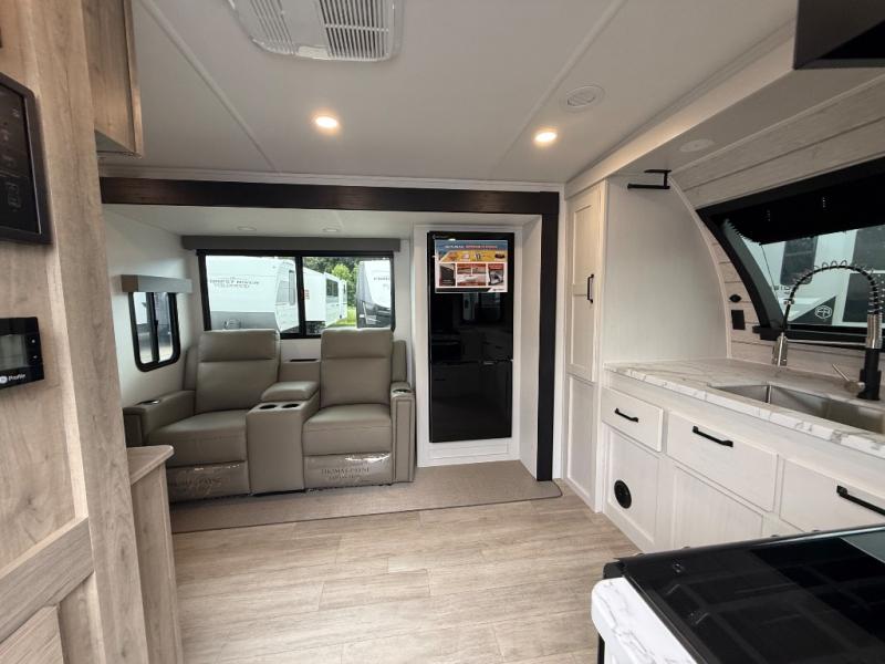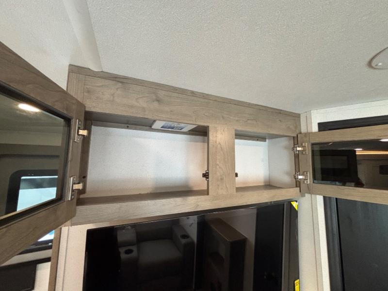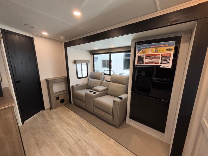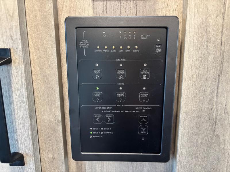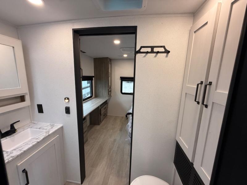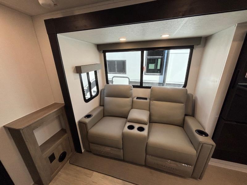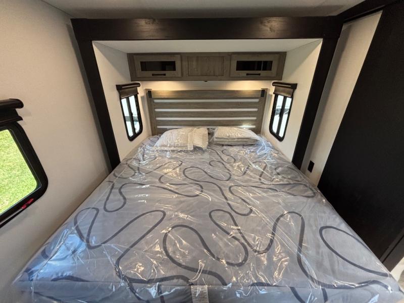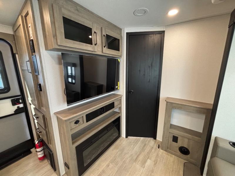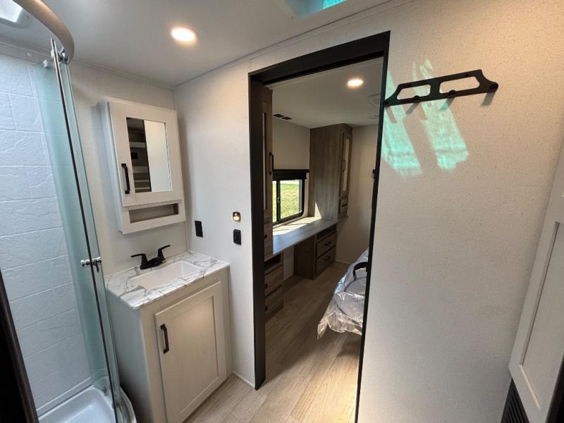This dual slide out travel trailer will provide at-home comforts while you're at the campground. You will love the rear master bedroom with a king bed slide out and a dual wardrobes for your clothes, plus a desk with drawers to get work done. And the walk-thru bath will be easily accessible. The main living area is spacious with its theater seat slide, plus a front kitchen with ample counter space. There is also a pantry, entryway closet, plus outside storage for your camping gear and belongings.