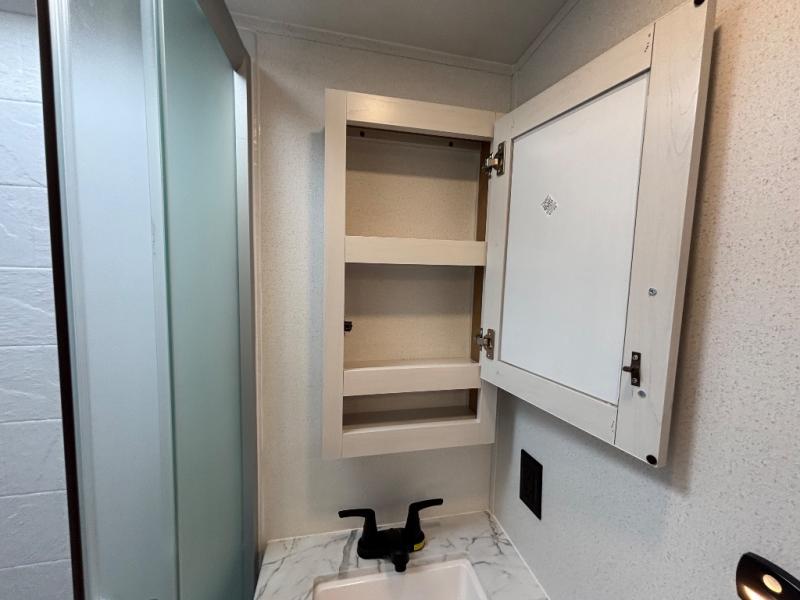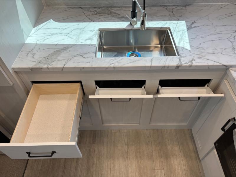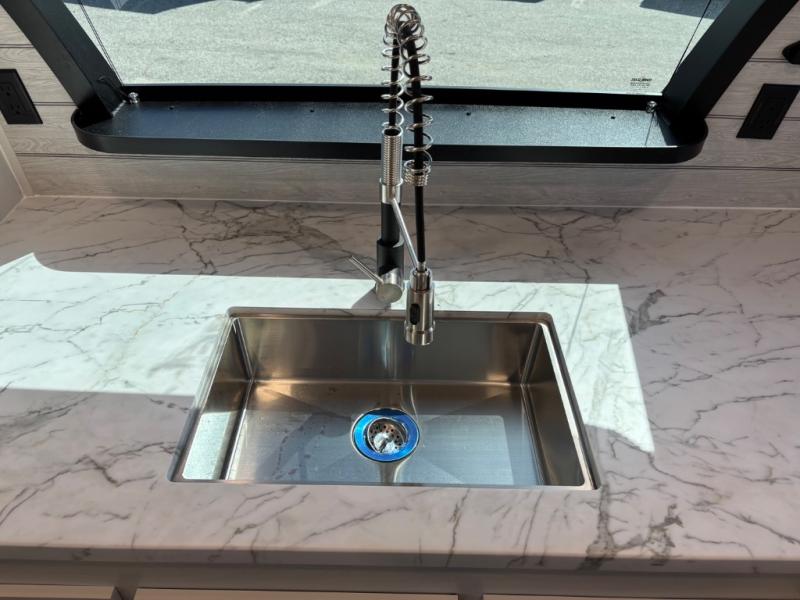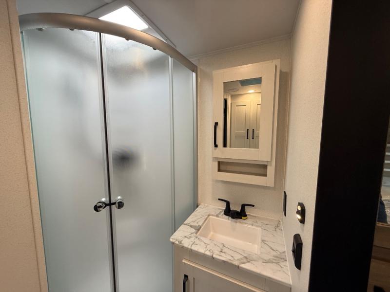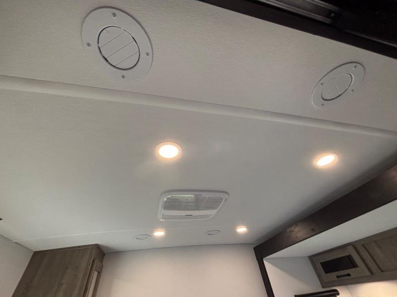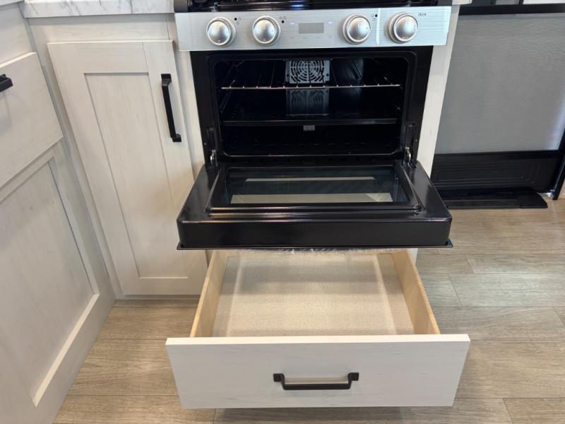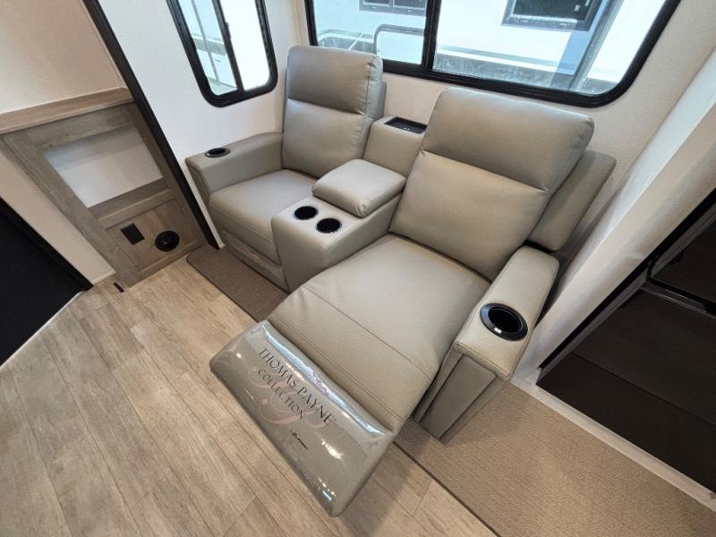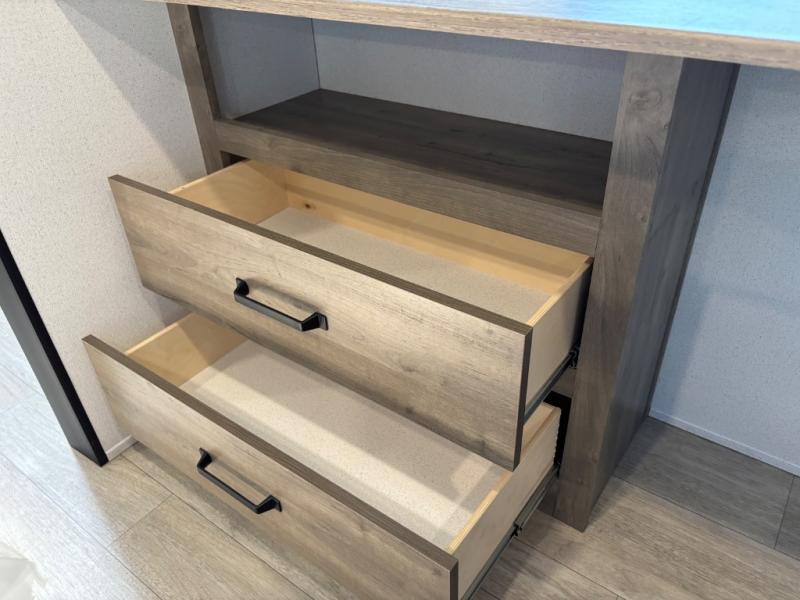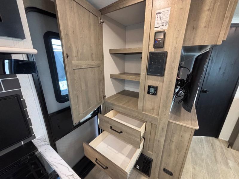 This dual slide out travel trailer will provide at-home comforts while you're at the campground. You will love the rear master bedroom with a king bed slide out and a dual wardrobes for your clothes, plus a desk with drawers to get work done. And the walk-thru bath will be easily accessible. The main living area is spacious with its theater seat slide, plus a front kitchen with ample counter space. There is also a pantry, entryway closet, plus outside storage for your camping gear and belongings.