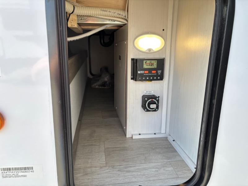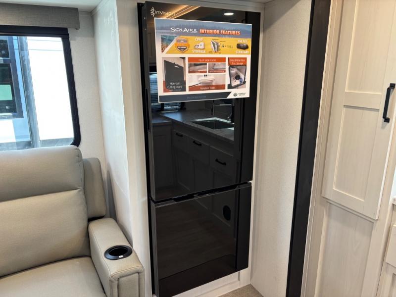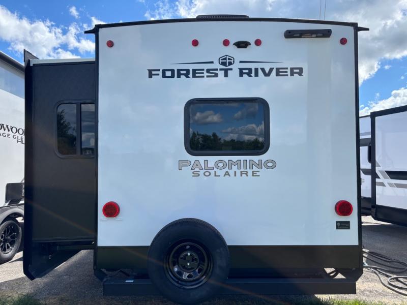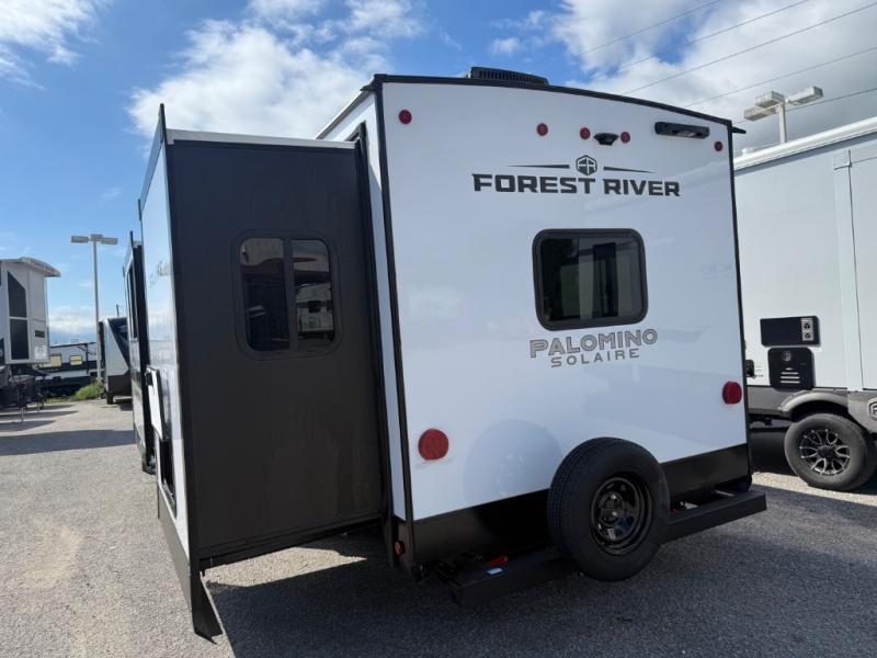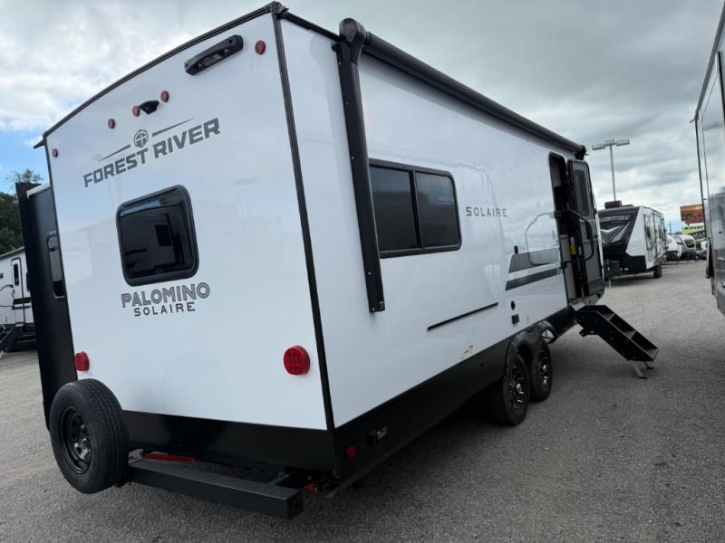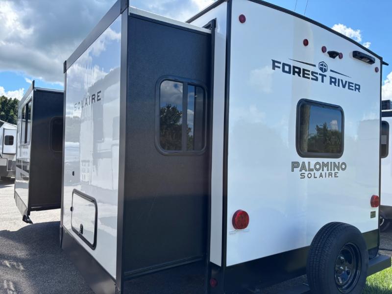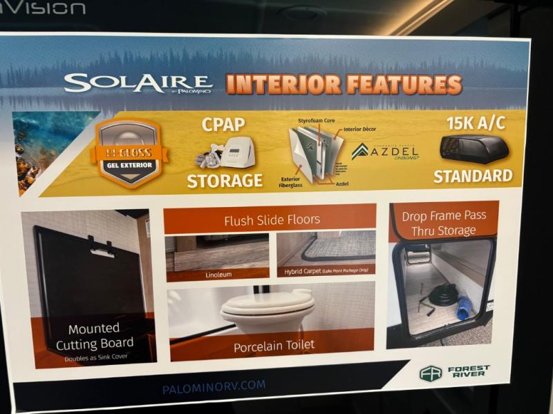 Each SolAire travel trailer by Palomino features a white gel coat exterior and an aluminum superstructure frame for lightweight towing. You will love having a power tongue jack for easy set up, plus slam latch baggage doors with magnets to make unloading easier than ever. There is also a power awning with LED lights and aluminum wheels included on the exterior. Each SolAire is constructed to last with Azdel composite, a fully laminated rear wall and roof, plus a fully enclosed and heated underbelly. The interior includes roller shades and kitchen backsplash, USB ports to keep your electronics charged, a Bluetooth stereo with speakers, and many more stand-out features!