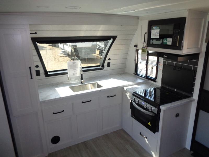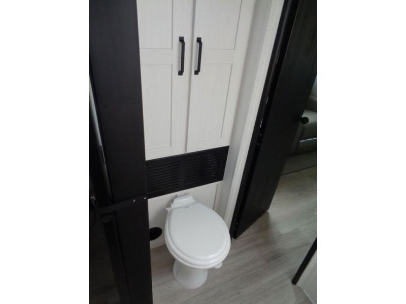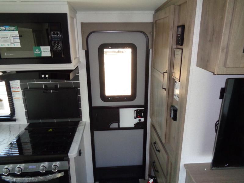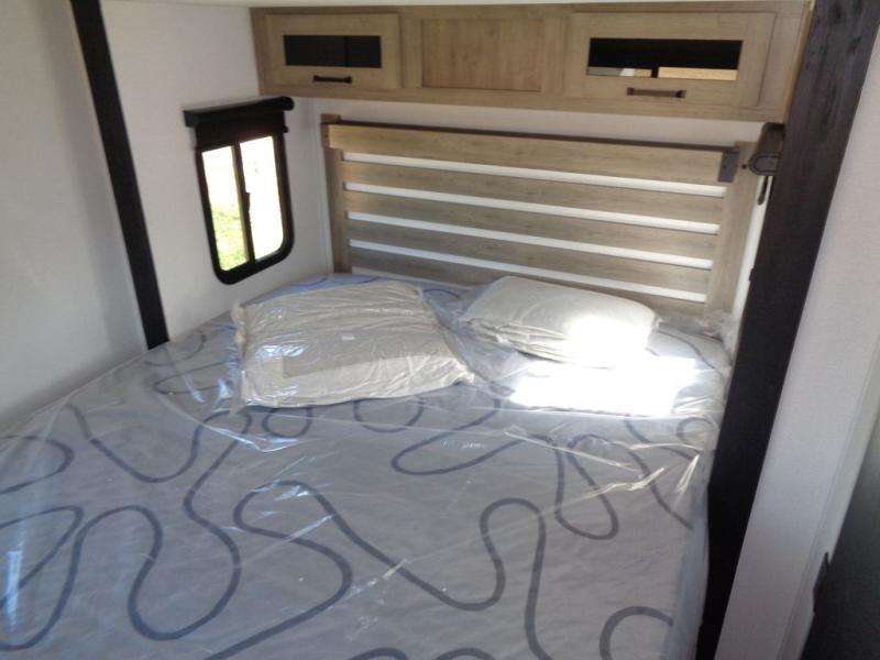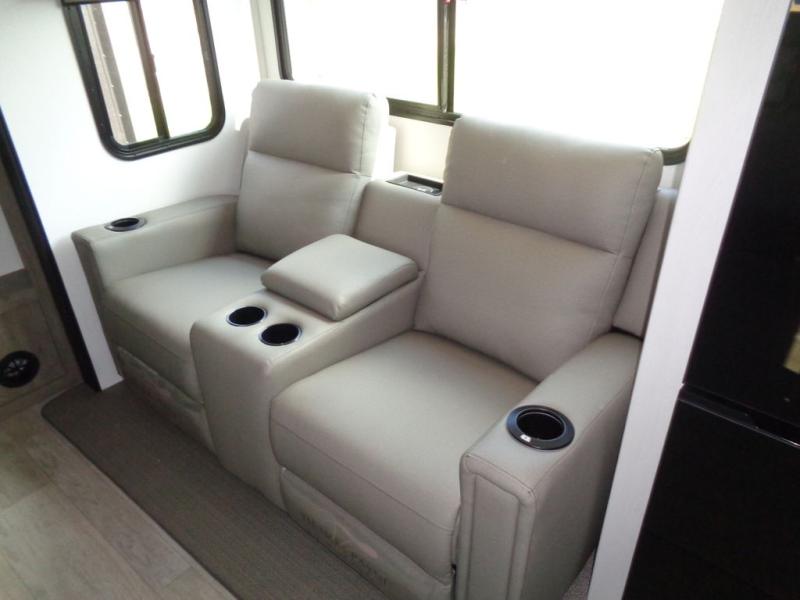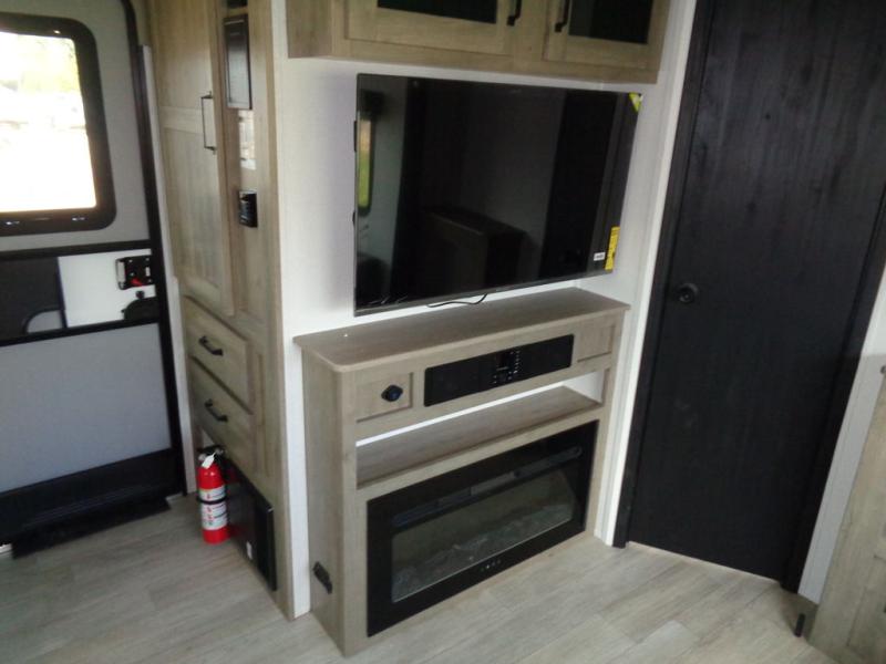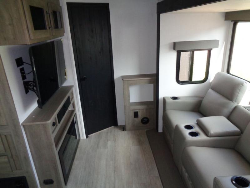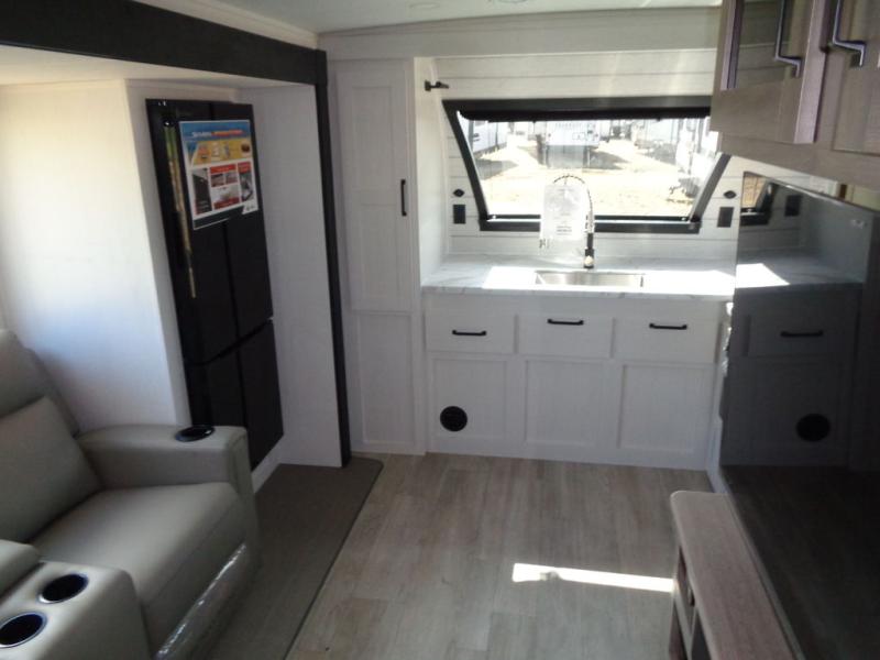 This dual slide out travel trailer will provide at-home comforts while you're at the campground. You will love the rear master bedroom with a king bed slide out and a dual wardrobes for your clothes, plus a desk with drawers to get work done. And the walk-thru bath will be easily accessible. The main living area is spacious with its theater seat slide, plus a front kitchen with ample counter space. There is also a pantry, entryway closet, plus outside storage for your camping gear and belongings.