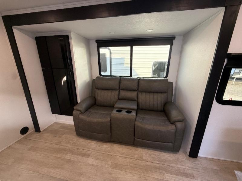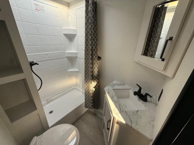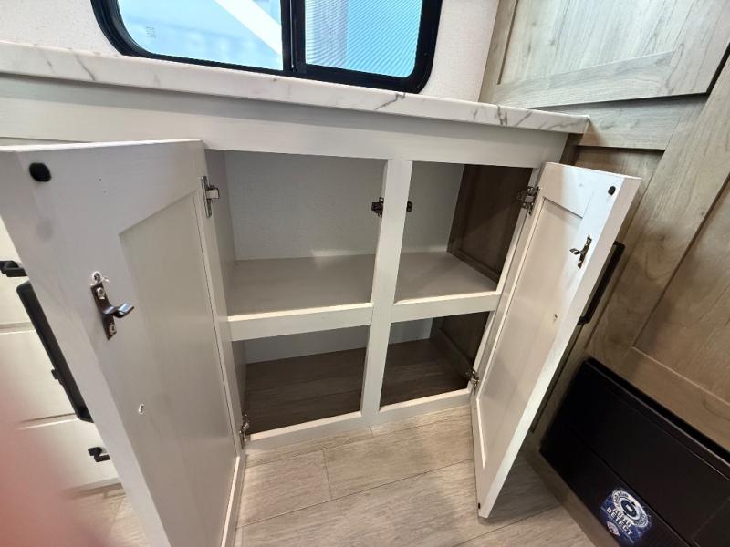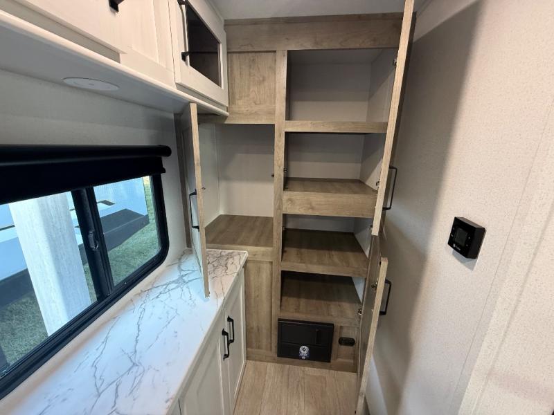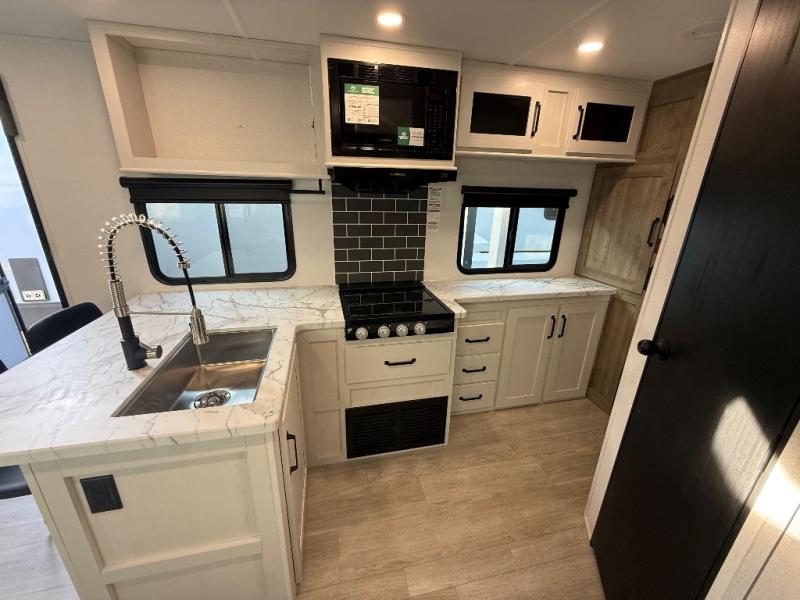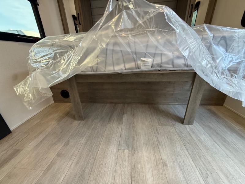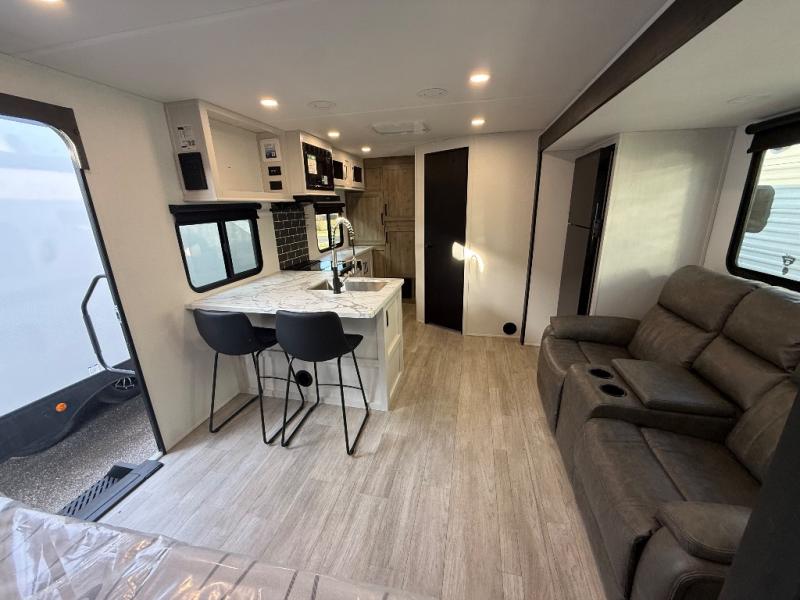 You'll love every minute spent in this travel trailer, whether at the lake or in the woods! Once you arrive at the campground, you can unload the pass-thru storage, then start lunch in the rear corner kitchen. There is a bar top with two seats where you can dine at, and an added booth dinette slide provides more seating space, as well as sleeping space for guests. You'll enjoy having the front RV queen bed to yourselves, and there are dual bedside wardrobes to keep your things tidy.