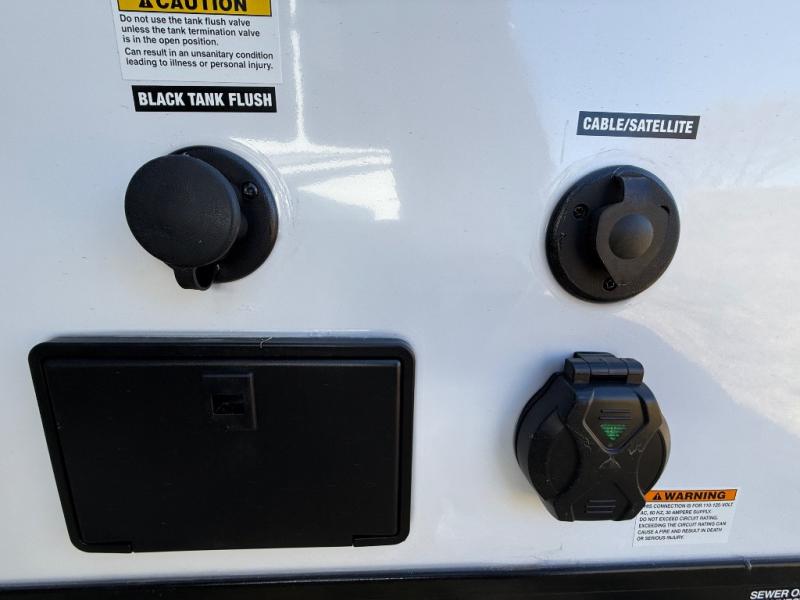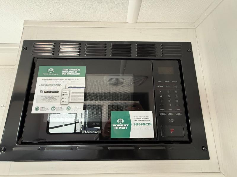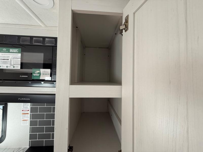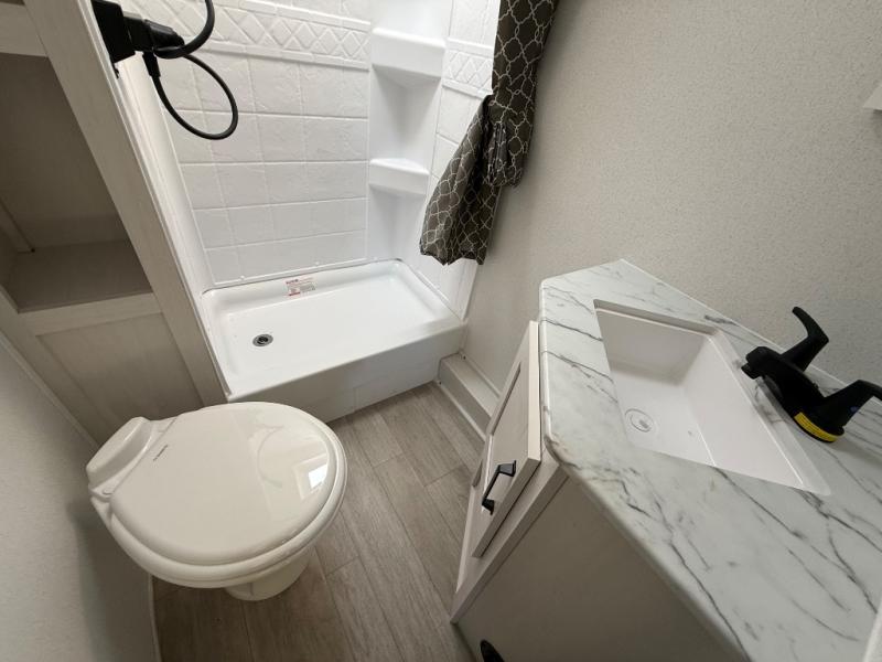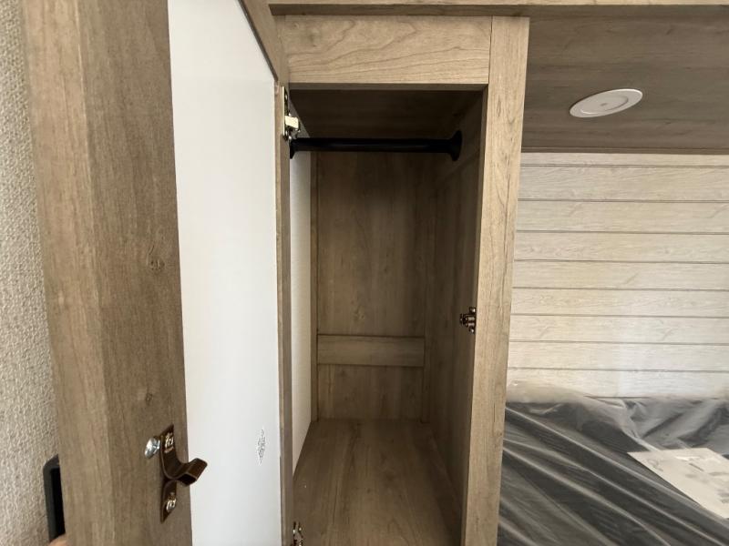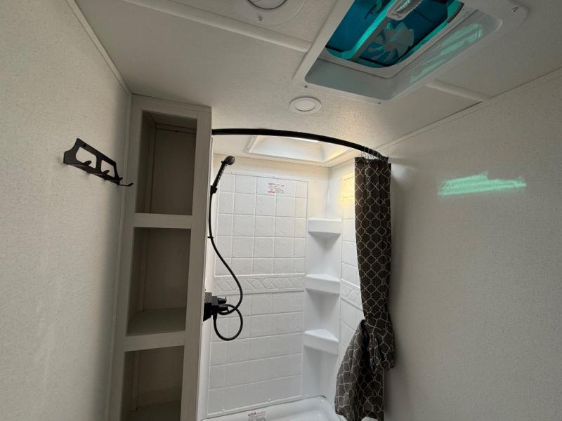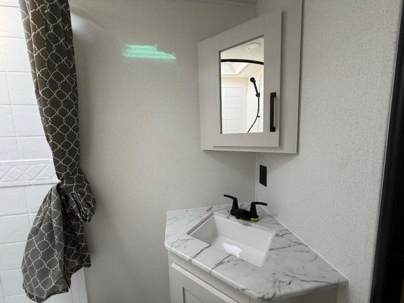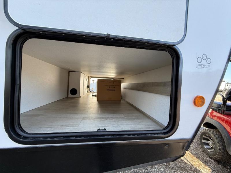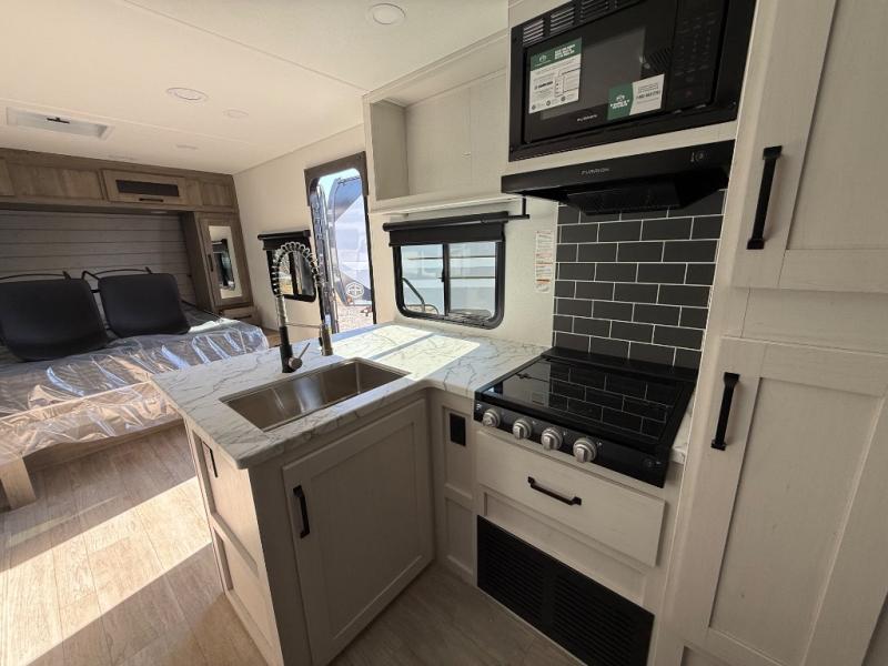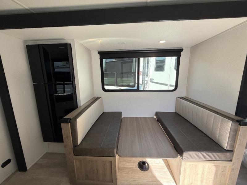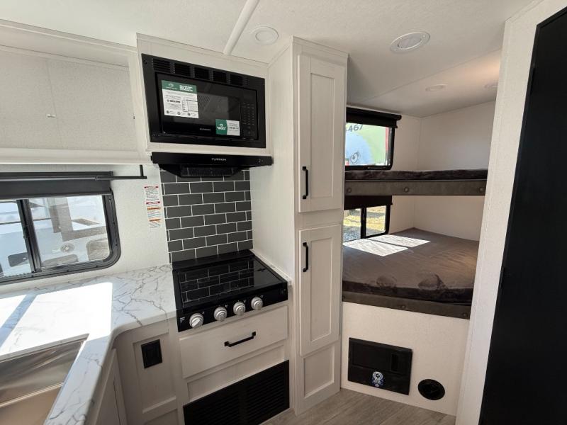 You'll love every minute spent in this travel trailer, whether at the lake or in the woods! Once you arrive at the campground, you can unload the pass-thru storage, then start lunch in the full kitchen inside. There is a bar top with two seats where you can dine at, and an added booth dinette slide provides more seating space, as well as sleeping space for guests. You'll enjoy having the front RV queen bed to yourselves, while your guests or little ones take the 45" x 68" convertible bunk beds!
