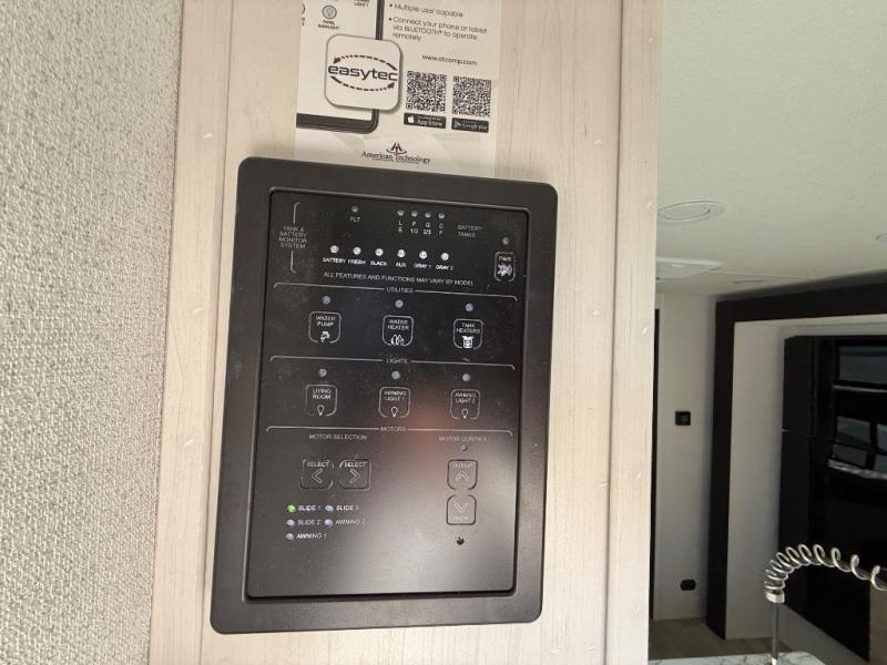 Each Solaire travel trailer by Forest River is constructed with a fully enclosed/heated underbelly for added protection against the elements, plus a fully laminated roof and rear wall for durability. The slam latch baggage doors with magnets will make it easier than ever to pack up your camp gear, and the power awning with LED lights will provide shade during the day and inviting ambiance at night. Head inside to enjoy the roller shades, smoked glass kitchen cabinet doors, stainless-steel sink, and LED lights to keep your space well lit. Some of the available options include a bedroom A/C, a Wi-Fi booster, heated holding tanks, and more!