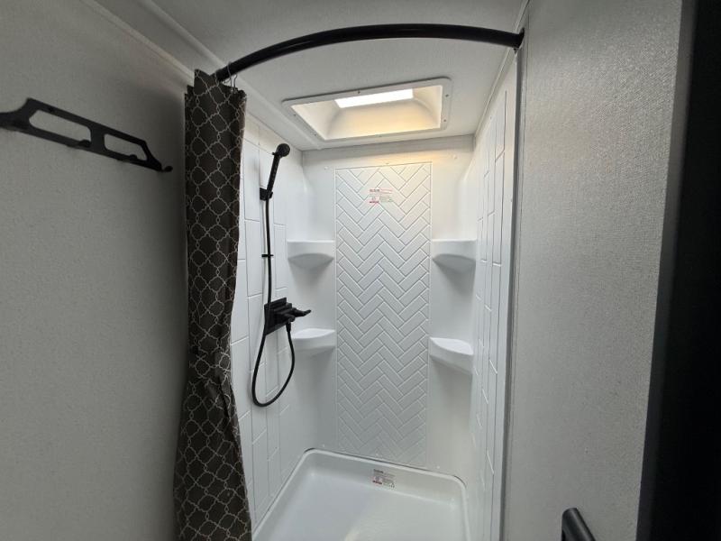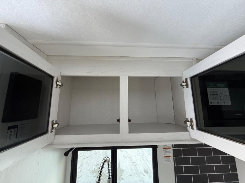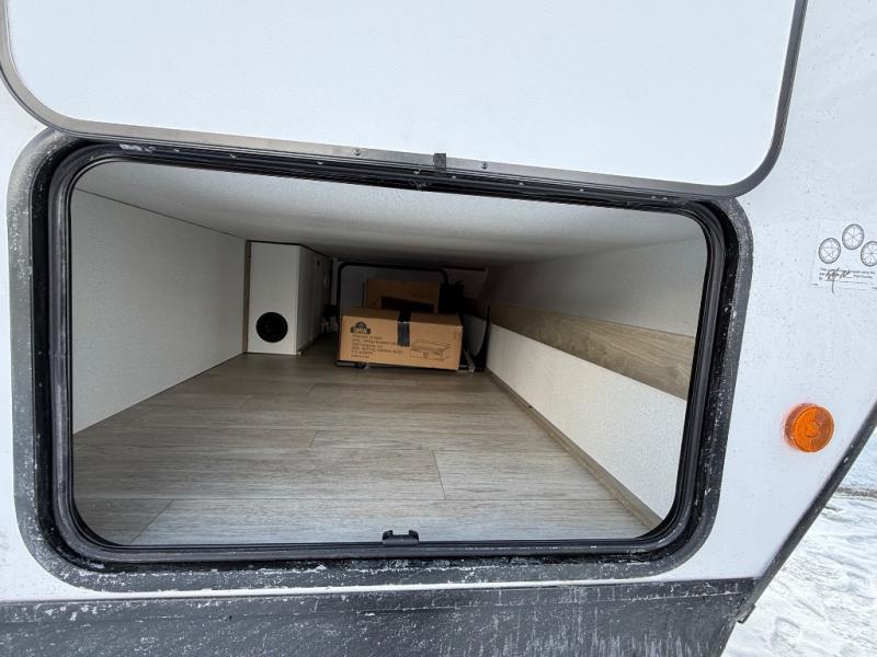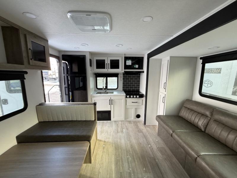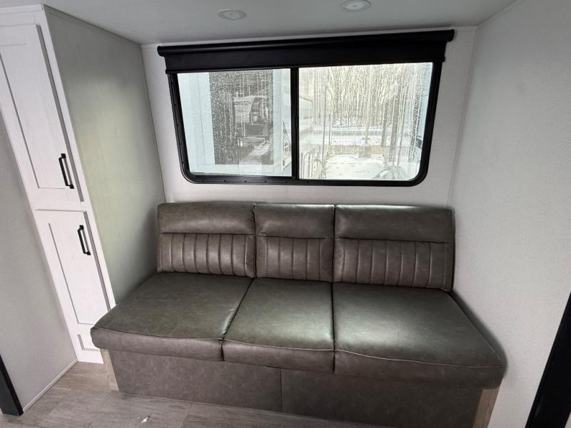 Enjoy time at the campground in this rear kitchen travel trailer. You'll find a cooktop and microwave here, along with a pantry and 11-cu. ft. electric refrigerator to keep your food fresh. There is a booth dinette to dine at plus a sofa sleeper slide out for more seating and sleeping space for guests. The walk-thru bath leads to the front master bedroom where you'll enjoy a 60" x 74" RV queen bed and dual bedside wardrobes to keep your things tidy. Outside, more storage space is found in the pass-thru, and there is a 17' power awning with LED lights where you can visit with friends!