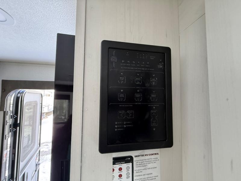 Each Solaire travel trailer by Forest River is constructed with a fully enclosed/heated underbelly for added protection against the elements, plus a fully laminated roof and rear wall for durability. The slam latch baggage doors with magnets will make it easier than ever to pack up your camp gear, and the power awning with LED lights will provide shade during the day and inviting ambiance at night. Head inside to enjoy the roller shades, smoked glass kitchen cabinet doors, stainless-steel sink, and LED lights to keep your space well lit. Some of the available options include a bedroom A/C, a Wi-Fi booster, heated holding tanks, and more!