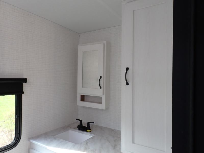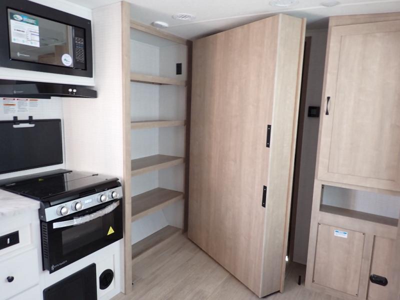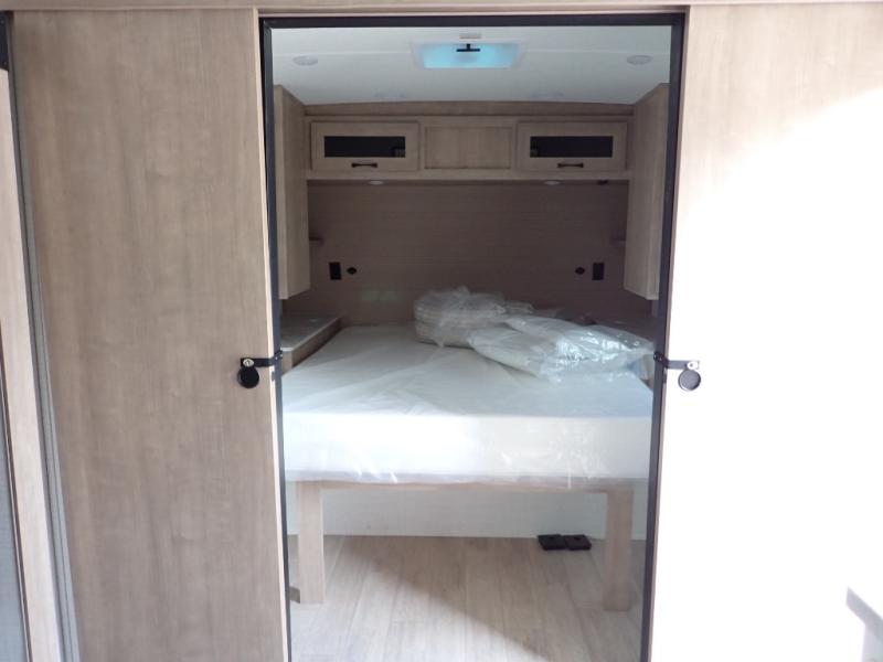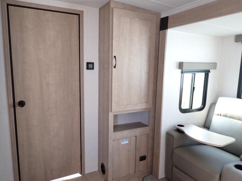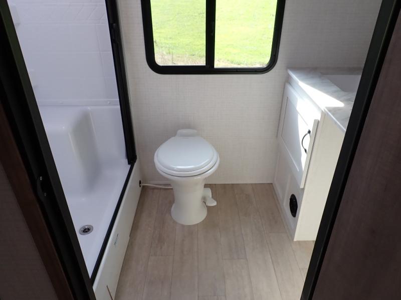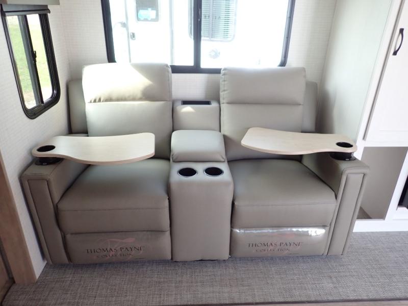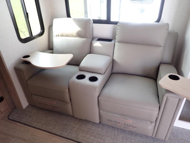 This couple's trailer is perfect for weekend trips to the campground. You can relax inside on the theater seats that are within a large slide out, and there is a hidden pantry behind the entertainment center to keep snacks stocked. The full rear bathroom gives you the space you need as well as a shower with a seat plus washer and dryer prep. And the front bedroom provides a queen bed, dual wardrobes and privacy.