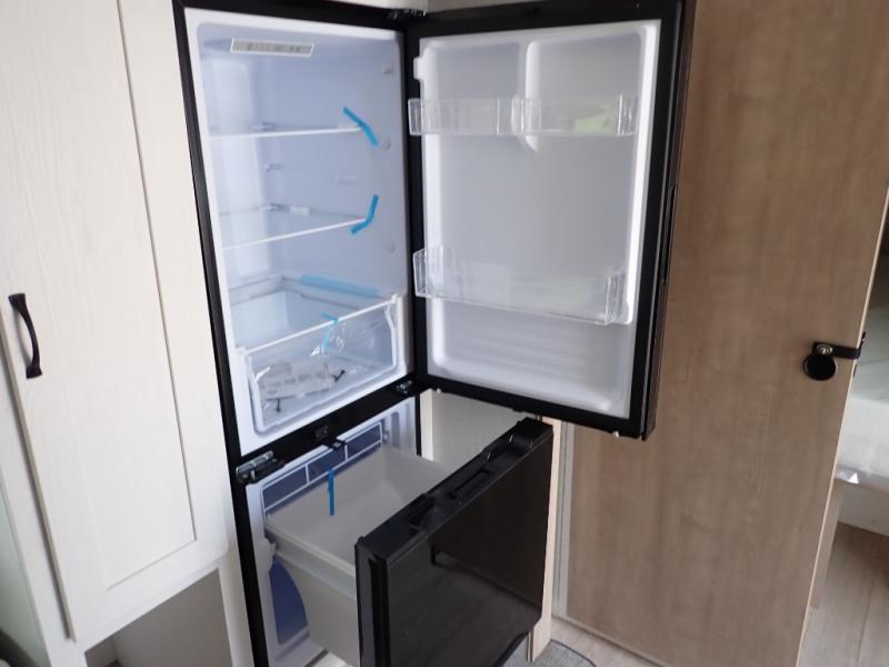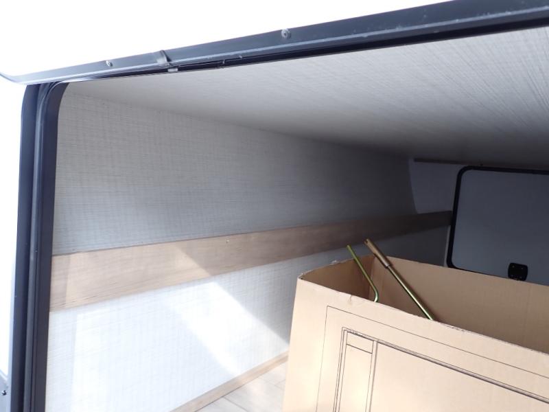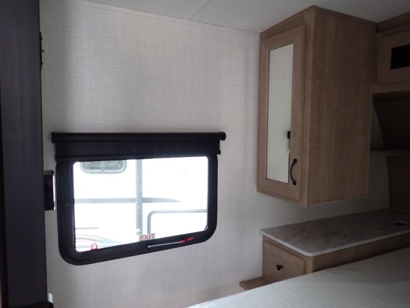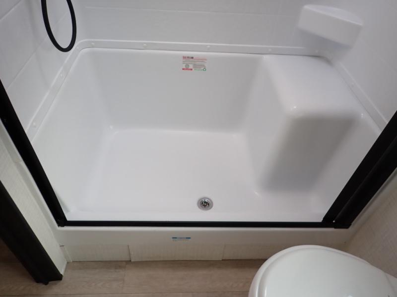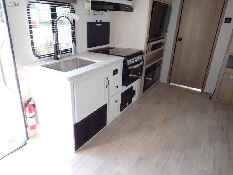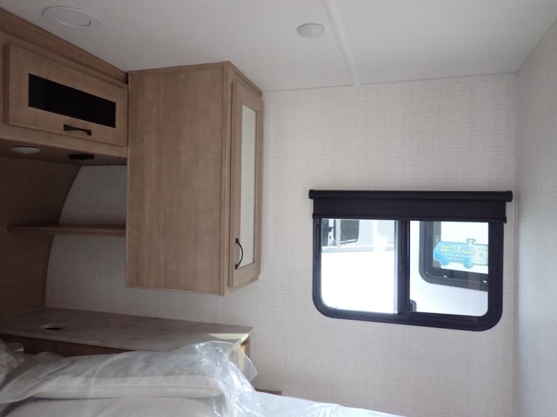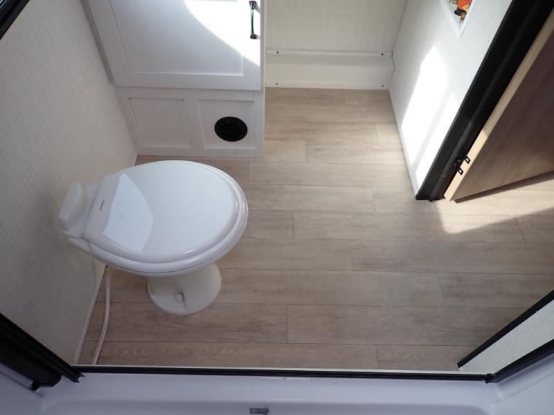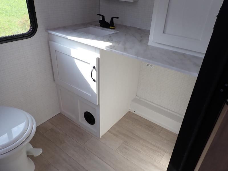 This couple's trailer is perfect for weekend trips to the campground. You can relax inside on the theater seats that are within a large slide out, and there is a hidden pantry behind the entertainment center to keep snacks stocked. The full rear bathroom gives you the space you need as well as a shower with a seat plus washer and dryer prep. And the front bedroom provides a queen bed, dual wardrobes and privacy.