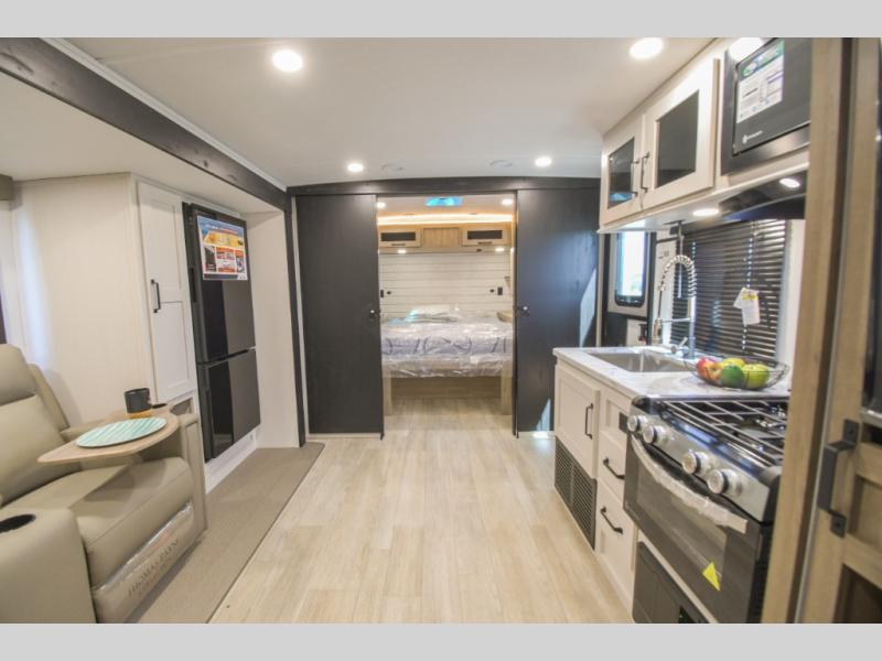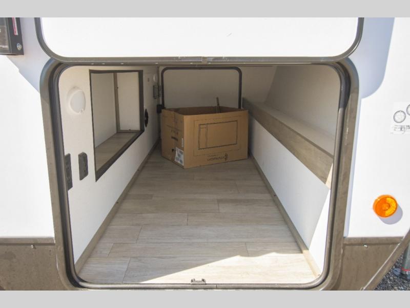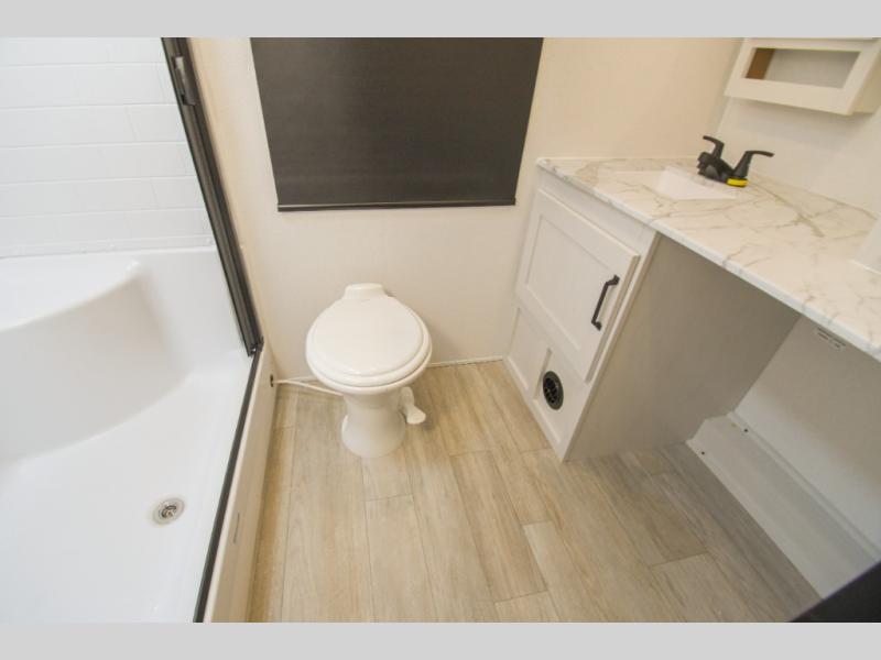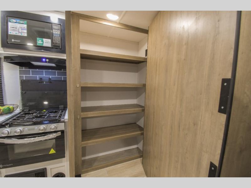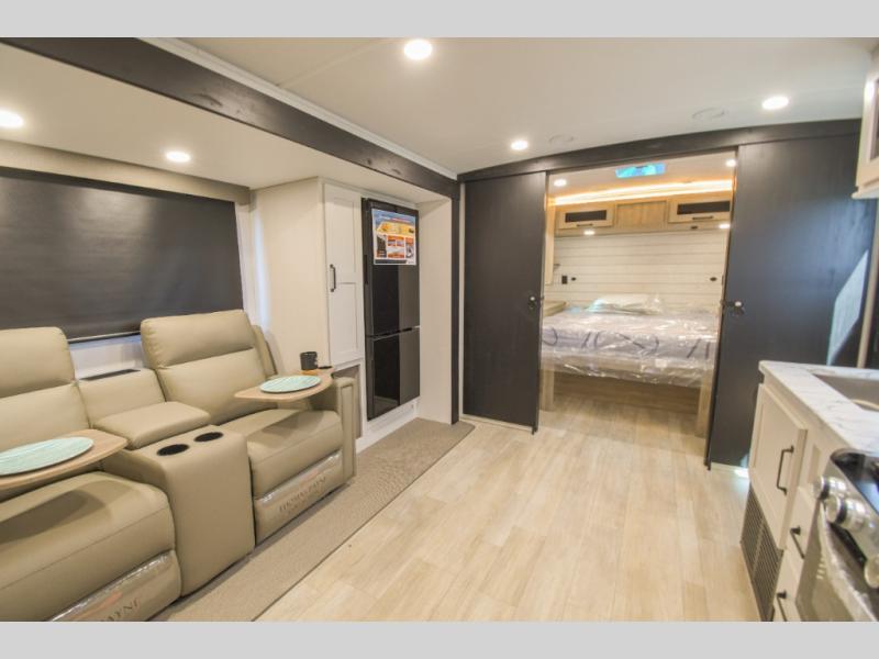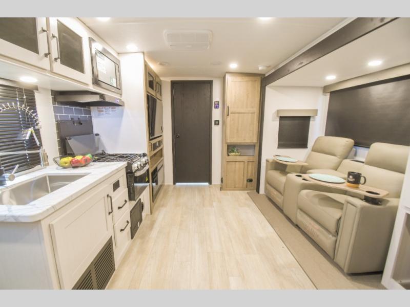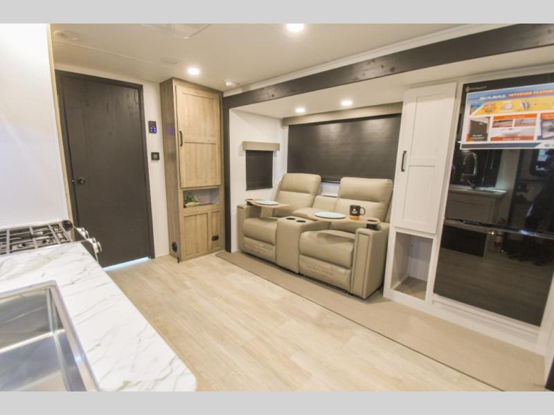 This couple's trailer is perfect for weekend trips to the campground. You can relax inside on the theater seats that are within a large slide out, and there is a hidden pantry behind the entertainment center to keep snacks stocked. The full rear bathroom gives you the space you need as well as a shower with a seat plus washer and dryer prep. And the front bedroom provides a queen bed, dual wardrobes and privacy.