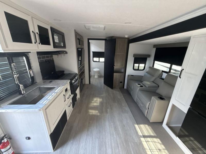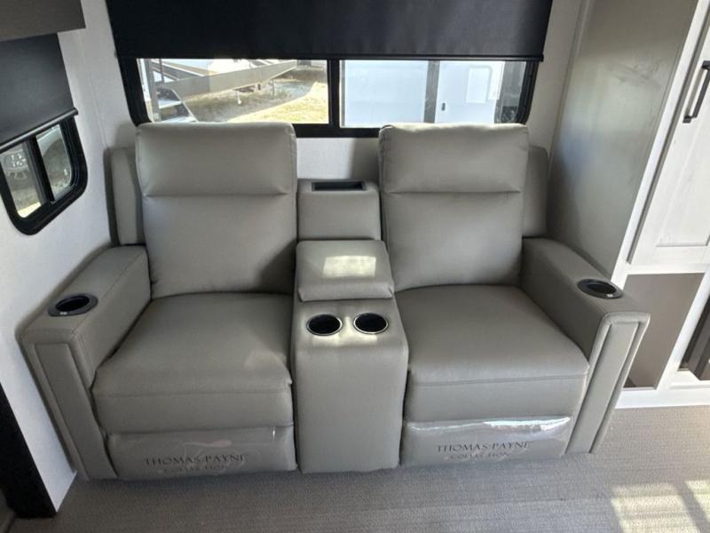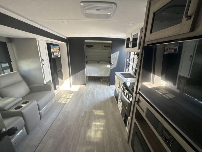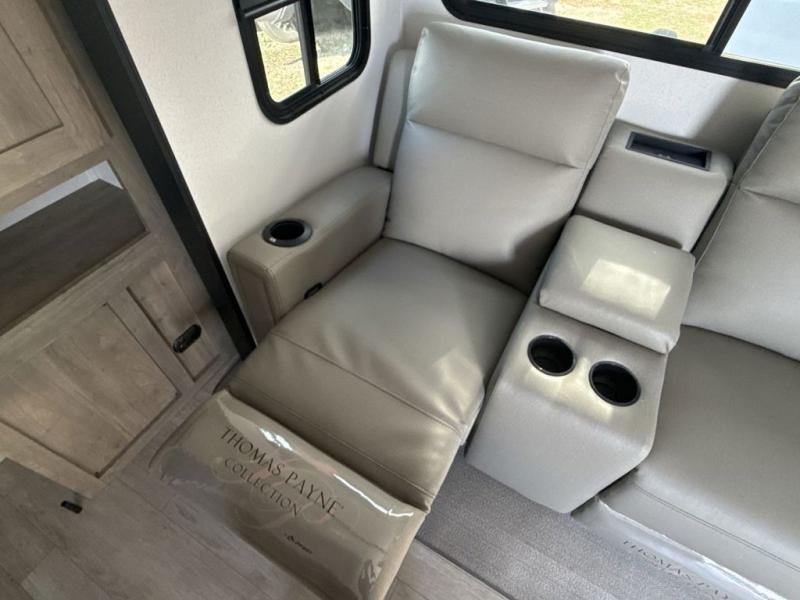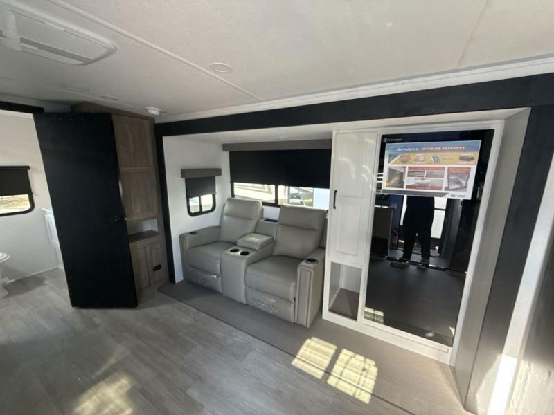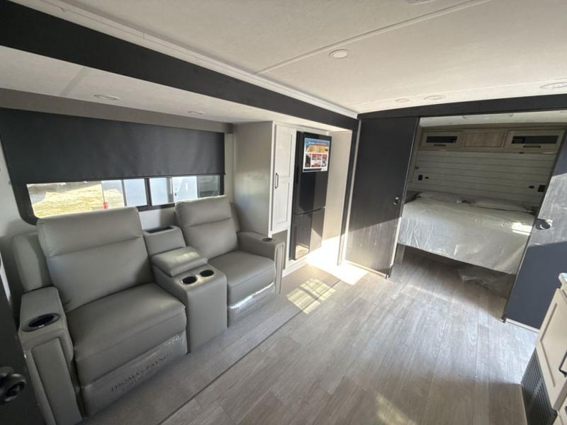 This couple's trailer is perfect for weekend trips to the campground. You can relax inside on the theater seats that are within a large slide out, and there is a hidden pantry behind the entertainment center to keep snacks stocked. The full rear bathroom gives you the space you need as well as a shower with a seat plus washer and dryer prep. And the front bedroom provides a queen bed, dual wardrobes and privacy.