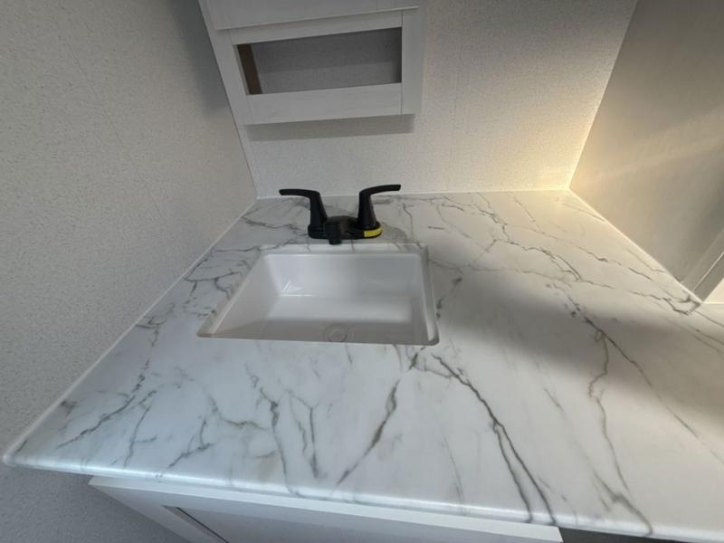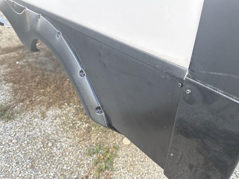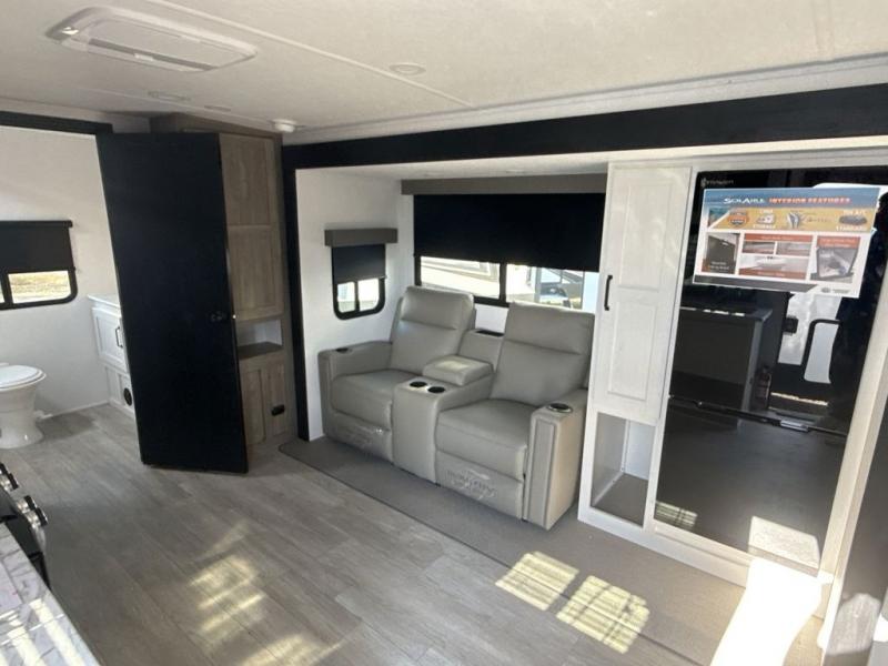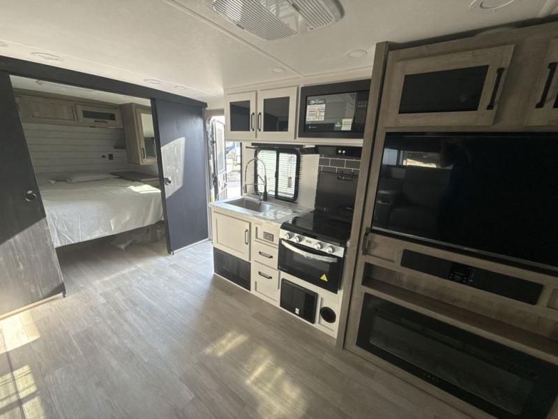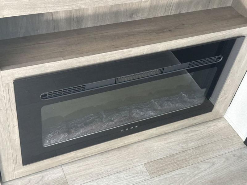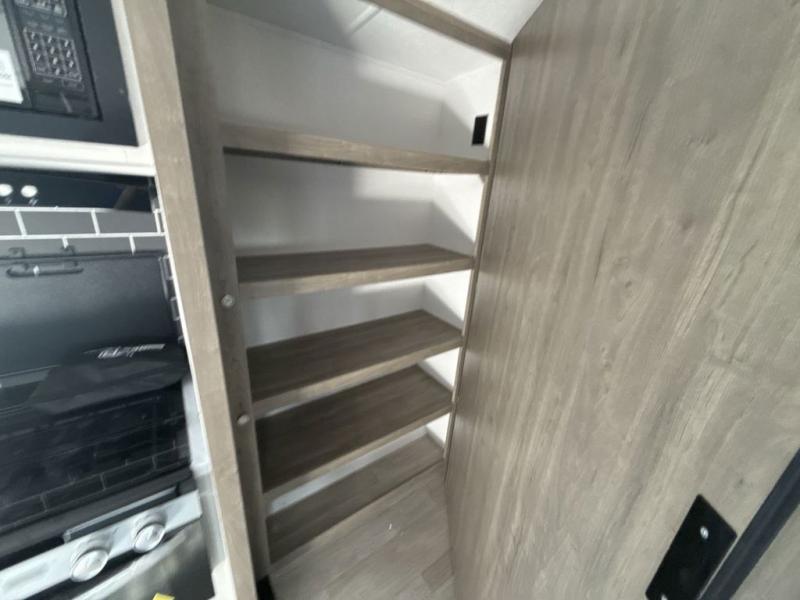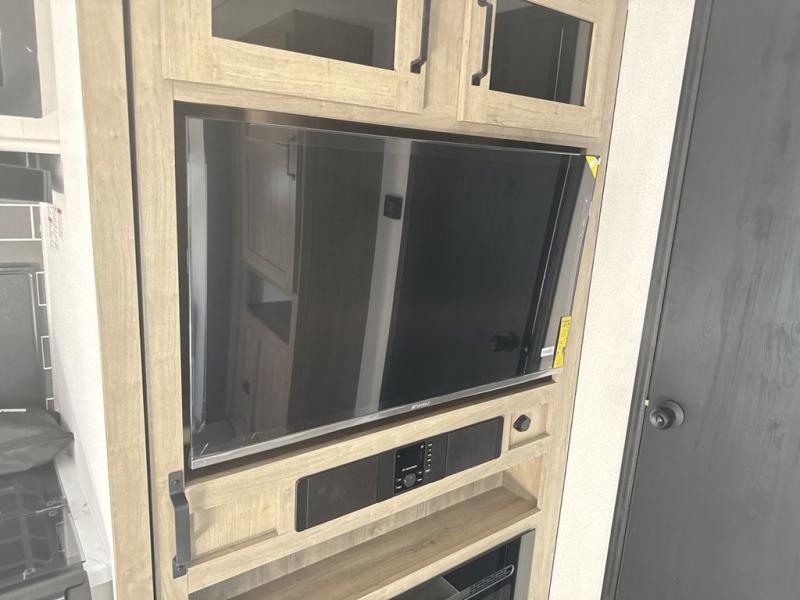 This couple's trailer is perfect for weekend trips to the campground. You can relax inside on the theater seats that are within a large slide out, and there is a hidden pantry behind the entertainment center to keep snacks stocked. The full rear bathroom gives you the space you need as well as a shower with a seat plus washer and dryer prep. And the front bedroom provides a queen bed, dual wardrobes and privacy.