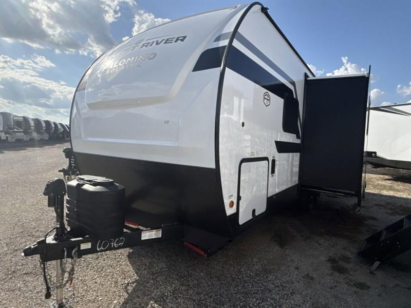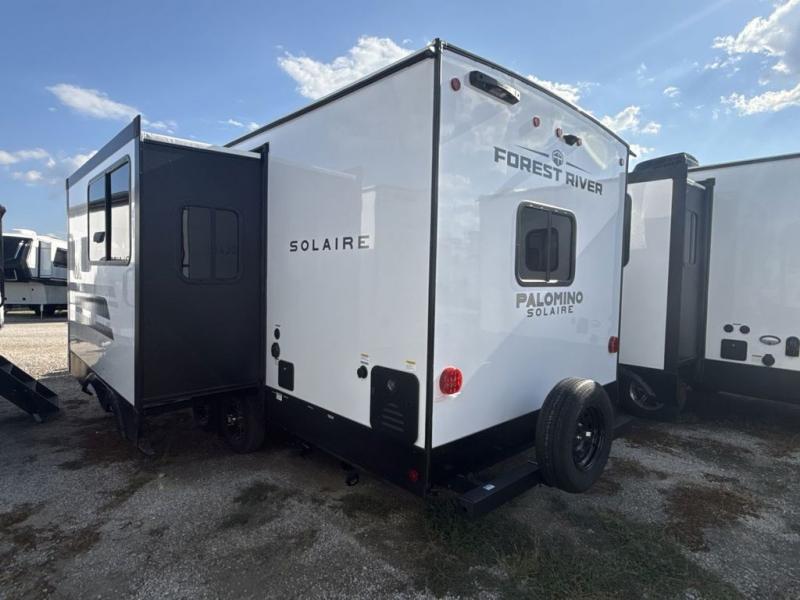 Each SolAire travel trailer by Palomino features a white gel coat exterior and an aluminum superstructure frame for lightweight towing. You will love having a power tongue jack for easy set up, plus slam latch baggage doors with magnets to make unloading easier than ever. There is also a power awning with LED lights and aluminum wheels included on the exterior. Each SolAire is constructed to last with Azdel composite, a fully laminated rear wall and roof, plus a fully enclosed and heated underbelly. The interior includes roller shades and kitchen backsplash, USB ports to keep your electronics charged, a Bluetooth stereo with speakers, and many more stand-out features!