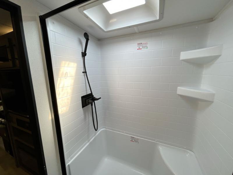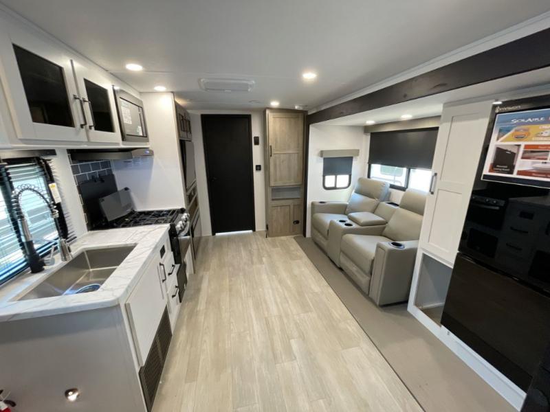 This couple's trailer is perfect for weekend trips to the campground. You can relax inside on the theater seats that are within a large slide out, and there is a hidden pantry behind the entertainment center to keep snacks stocked. The full rear bathroom gives you the space you need as well as a shower with a seat plus washer and dryer prep. And the front bedroom provides a queen bed, dual wardrobes and privacy.