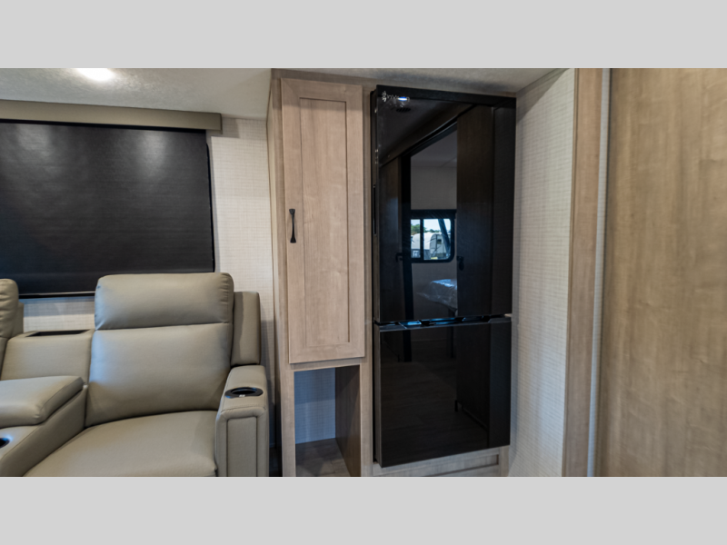 A: The Solaire 2420RBS delivers theater seating in a slide, rear bath, queen bedroom, hidden pantry, and drop-frame pass-through—all in just 27' 11" and 5,328 lb dry.