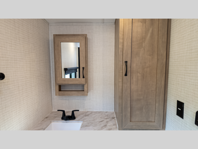 - Layout: Front queen bed, theater seating in slide; rear walk-through bath