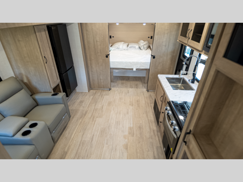 Couples’ comfort: theater seating, queen bed, and hidden pantry—all packed into a lightweight 28' trailer