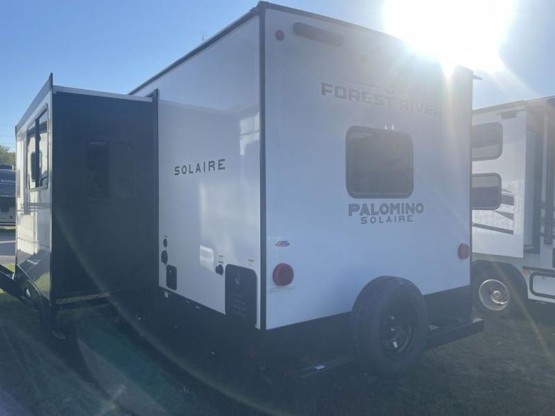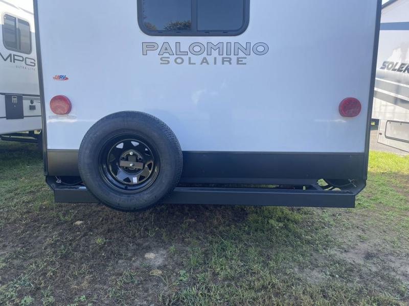 Each SolAire travel trailer by Palomino features a white gel coat exterior and an aluminum superstructure frame for lightweight towing. You will love having a power tongue jack for easy set up, plus slam latch baggage doors with magnets to make unloading easier than ever. There is also a power awning with LED lights and aluminum wheels included on the exterior. Each SolAire is constructed to last with Azdel composite, a fully laminated rear wall and roof, plus a fully enclosed and heated underbelly. The interior includes roller shades and kitchen backsplash, USB ports to keep your electronics charged, a Bluetooth stereo with speakers, and many more stand-out features!