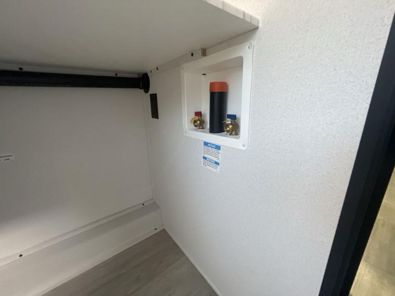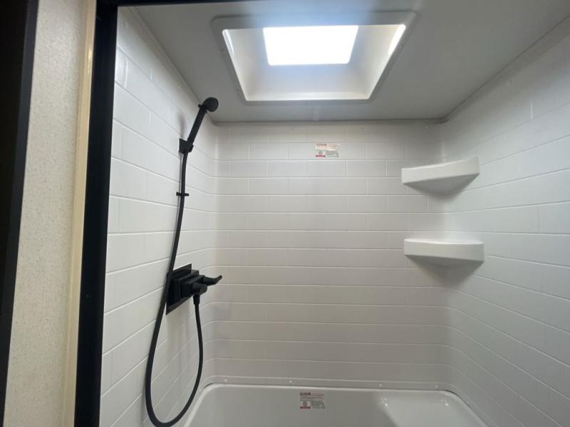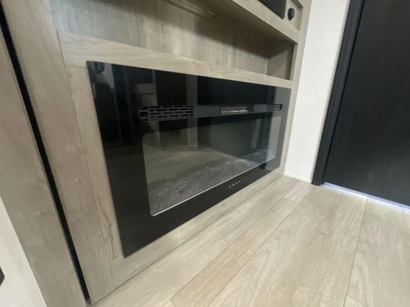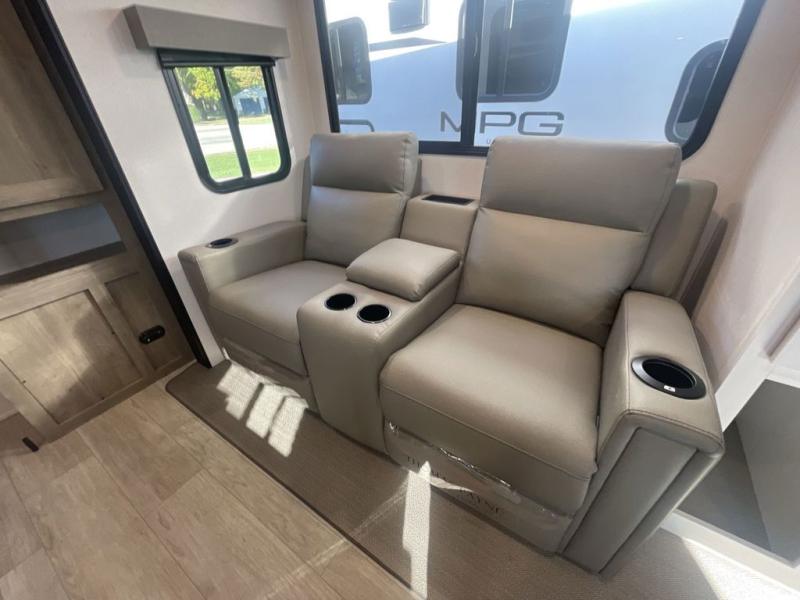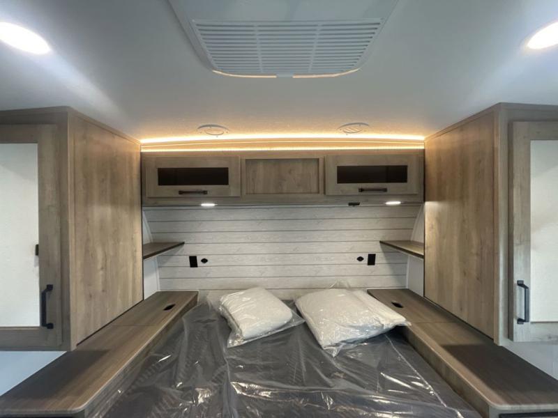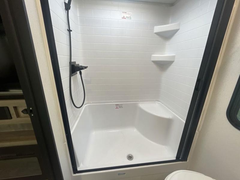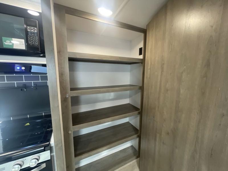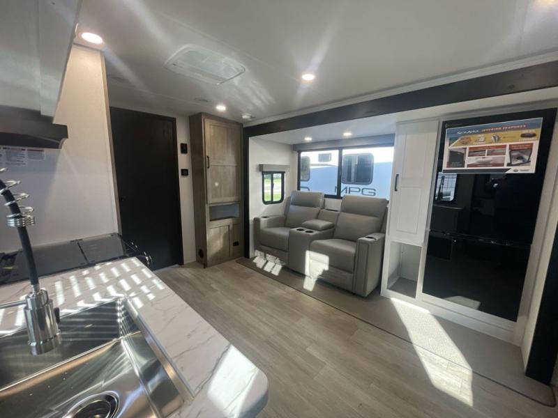 This couple's trailer is perfect for weekend trips to the campground. You can relax inside on the theater seats that are within a large slide out, and there is a hidden pantry behind the entertainment center to keep snacks stocked. The full rear bathroom gives you the space you need as well as a shower with a seat plus washer and dryer prep. And the front bedroom provides a queen bed, dual wardrobes and privacy.